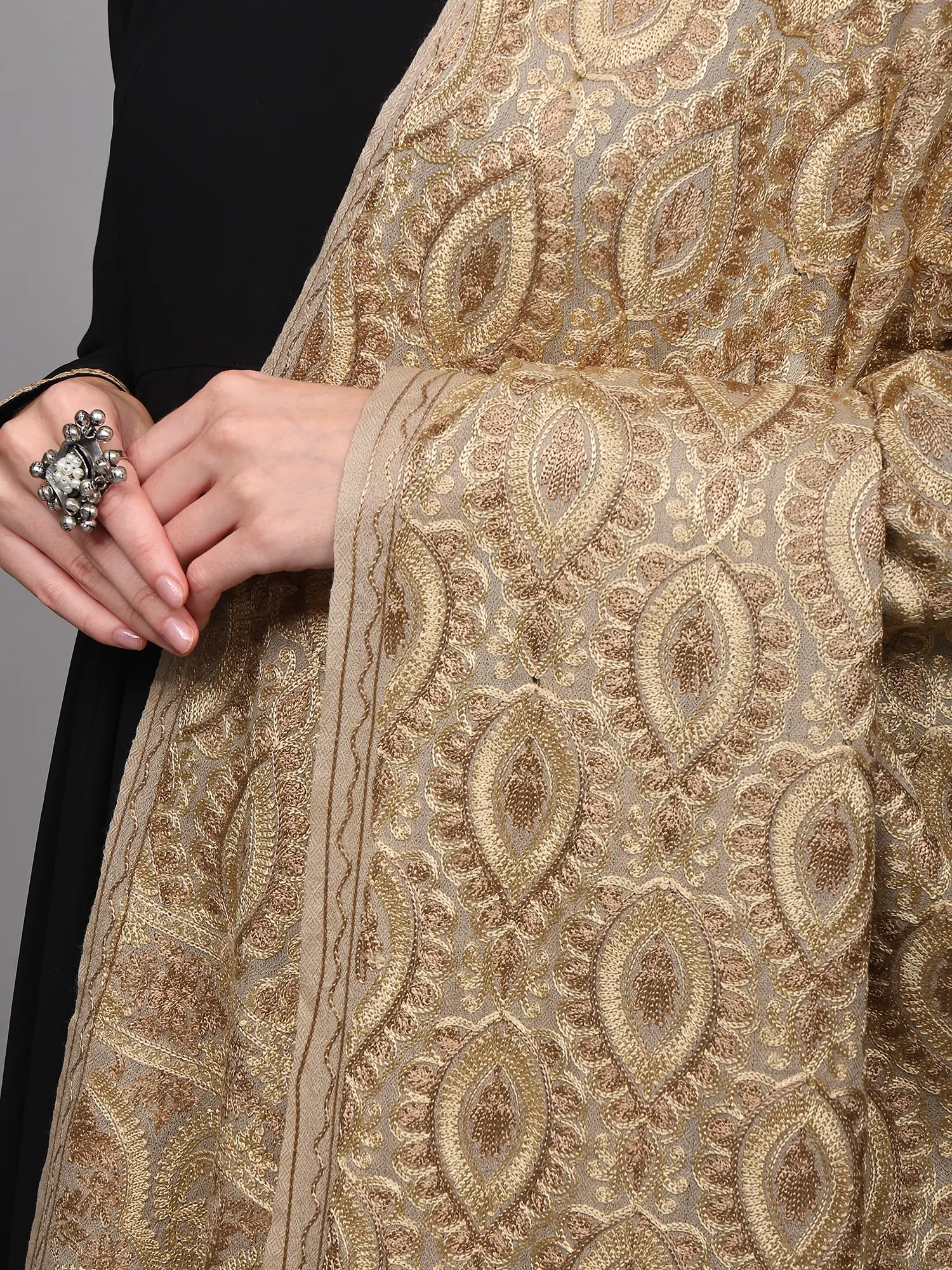 Dove-Gray Sozni Shawl with Diamond Self Weave and Hand-Embroidered Paisley Motif Broad Border