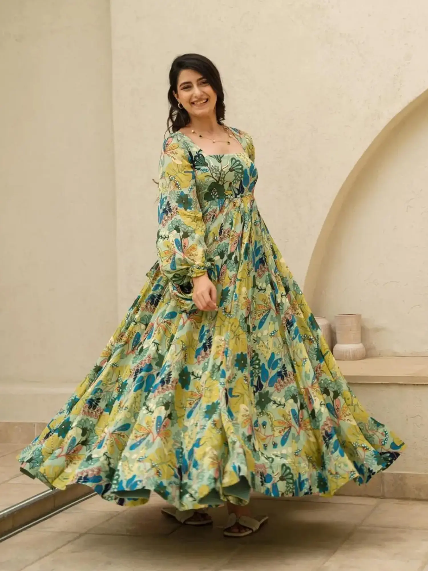 The Anarkali cut, renowned for its flattering and flowing structure, is beautifully executed here. The gown features a fully flared silhouette that cascades from the bodice, creating a dramatic and elegant sweep. This expansive flare lends a sense of movement and grandeur to the dress, ensuring you'll turn heads for all the right reasons. The thoughtfully designed square neckline adds a contemporary touch, framing the décolletage elegantly, while the full-length sleeves with their subtle volume offer a classic and refined aesthetic. This Anarkali is designed to celebrate your silhouette with grace and poise.