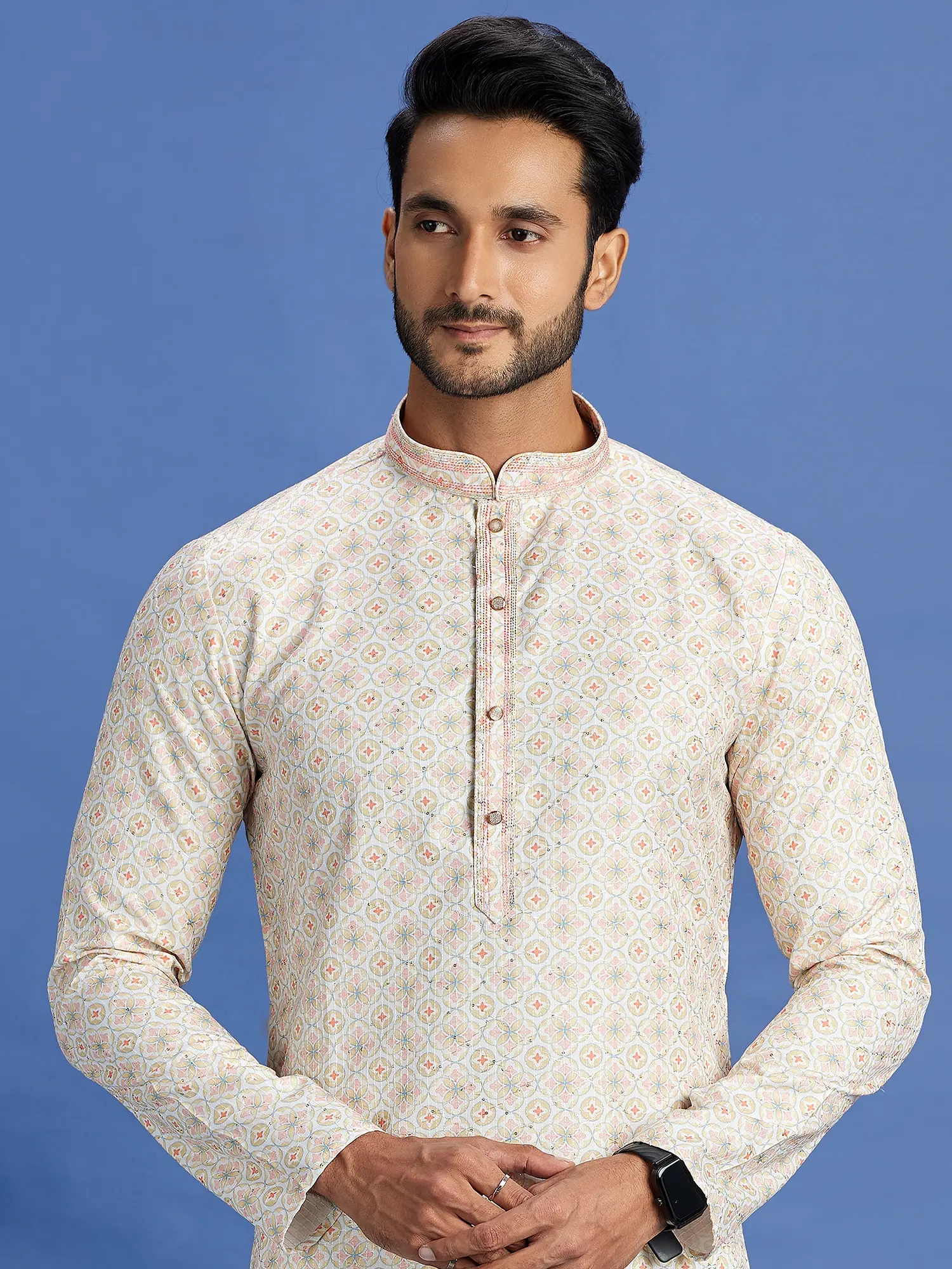 Wedding Kurta Pajama Set with Embroidered Collar and Jacquard Woven Paan Leaves