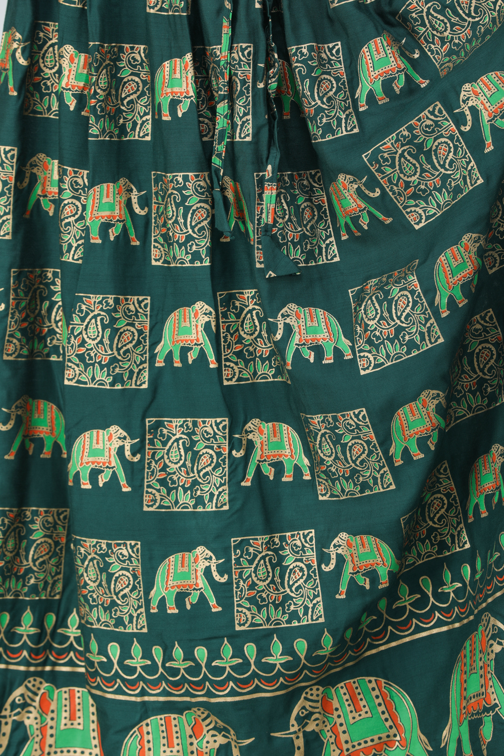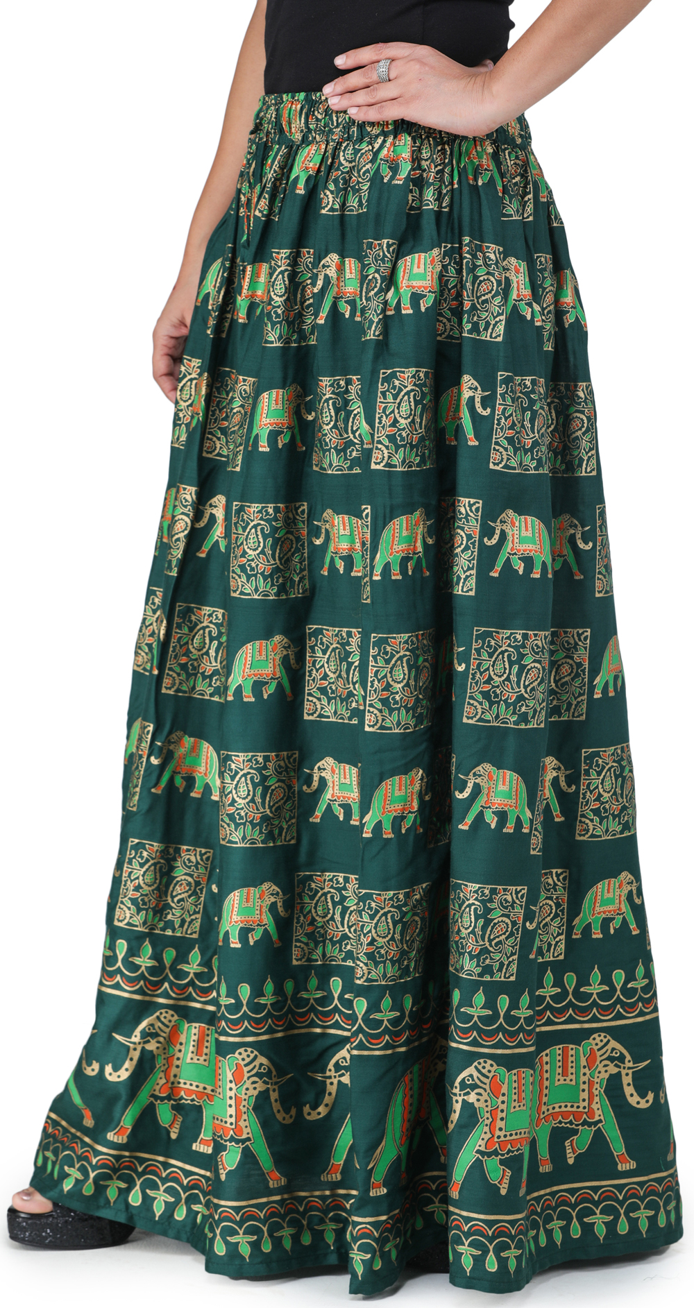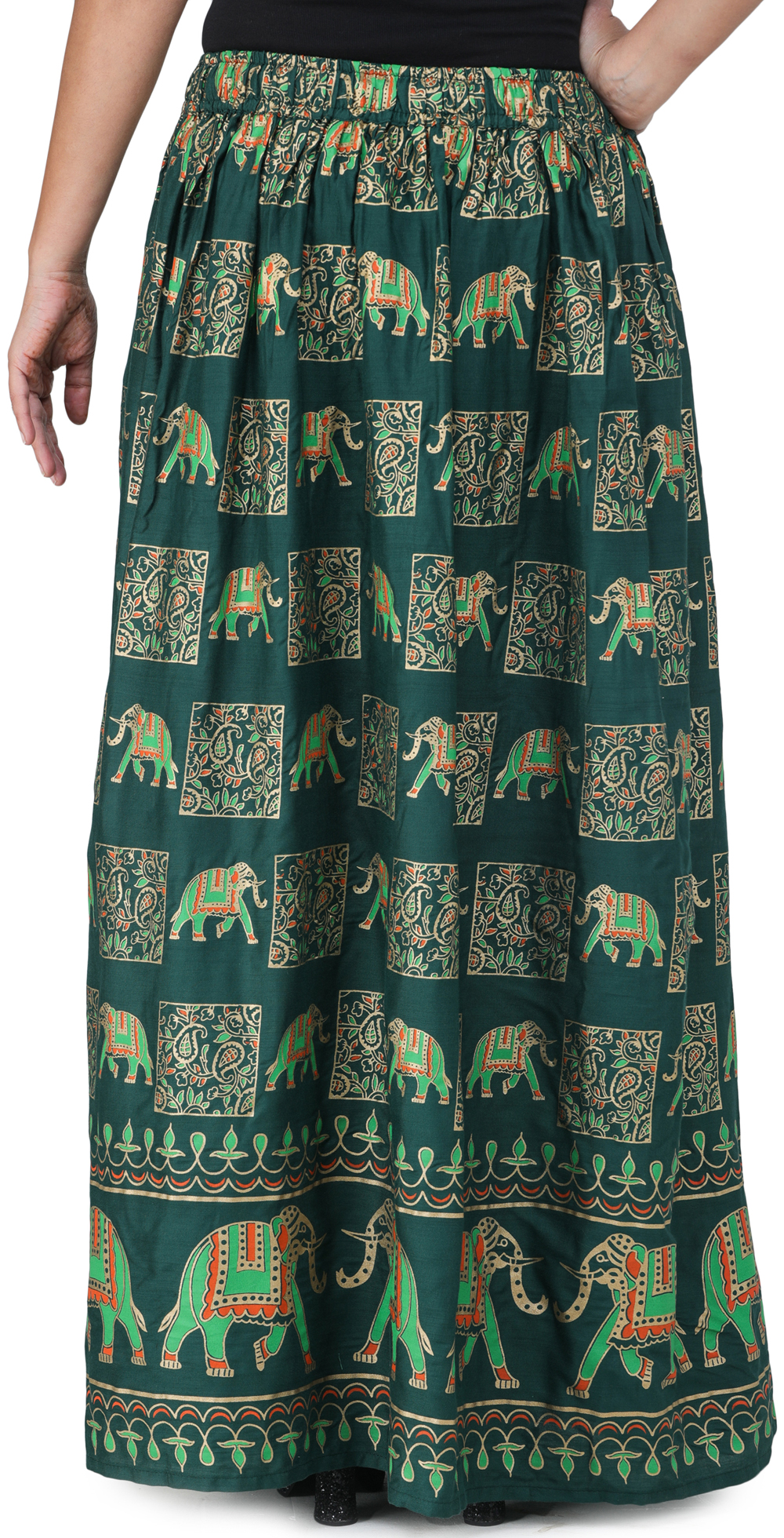 Groove with ease in this digitally printed long skirt, adorned with charming traditional motifs- paisleys and elephants. These symbols of grandeur and auspiciousness in Indian culture bring a loveliness to the graceful flow of the skirt, as the fabric allows you a breathable stylish feel.