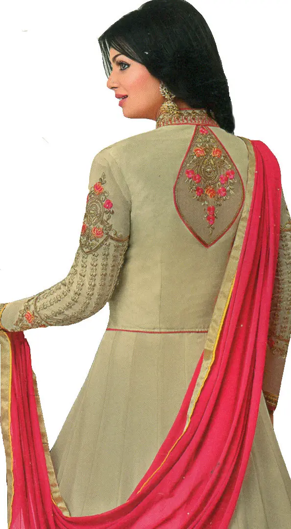 Step into a realm of timeless style with this captivating Anarkali suit, a masterpiece designed to make you the center of attention. Crafted from luxurious georgette fabric, this ensemble drapes beautifully, offering both comfort and an ethereal grace. The soft, doeskin hue provides a sophisticated canvas for the intricate detailing, exuding an understated opulence that is perfect for any special occasion.