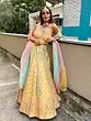 This ensemble is more than just clothing; it's a celebration of color, craftsmanship, and celebratory spirit. The harmonious combination of the vibrant yellow base with the subtle pastel hues of the dupatta creates a visually appealing contrast that is both striking and elegant. Each element, from the fabric choice to the intricate handiwork, has been carefully selected to create a garment that is truly unforgettable. Perfect for weddings, festivals, engagement parties, or any grand event where you wish to make a stylish statement.