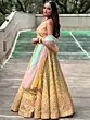 This lehenga choli set is the epitome of party wear, blending traditional aesthetics with contemporary flair. The V-neck choli, with its sleeveless design, is both modern and flattering, allowing for graceful movement. The lehenga itself is designed to be voluminous and flowing, creating a stunning silhouette that is both elegant and festive. The accompanying dupatta is a work of art in itself, featuring a beautiful ombre effect in soft pastel shades of pink and blue, blending seamlessly into a warm yellow. The edges of the dupatta are also delicately finished with sequins and embroidery, mirroring the intricate details of the lehenga and choli, ensuring a cohesive and glamorous look.