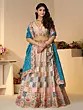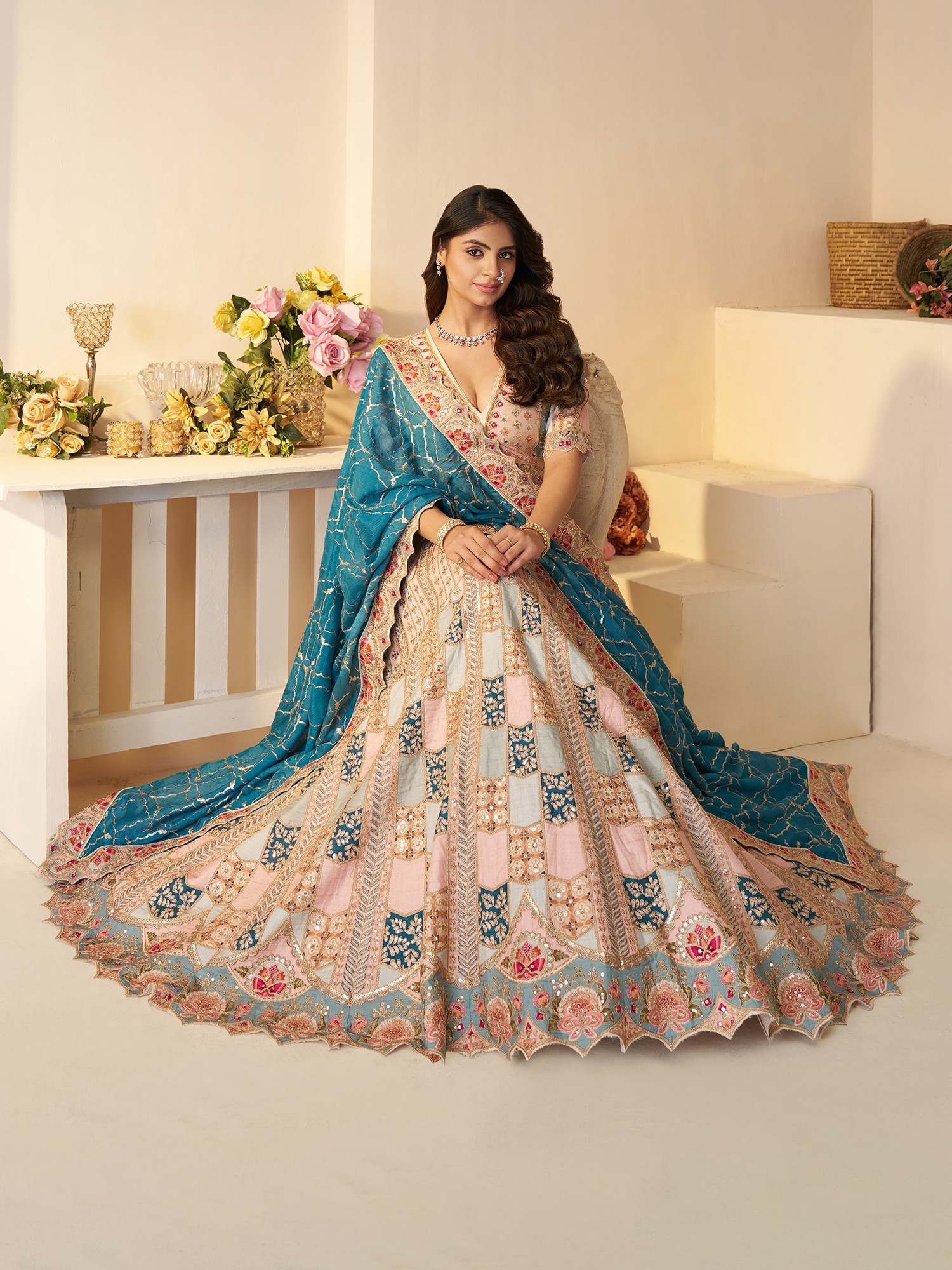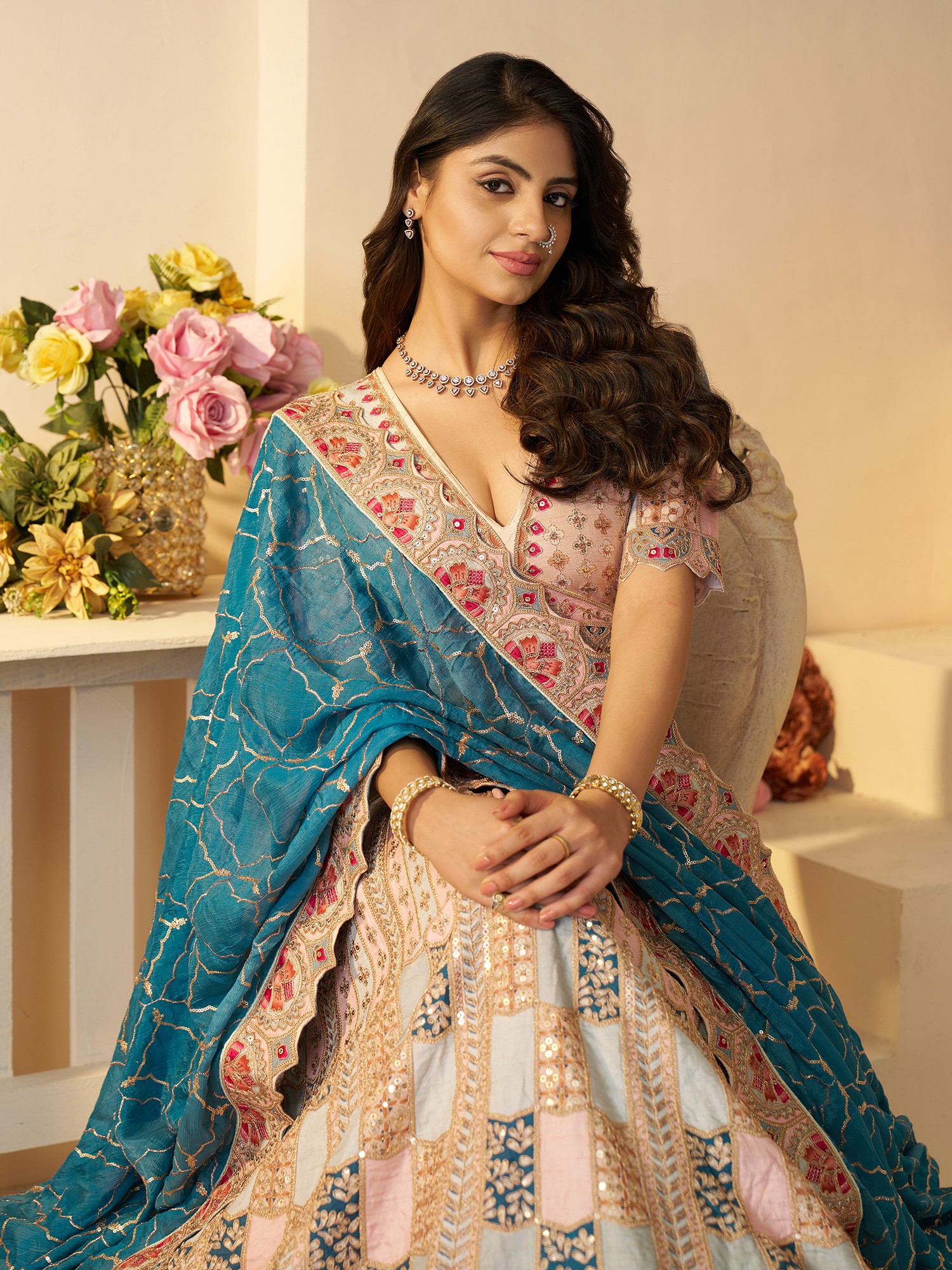 Teal Taffeta Silk Beautiful Floral Zari Embroidery Lehenga Choli with Beige Sheer Dupatta