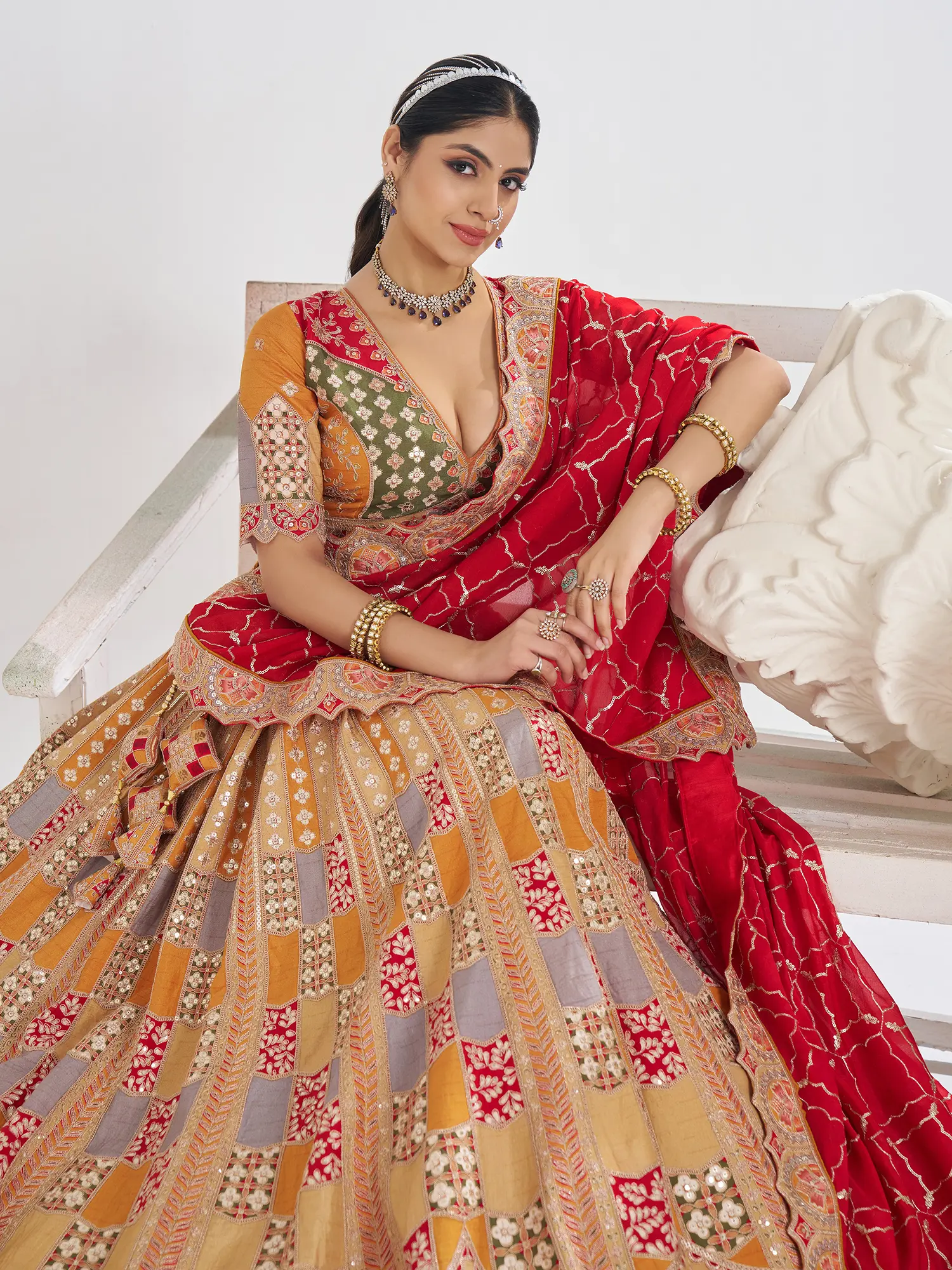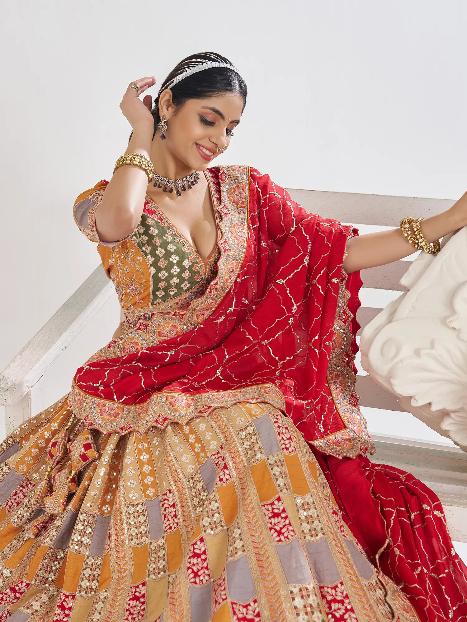 Red Soft Net Embroidered Lehenga Choli with Scalloped Dupatta