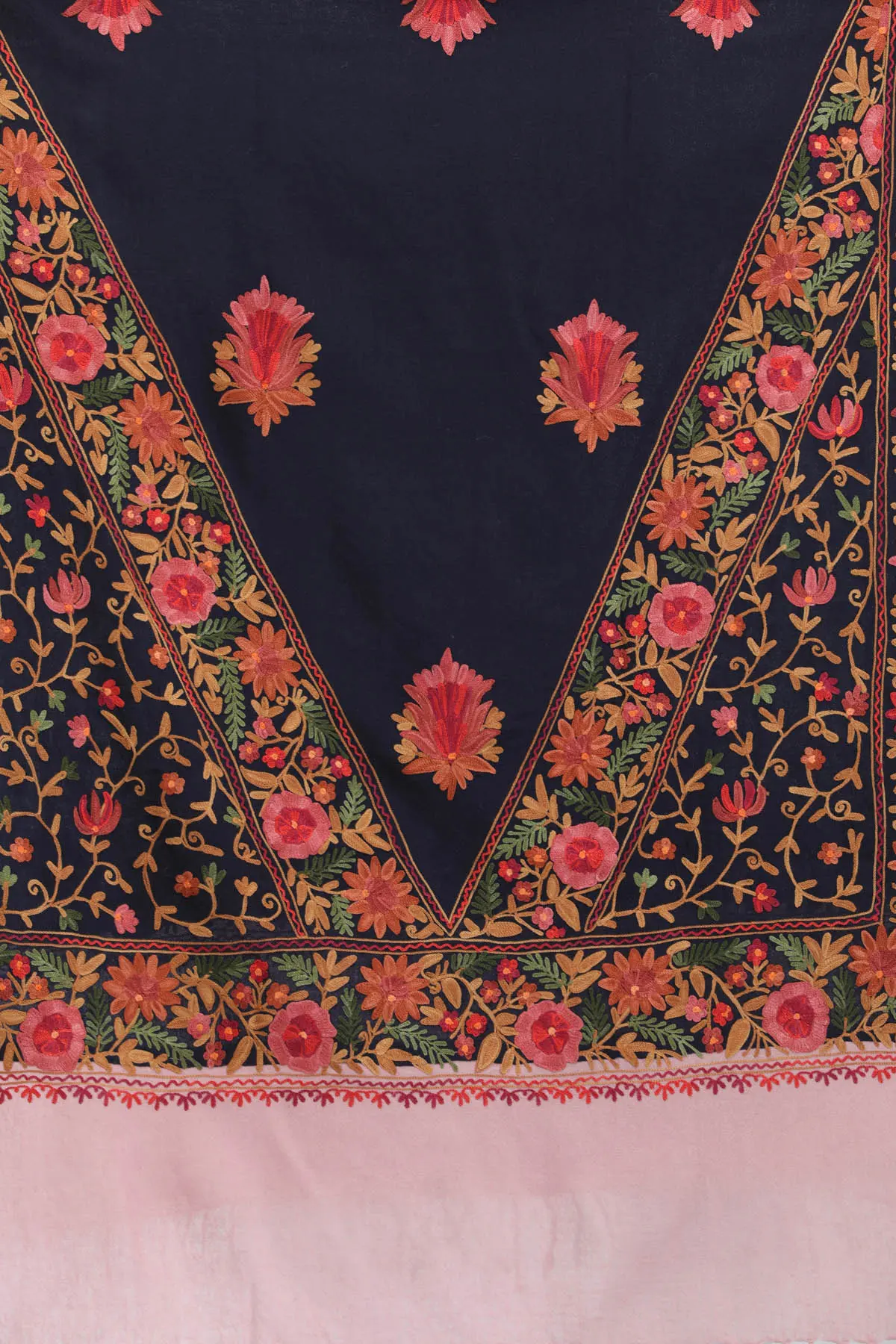 This pure wool stole with hand made flowery embroidery done in traditional style. The yellow and orange flowers are significant as they are the colours of the Sikh religion. The black border at the end of the stole signifies a woman's glory, beauty and power. The stole can be worn around to match any outfit. Aari is a traditional shawl of Amritsar, and the name Aari is derived from the word "Arai", which means blanket. The double-coloured ari stole, with its floral and leafy motifs, is an excellent example of the artistry of making these traditional Indian garments. The rich hues of the stole are achieved by dyeing the fabric separately for each colour before it is woven together to create the final product. The Aari has been in use since the Mughal era. This beautiful stole comes from Amritsar, one of the most visited cities in India, known for its Golden Temple and cultural heritage.