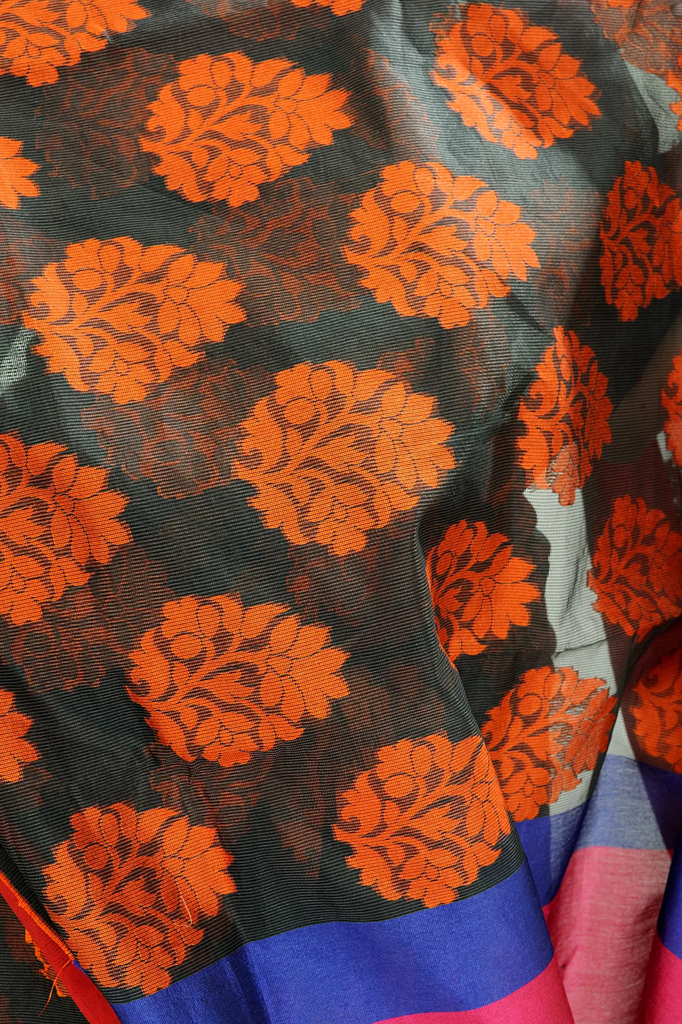 The design cleverly utilizes a dual-color approach, with the main body of the sari featuring the intricate floral work on a deep charcoal base. This provides a dramatic backdrop that makes the orange motifs pop with remarkable vibrancy. Complementing this, a richly contrasting plain border in a classic crimson red frames the sari. The border is neatly finished, adding a touch of refined elegance and defining the silhouette with a clean, sharp line. The red border not only adds a pop of color but also serves to enhance the overall regal appeal of the garment.