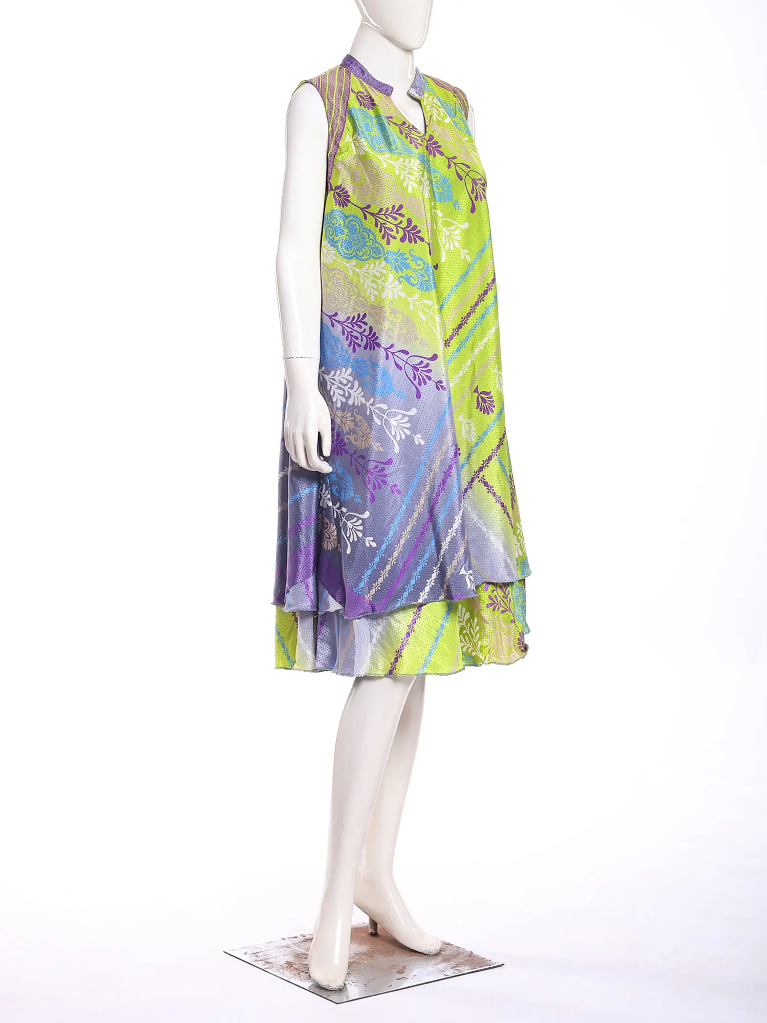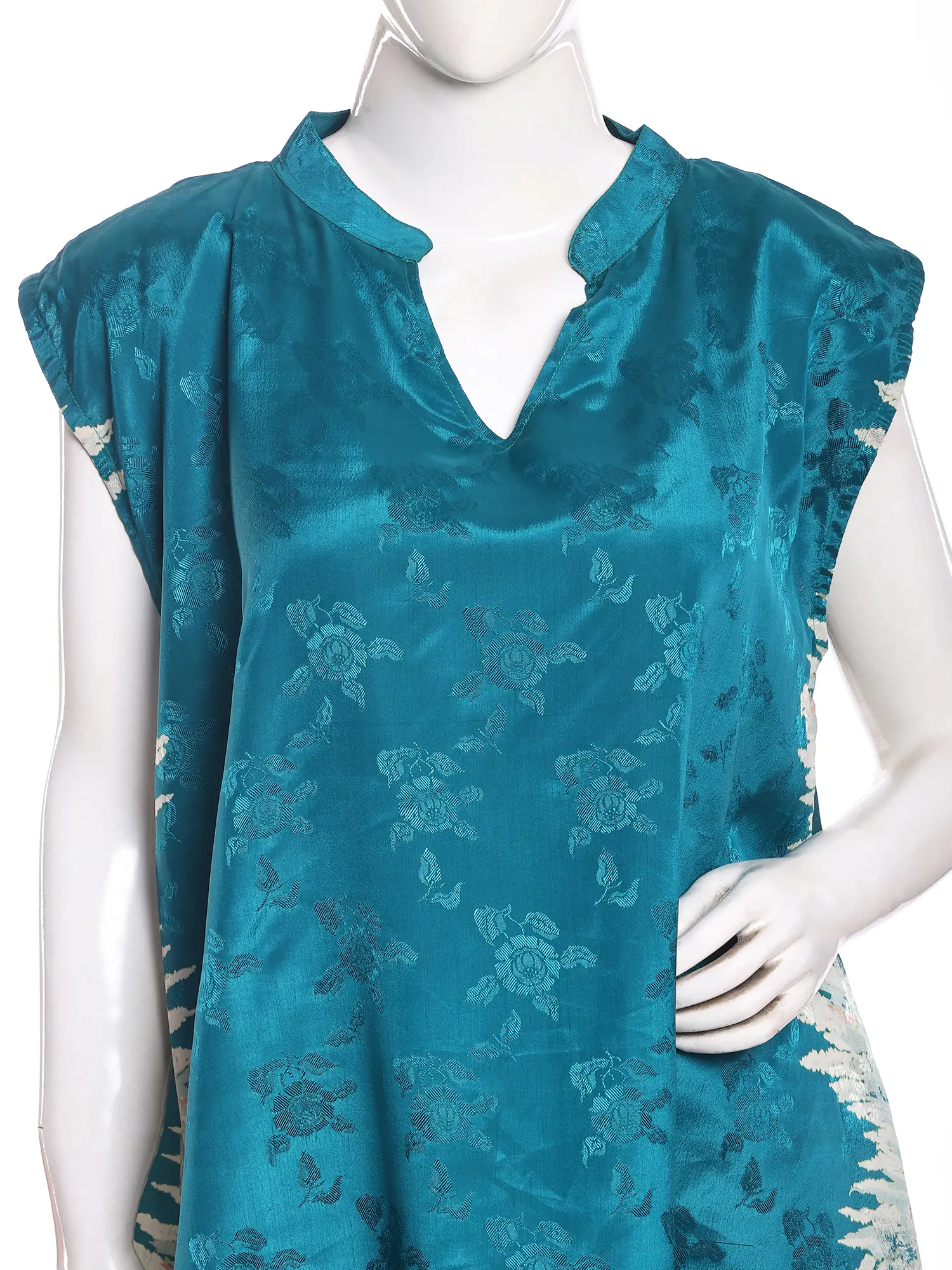 Make a statement with this stunning double-layered midi dress, a perfect blend of comfort and contemporary style. Crafted from luxurious silk viscose, this dress drapes beautifully, offering a flattering silhouette for any occasion. The vibrant teal top layer features captivating printed motifs, a unique design that effortlessly adds a touch of elegance to your ensemble. The delicate off-white underlayer peeks through, creating a subtle yet striking contrast and adding depth to the overall look. The sleeveless design makes it ideal for warmer weather, while the midi length ensures both sophistication and ease of movement.