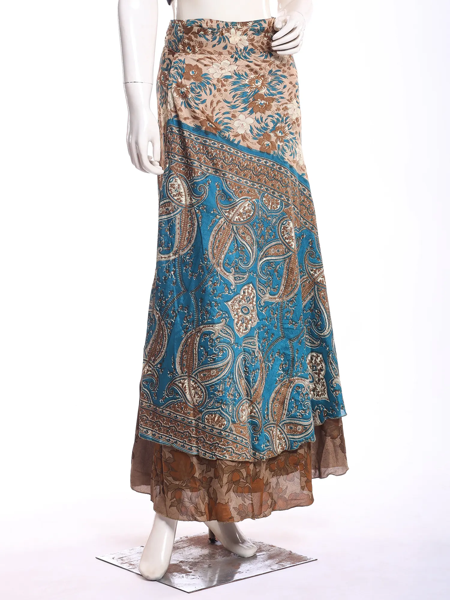 Indulge in the captivating allure of our double layer wrap-around long skirt, a stunning garment meticulously crafted from luxurious silk viscose. This exquisite skirt is designed to flatter every figure, offering a comfortable and stylish option for a variety of occasions. The rich, teal base is adorned with a mesmerizing floral print, creating a captivating visual symphony that's both bohemian and sophisticated. The wrap-around design allows for a customizable fit, ensuring a perfect silhouette every time. The double layer adds depth and texture, enhancing the overall elegance of this unique piece.