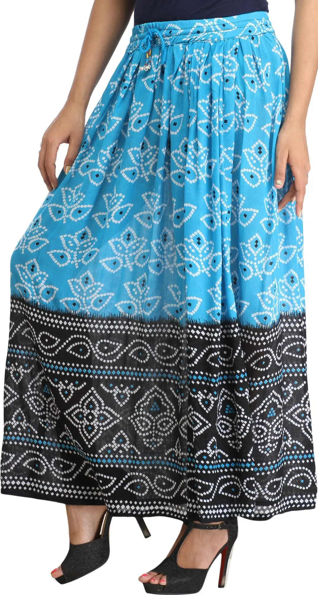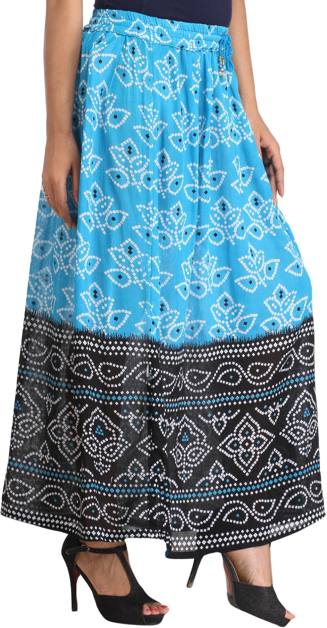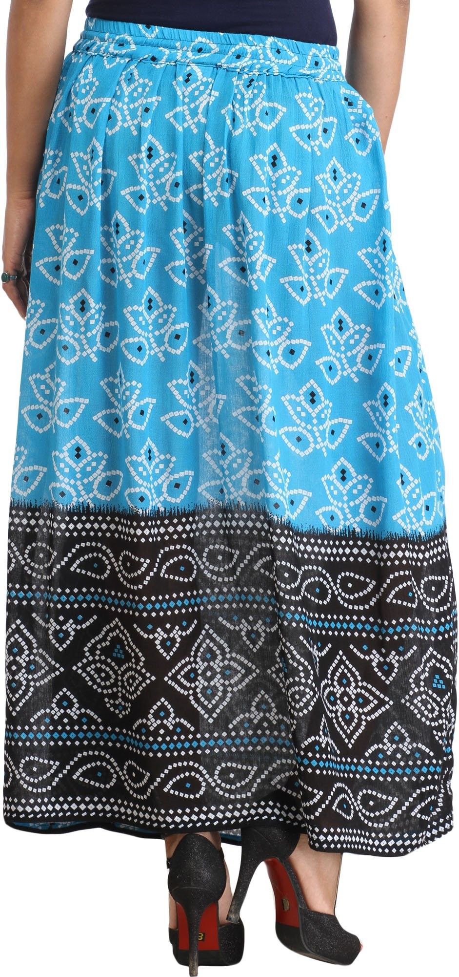 Double-Shaded Elastic Long Skirt with Bandhani Print