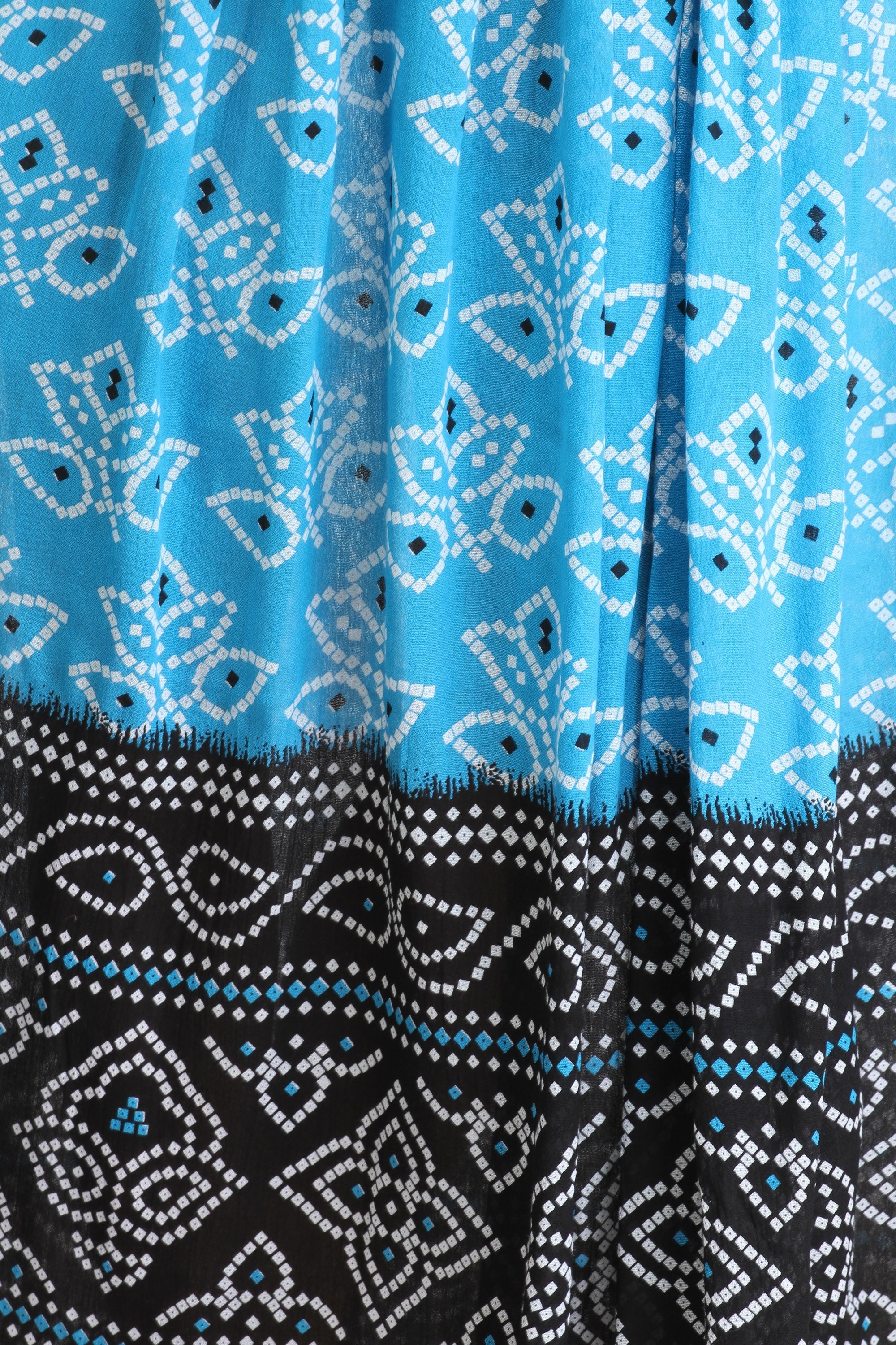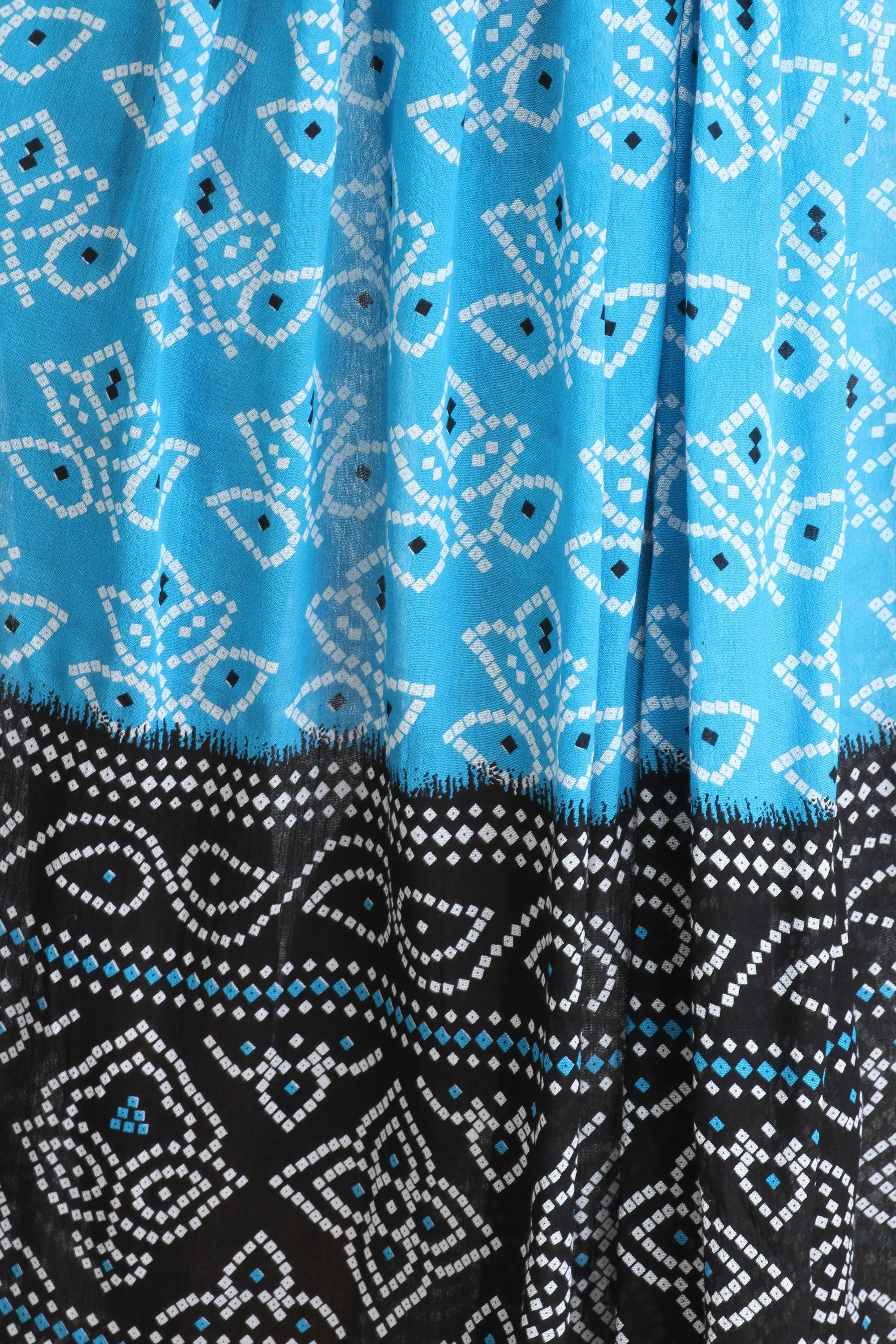 Bandhani, meaning "to tie," is an ancient Indian art form of tie-dyeing. Skilled artisans meticulously tie small sections of fabric with thread, creating resist patterns before dyeing the cloth. The process results in distinctive speckles and patterns that are a hallmark of this beautiful craft. This skirt proudly displays the intricate artistry of Bandhani, bringing a piece of this rich cultural heritage into your everyday style. The double-shaded effect further amplifies the visual richness, making each skirt a unique expression of this time-honored technique.