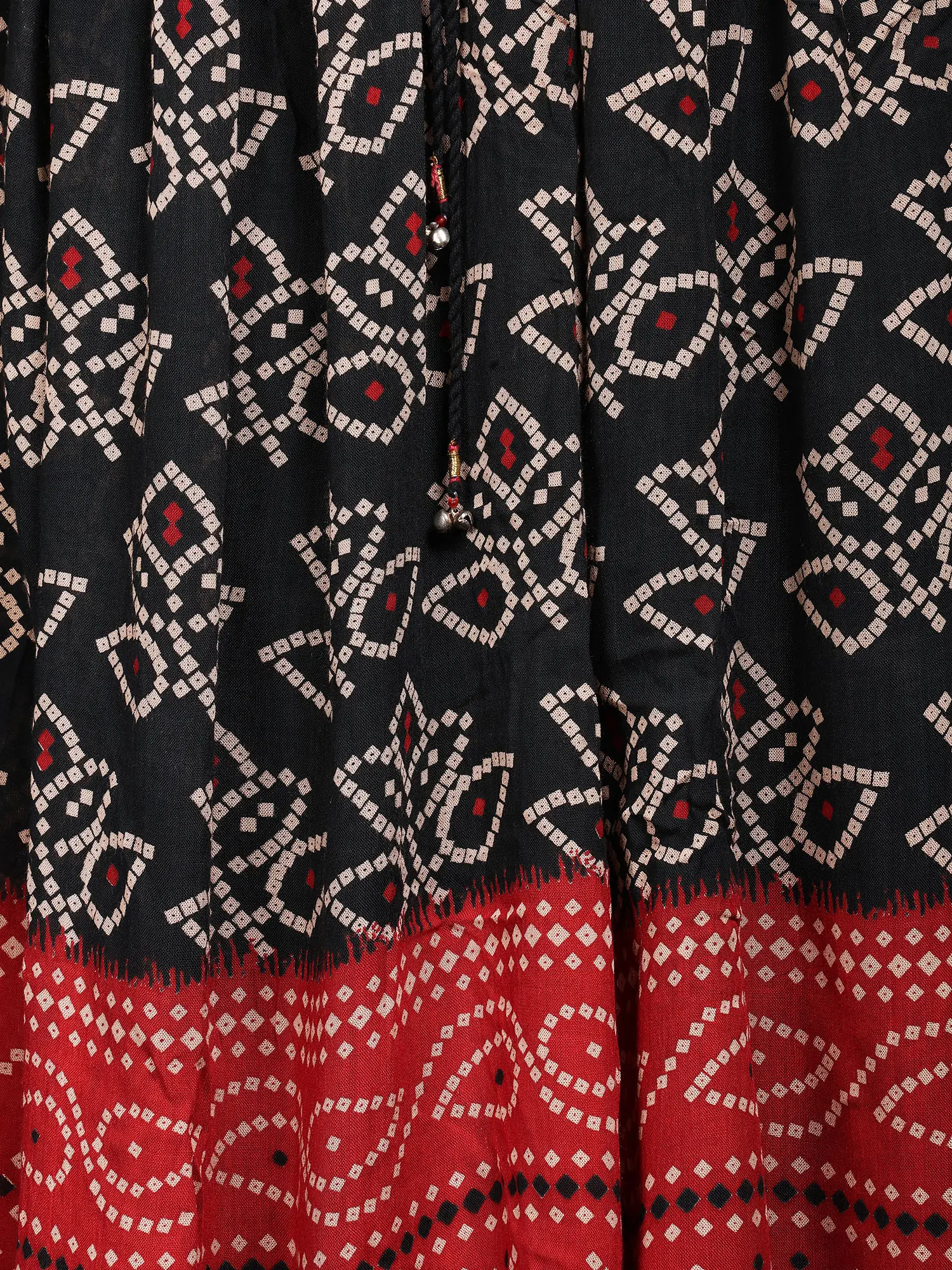 This skirt is a visual delight, featuring a striking double-shaded design. The main body of the skirt showcases a bold black base adorned with a repeating pattern of delicate, flower-like motifs in off-white and pops of red. This section is further enhanced by a vibrant red border at the hem, which mirrors the Bandhani artistry with its own intricate, geometric patterns. The interplay of the rich black and the lively red, combined with the detailed prints, creates a look that is both eye-catching and sophisticated.