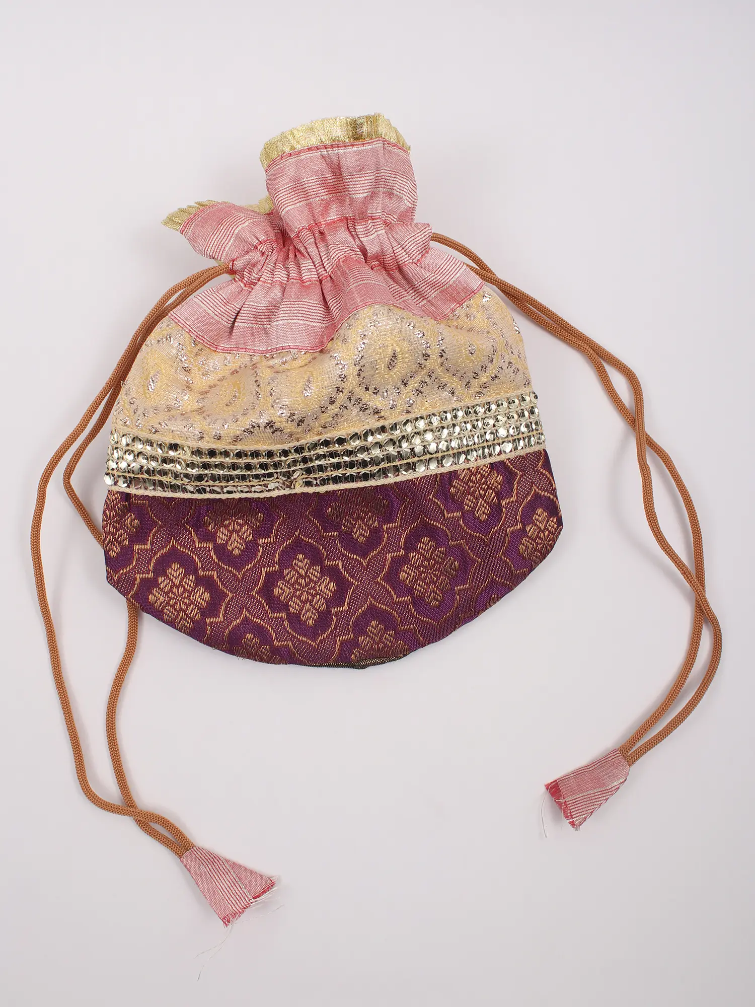 The drawstring closure adds a functional element to these potli bags, making them not just stylish but also convenient. This accessory serves as a versatile and fashionable addition to any ensemble, embodying the timeless allure of traditional floral patterns while embracing modern design elements, making it a statement piece for various occasions.