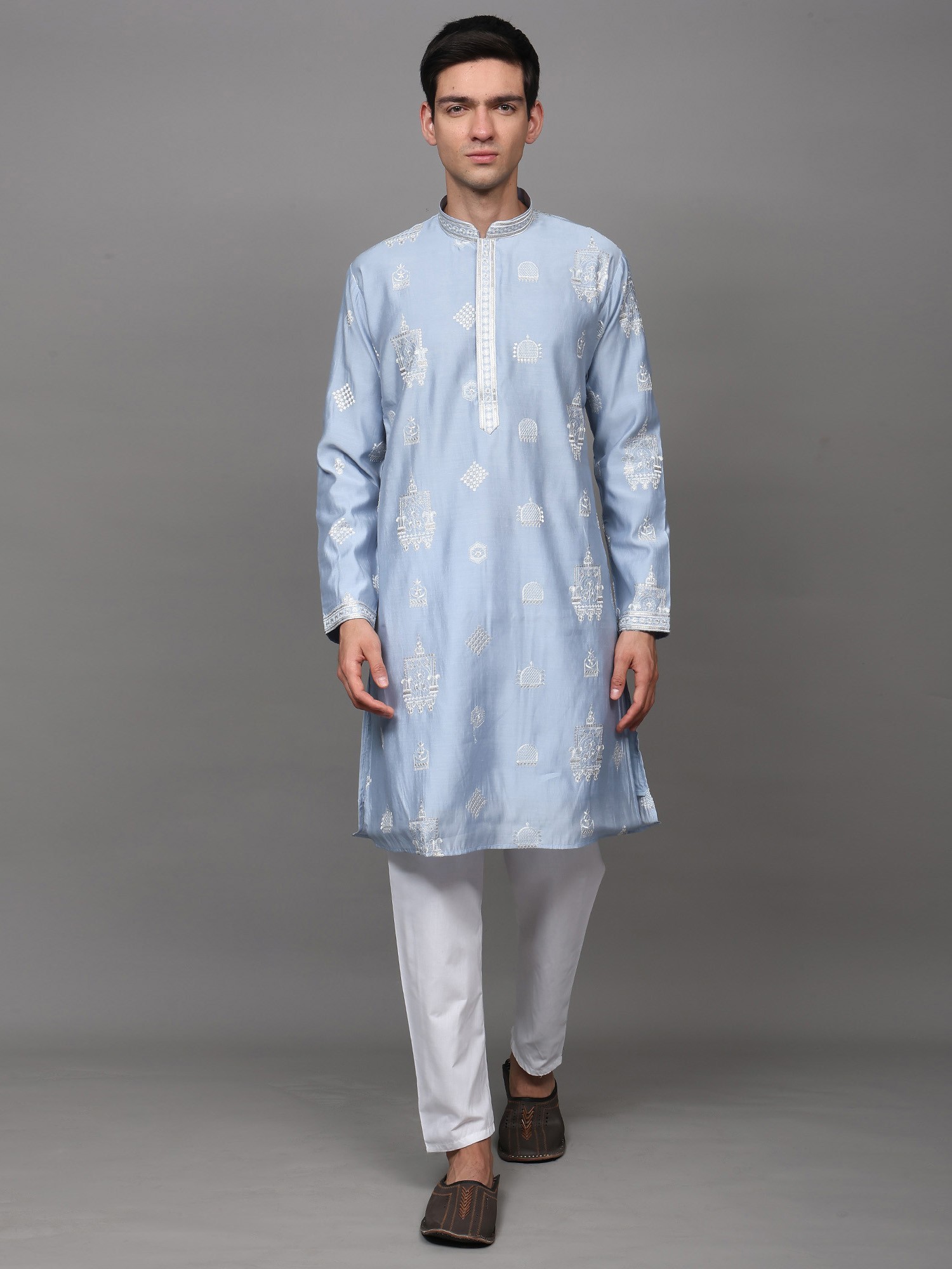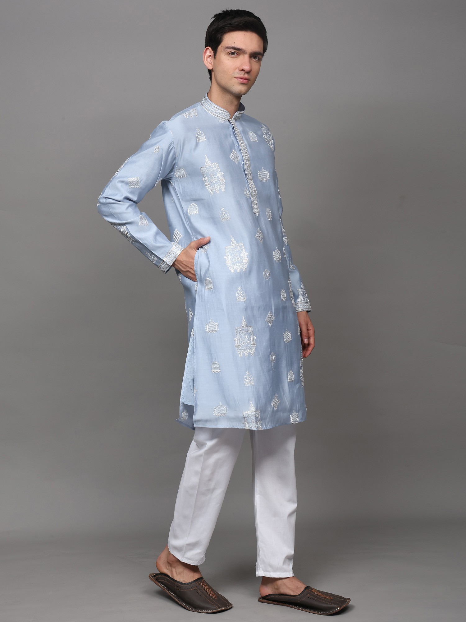 Fawn Designer Kurta Pajama with Embroidered Beads and Sequins on Neck