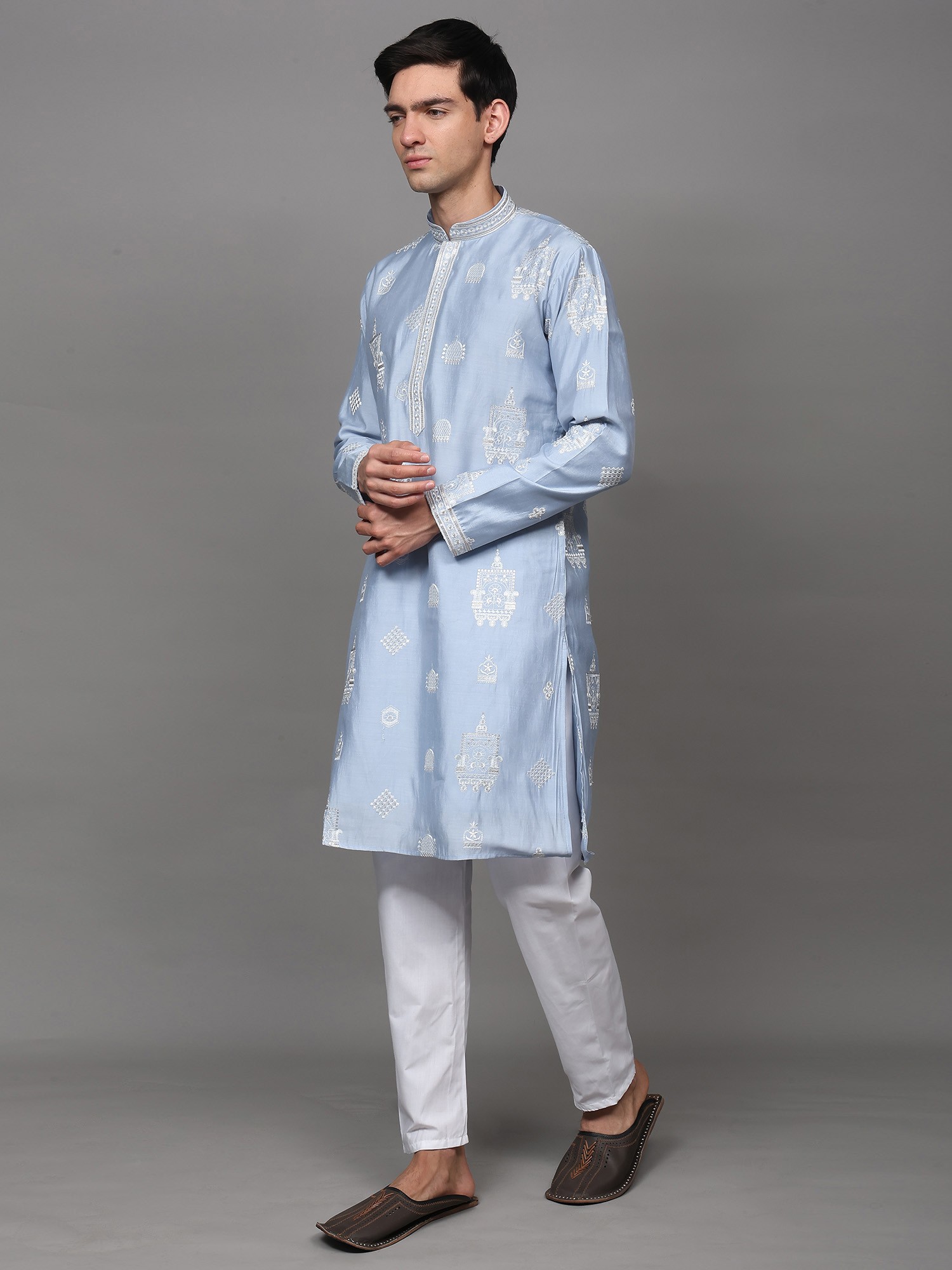 Vanilla-Ice Three-Piece Kurta Pajama Set with Sequins Embroidered Front Open Long Waistcoat