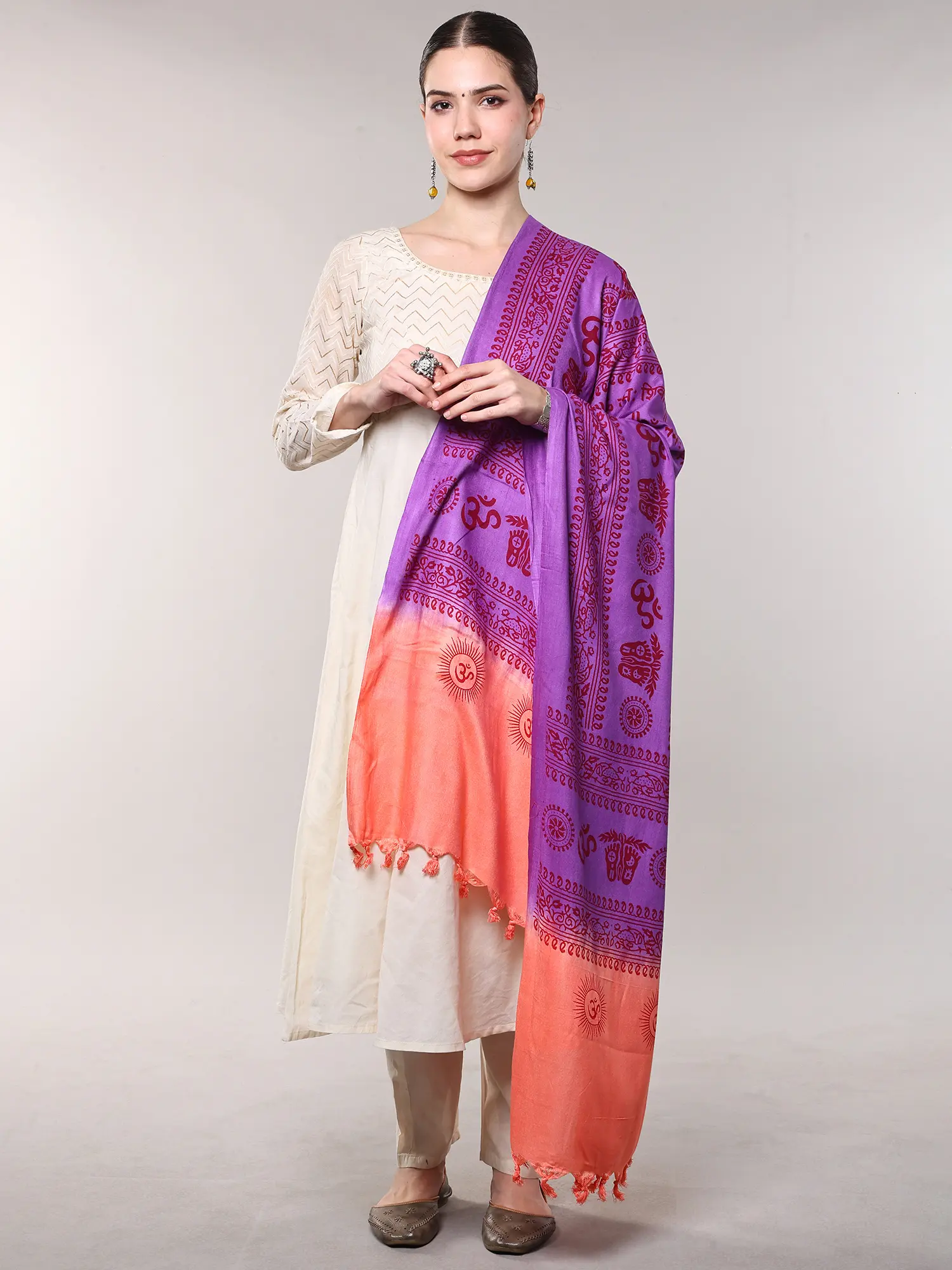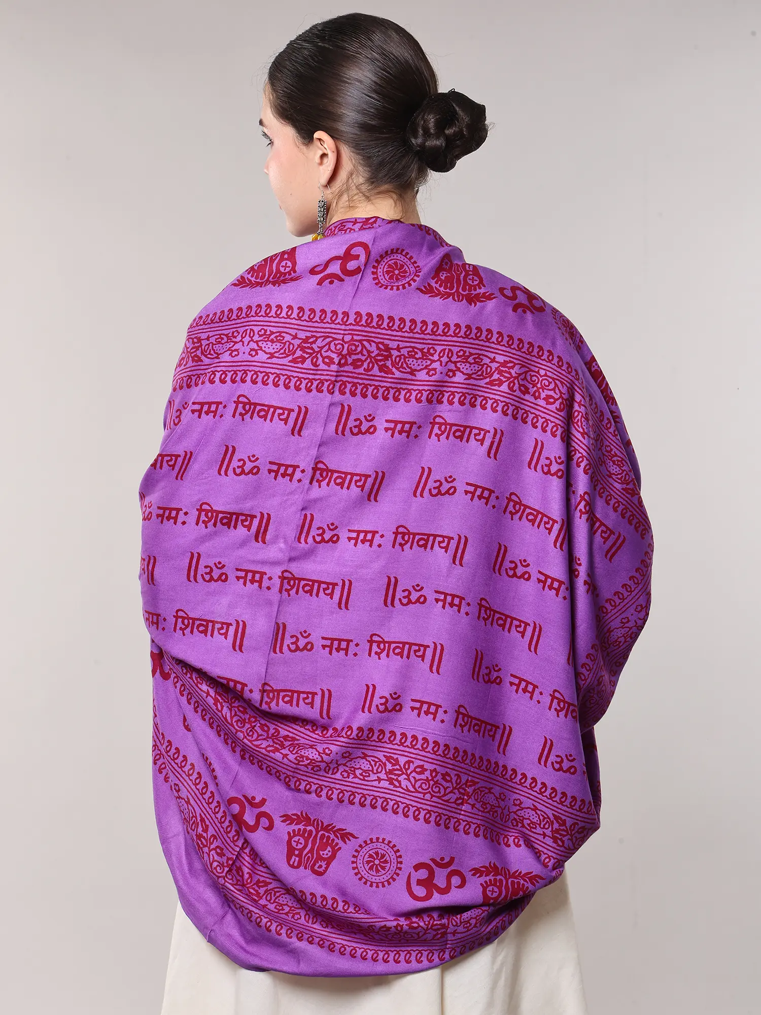 The rich, deep purple fades gracefully into a warm, inviting coral, evoking a sense of sunrise and spiritual awakening. Across its expansive 84-inch length and generous 44-inch width, you'll discover the powerful Om symbol and the revered "Om Namah Shivay" mantra, elegantly printed in a contrasting deep magenta. These sacred elements are framed by delicate borders, enhancing the visual appeal and lending an air of refined artistry. The addition of charming tassels along the hem adds a touch of playful sophistication, completing its artisanal charm.