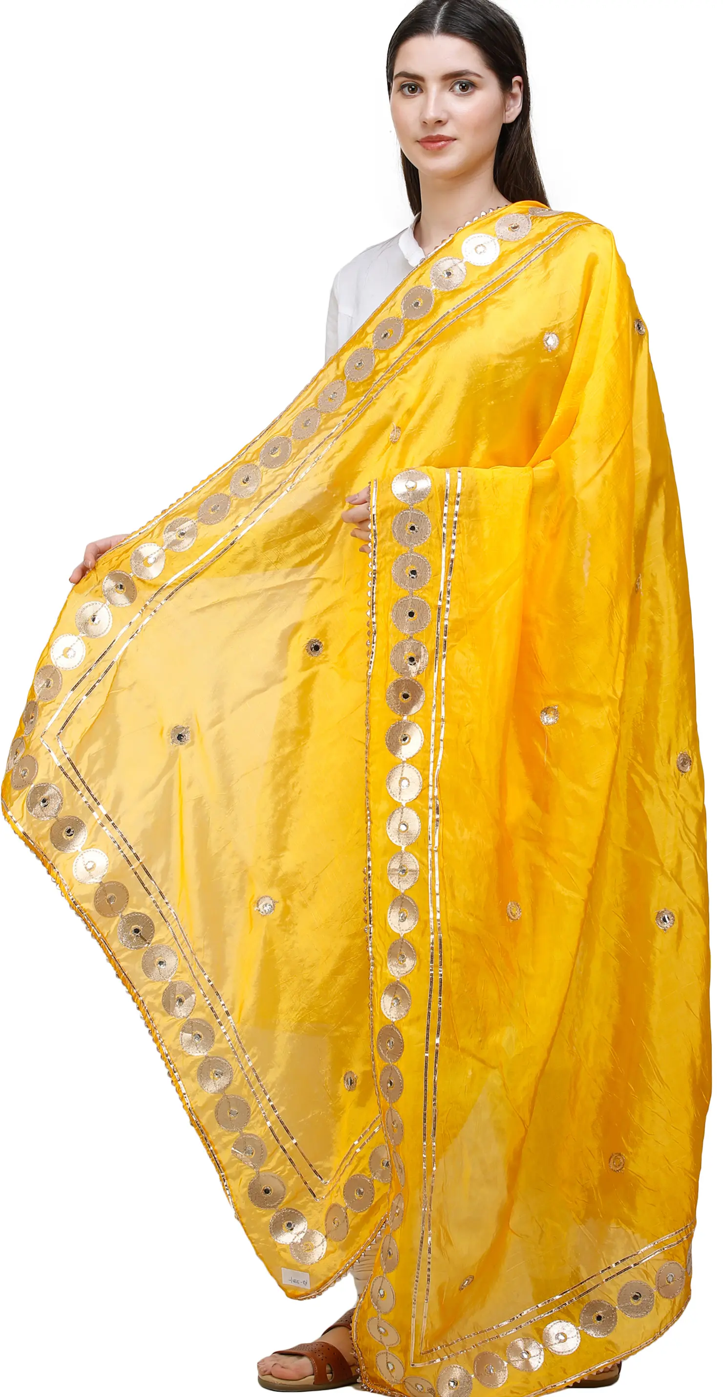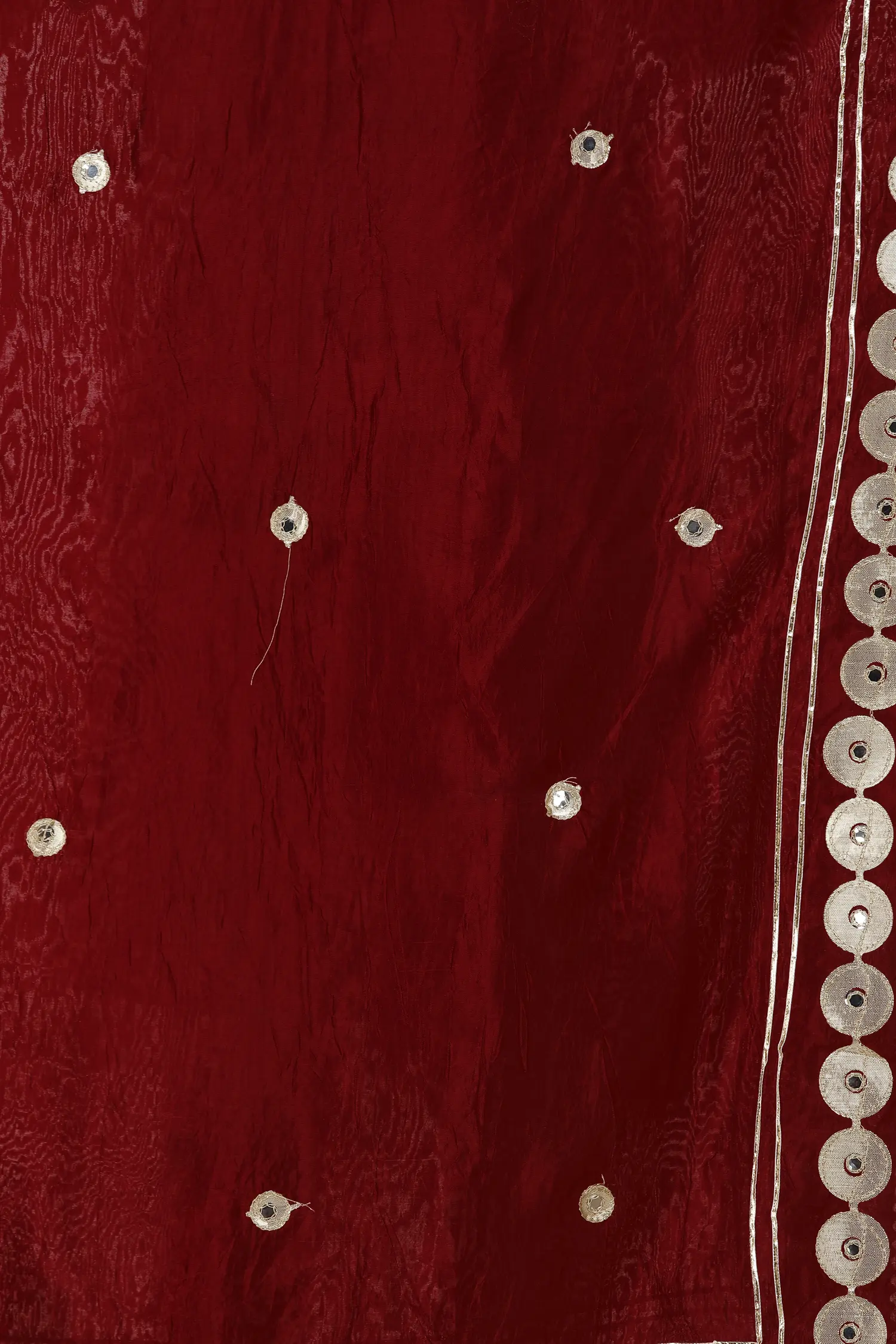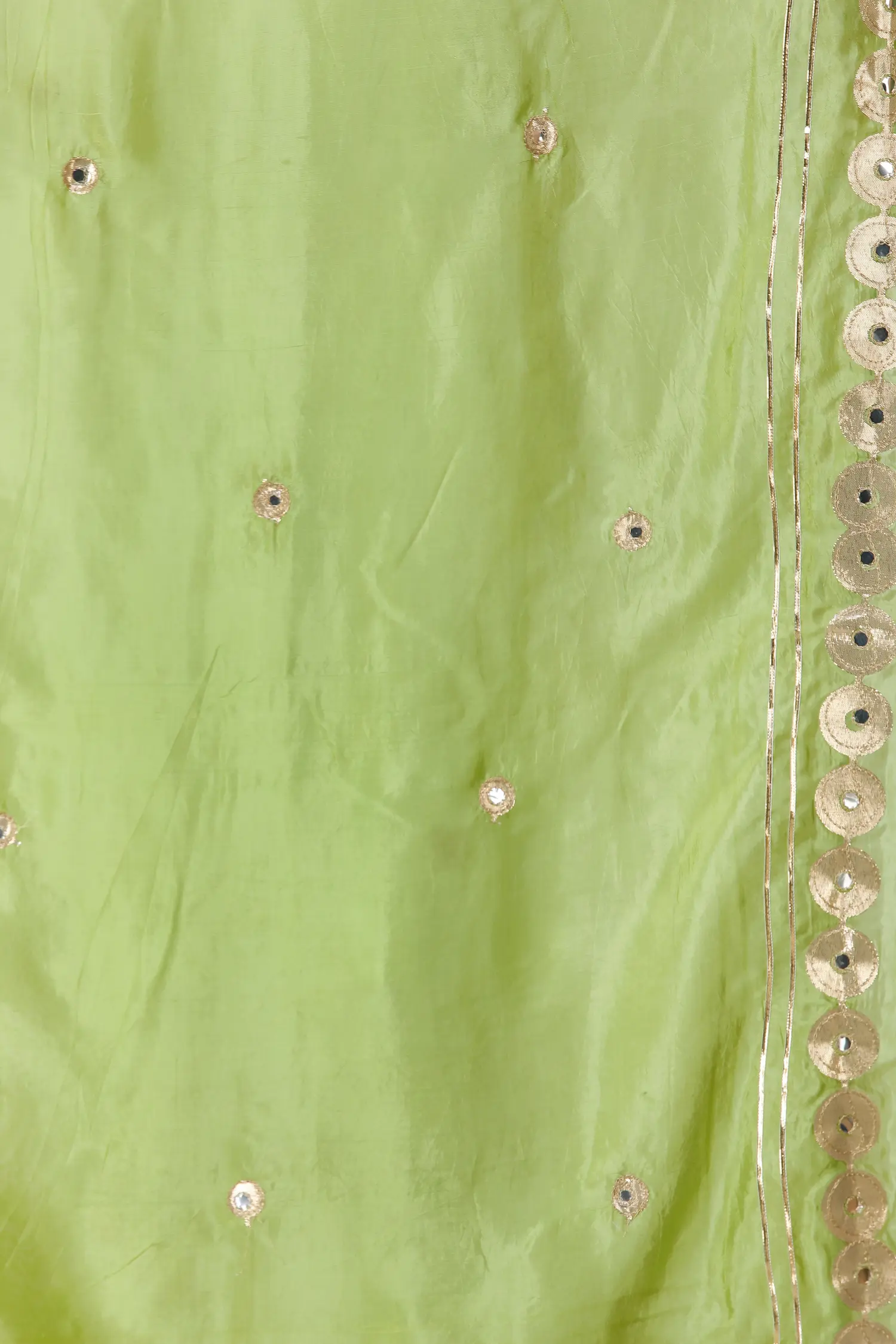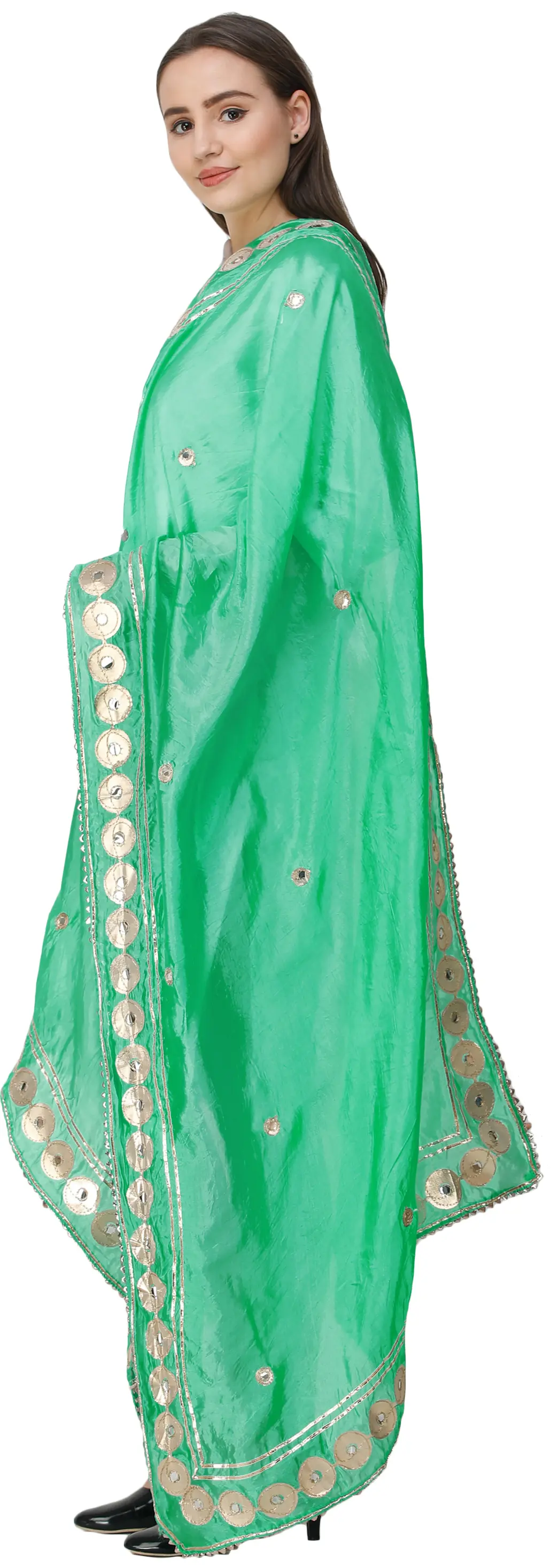Metallic patchwork and embroidery on the dupatta are beautifully complemented by plastic mirror work across the smooth fabric.
