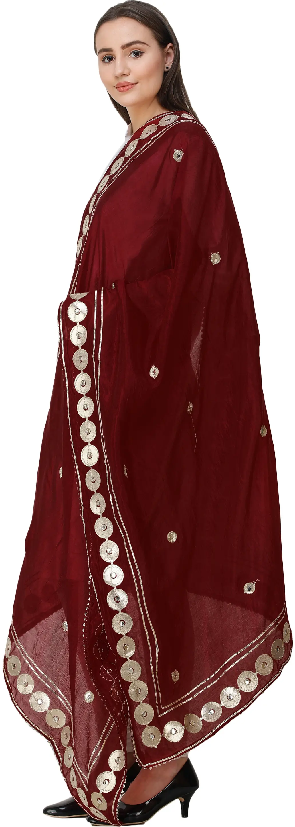 Metallic patchwork and embroidery on the dupatta are beautifully complemented by plastic mirror work across the smooth fabric.