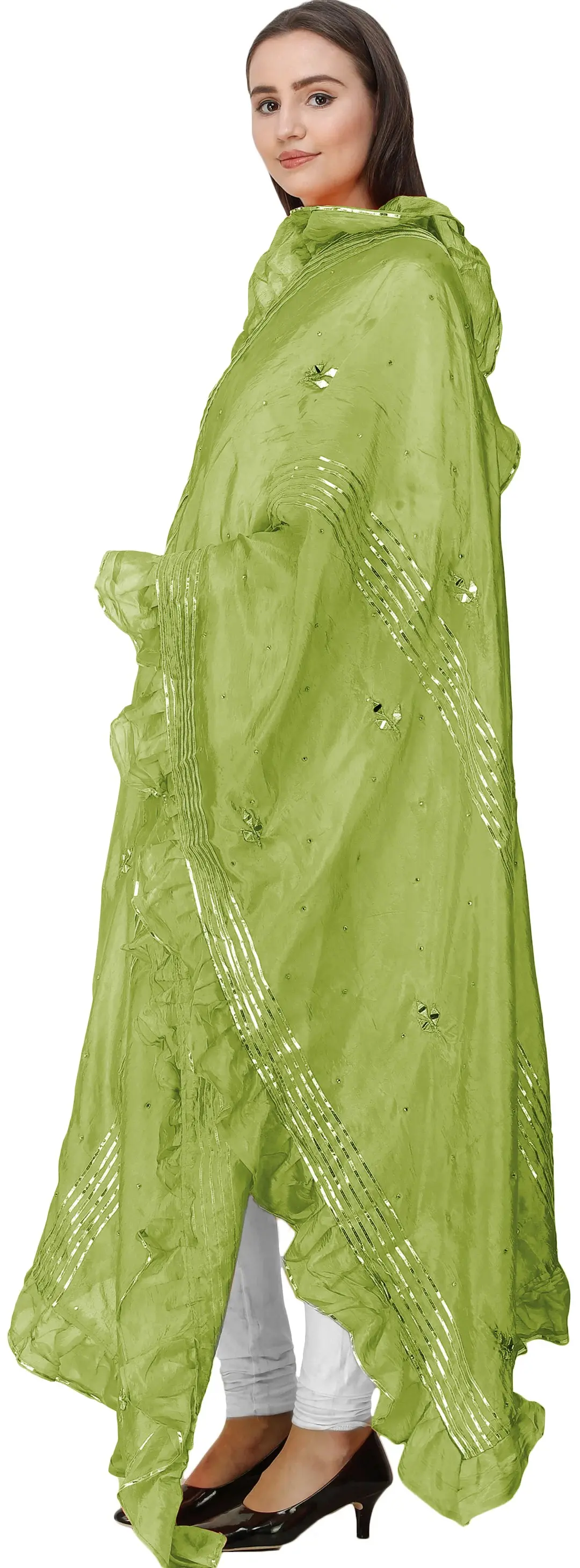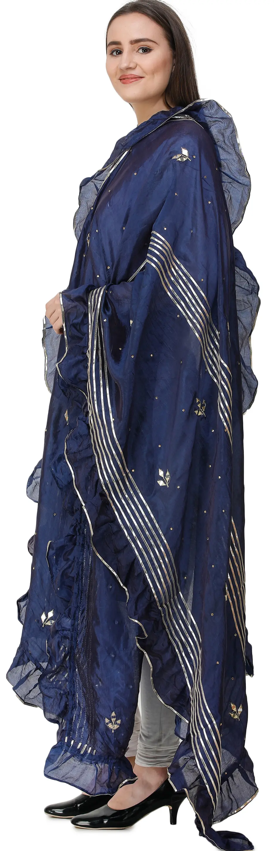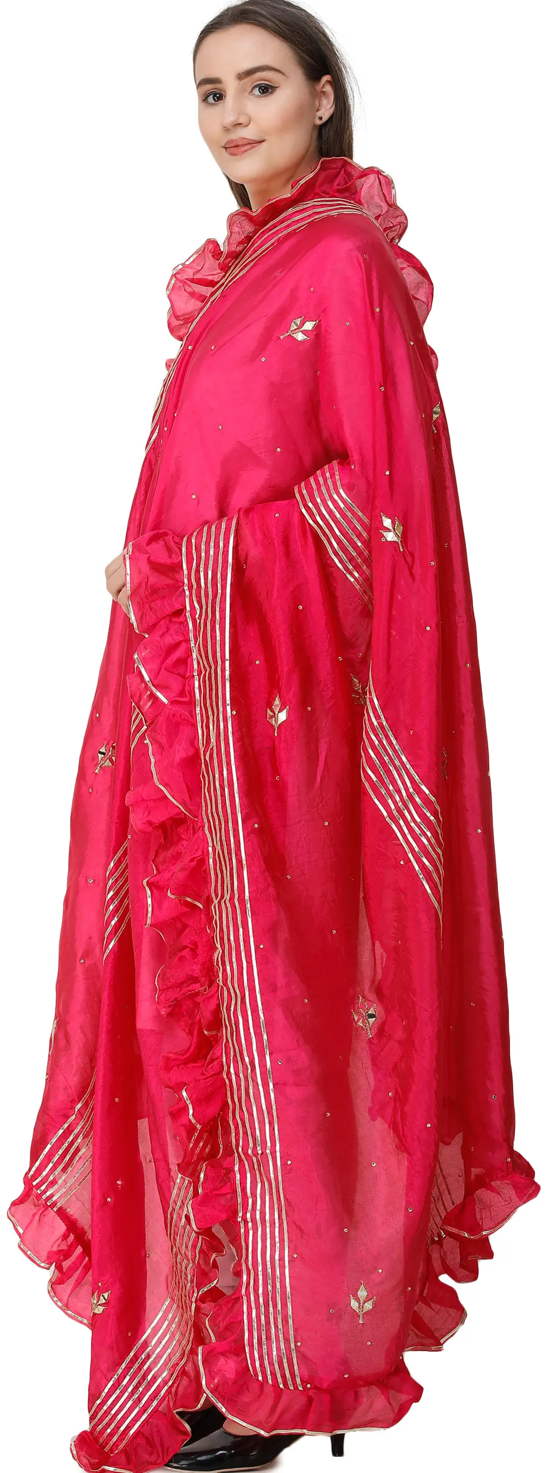 Exotic India has made one of those authentic dupattas from Amritsar available for you with the enticing silver gota patches. While observing the borders of the dupatta, you would notice that frills swaying around looks pleasing to the eyes.