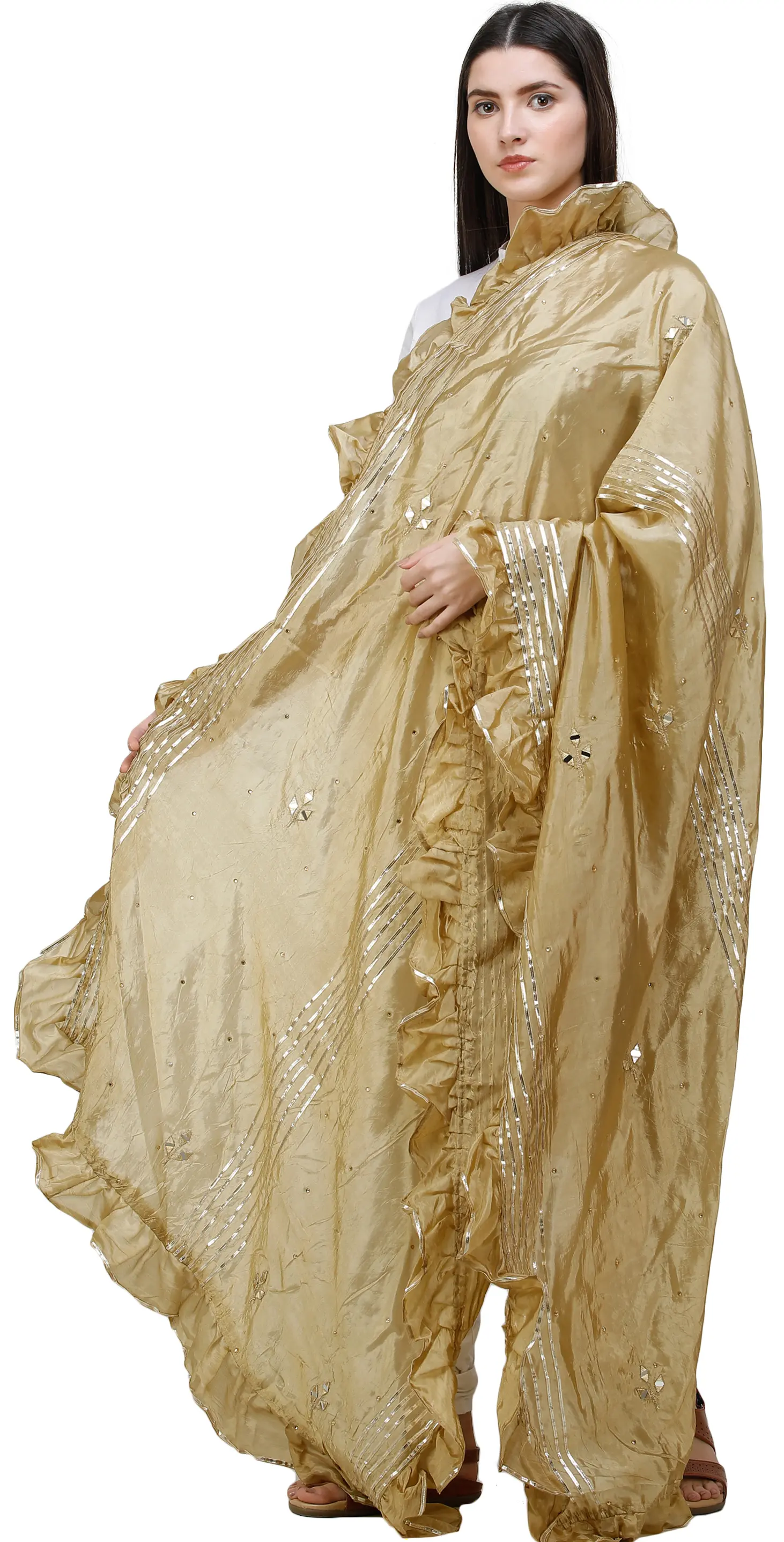 What truly sets this dupatta apart is its meticulous detailing. Along the borders, you'll find delicate Gota patches, intricately crafted with metallic threads to create mesmerizing patterns. These traditional embellishments are a hallmark of Indian artistry, lending a regal and festive touch. Complementing the Gota work is a playful and chic frill border that adds a touch of modern flair and graceful movement. Scattered across the expanse of the dupatta are tiny, shimmering sequins, catching the light and adding a subtle sparkle to your look.
