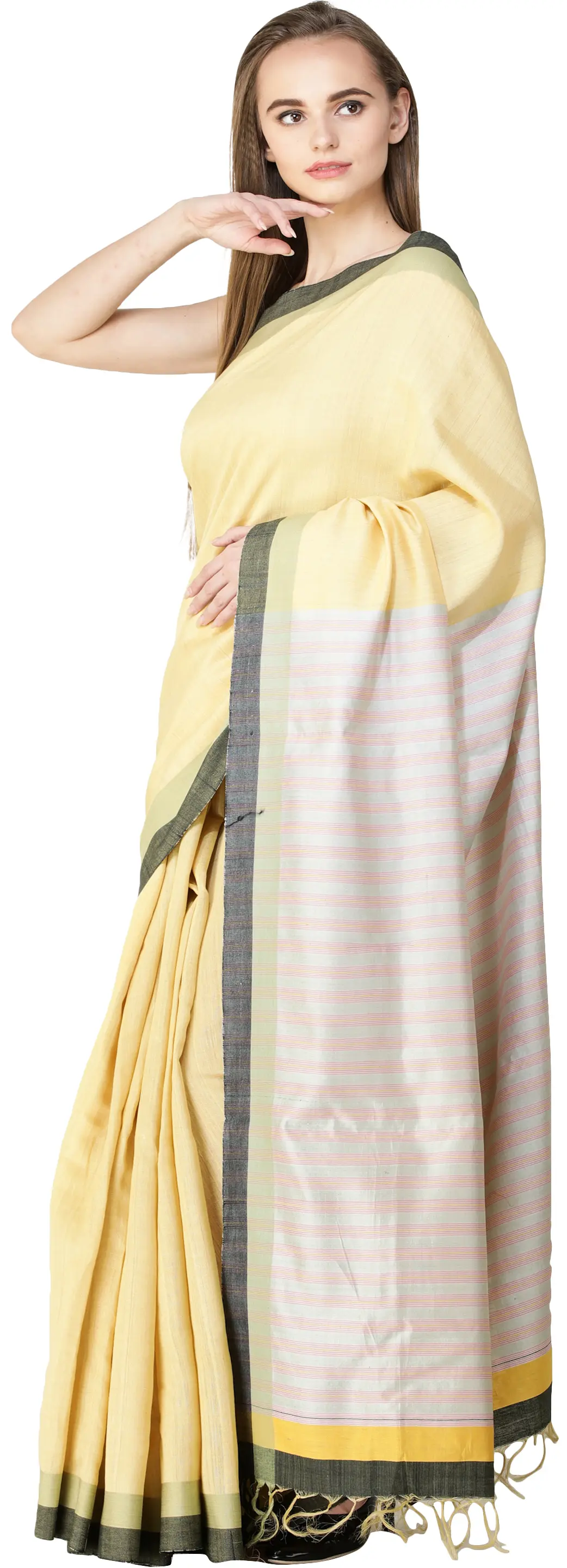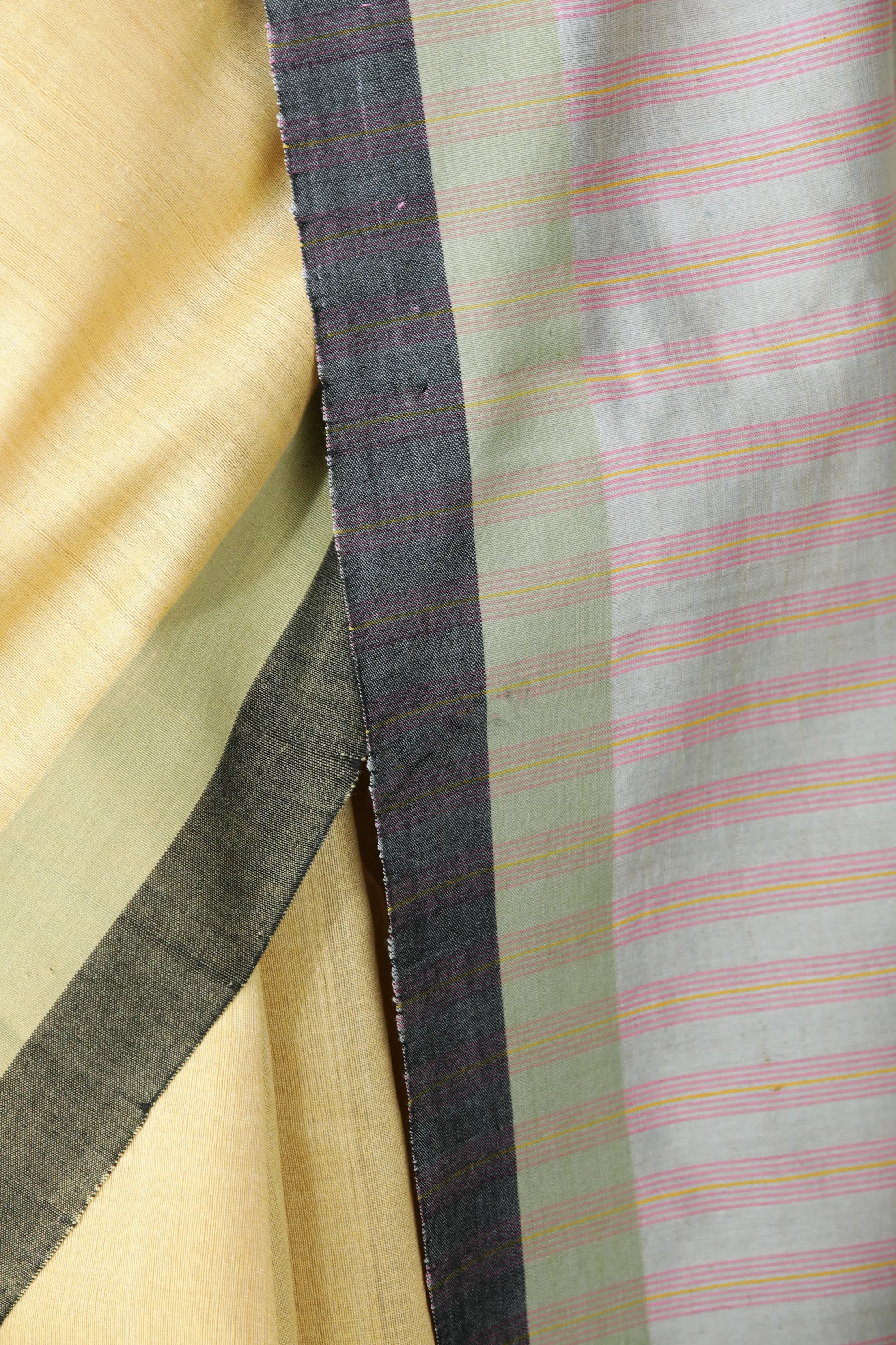 The Dusky-Citron Kosa Sari from Bengal is a masterpiece of grace and simplicity. Crafted from the exquisite Kosa silk, perfected by the skilled craftsmen of Bengal, it exudes an understated elegance. The subtle hue and minimal embellishments make it an ideal choice for formal occasions, where your taste in fashion speaks volumes. The woven stripes on the pallu add a touch of sophistication. When draped, it flows with a quiet confidence, allowing you to stand out effortlessly. This sari is a tribute to the artistry of Bengal and a testament to the notion that sometimes, less truly is more in the world of fashion.