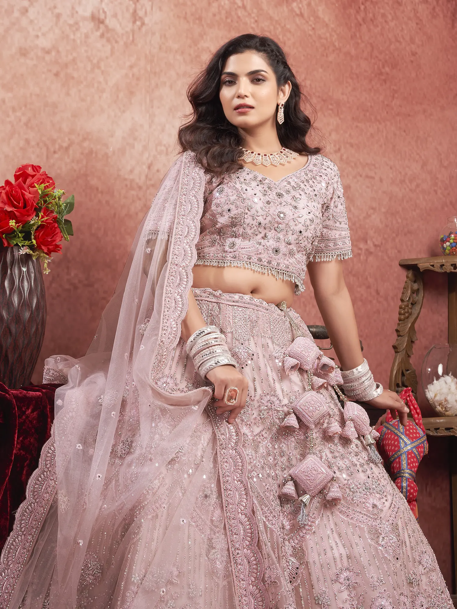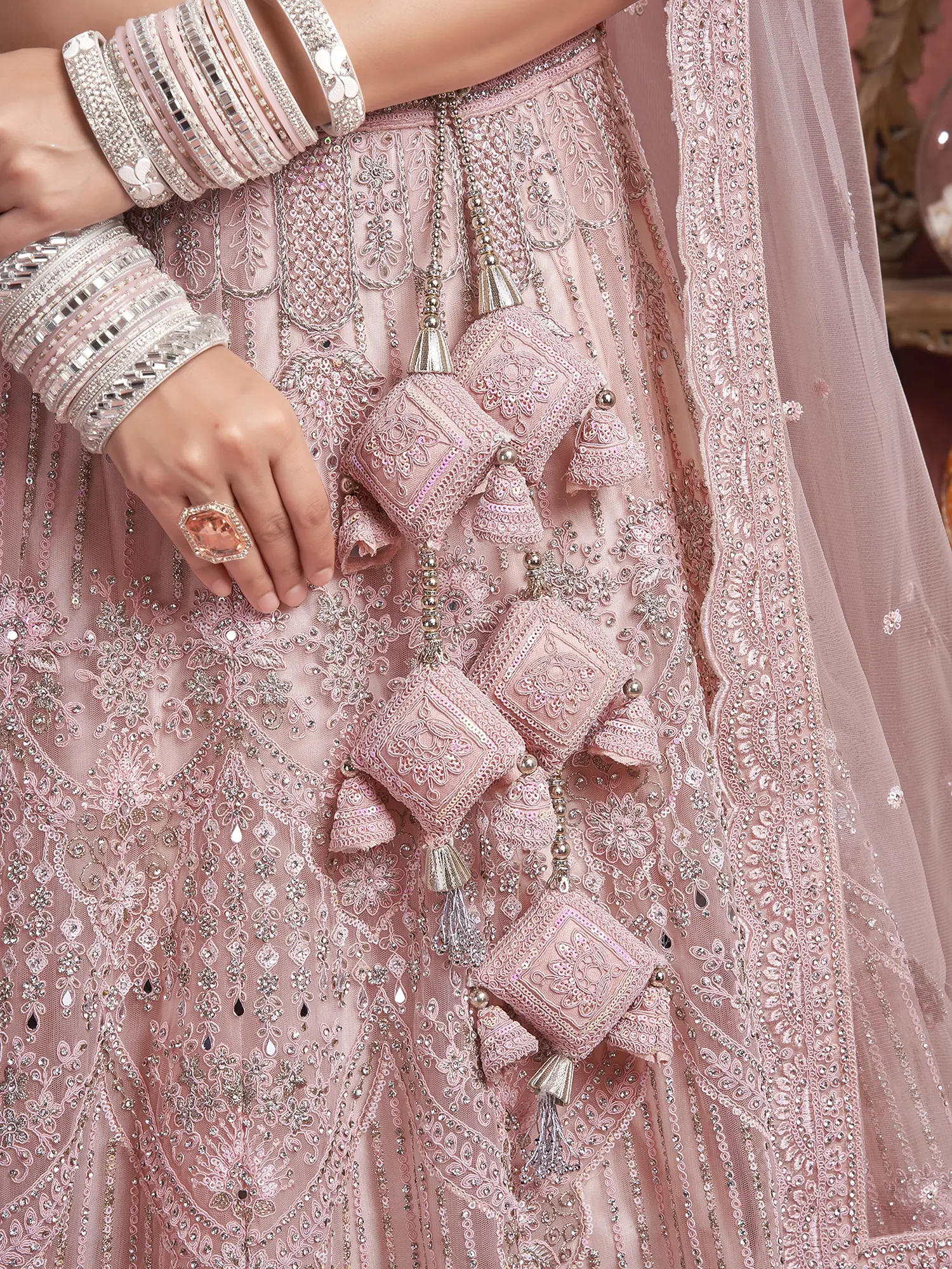 This dusty-pink bridal lehenga choli is an ode to the enduring beauty of traditional Indian bridal wear, reinterpreted for contemporary tastes. The combination of premium net fabric, the soft and romantic dusty-pink shade, and the dazzling mirror and zarkan handwork creates a look that is both classic and captivating. Whether you're walking down the aisle or attending a grand celebration, this lehenga is sure to turn heads and leave a lasting impression. It’s an investment in unforgettable style and cherished memories.