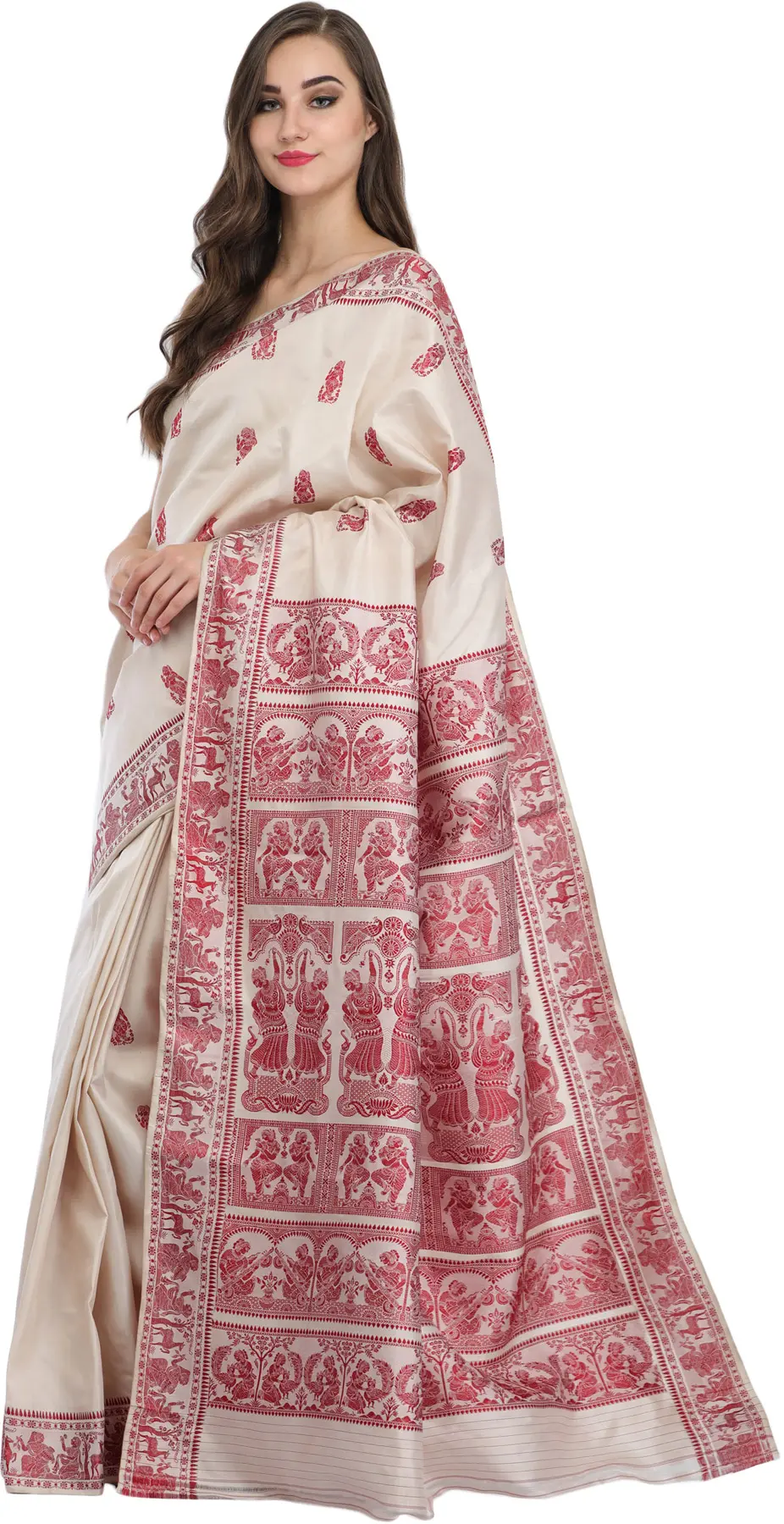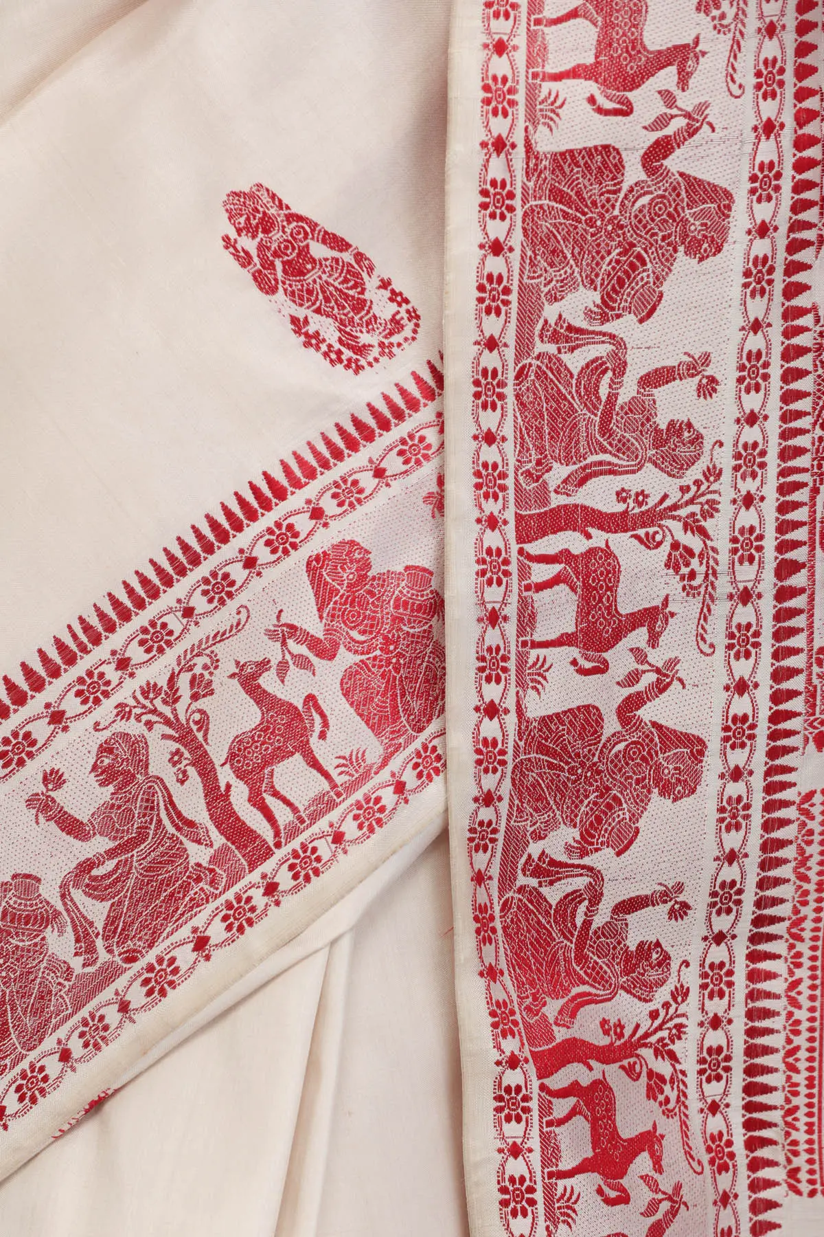 Dusty-White and Red Baluchari Sari from Kolkata Depicting Hindu Mythological Episodes