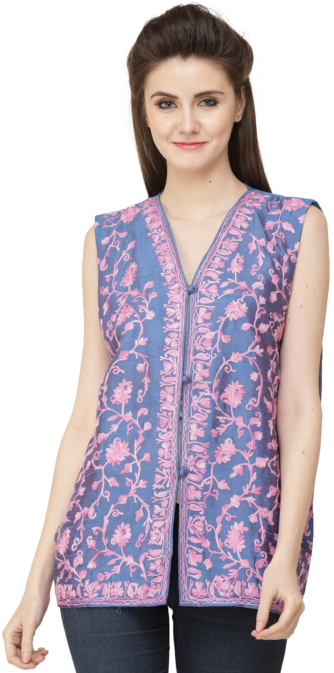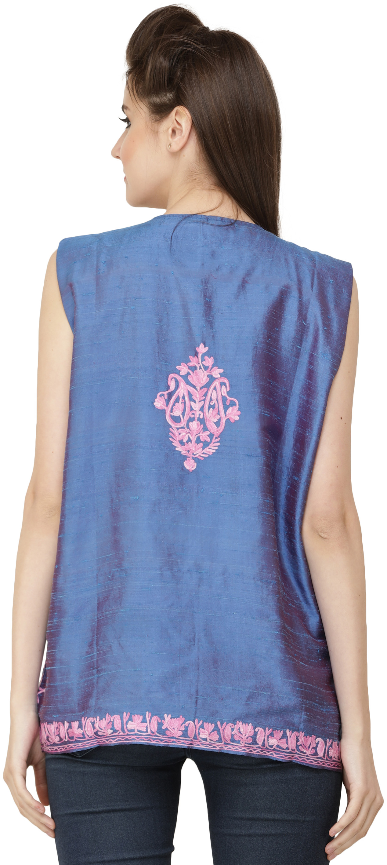 Dutch-Blue Waistcoat from Kashmir with Aari Embroidery in Pink Thread