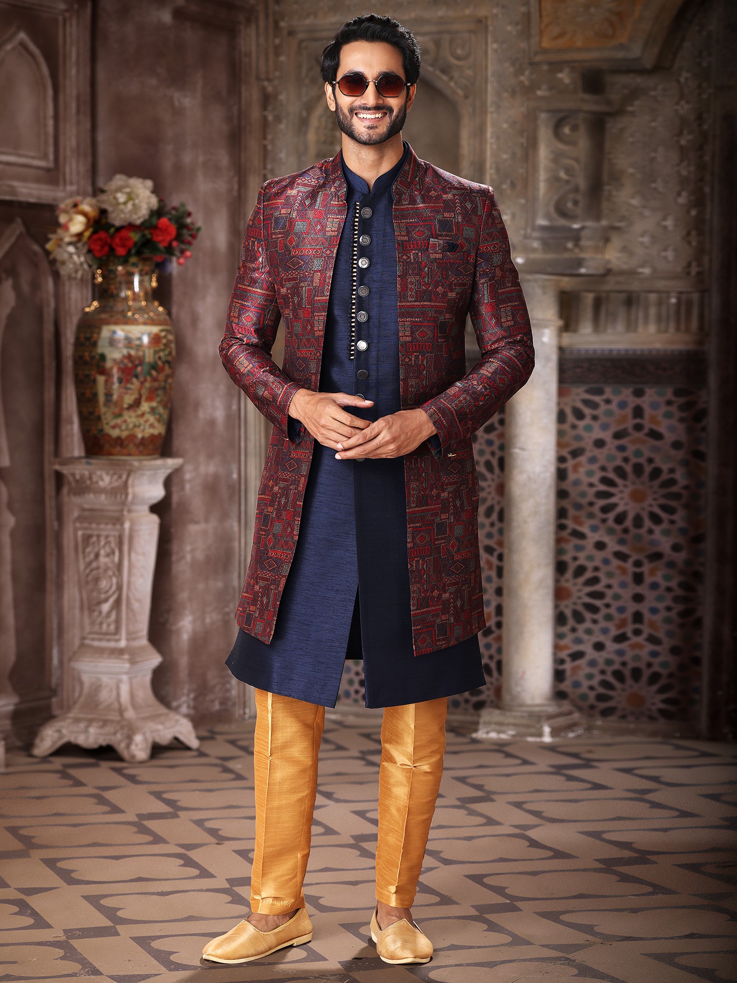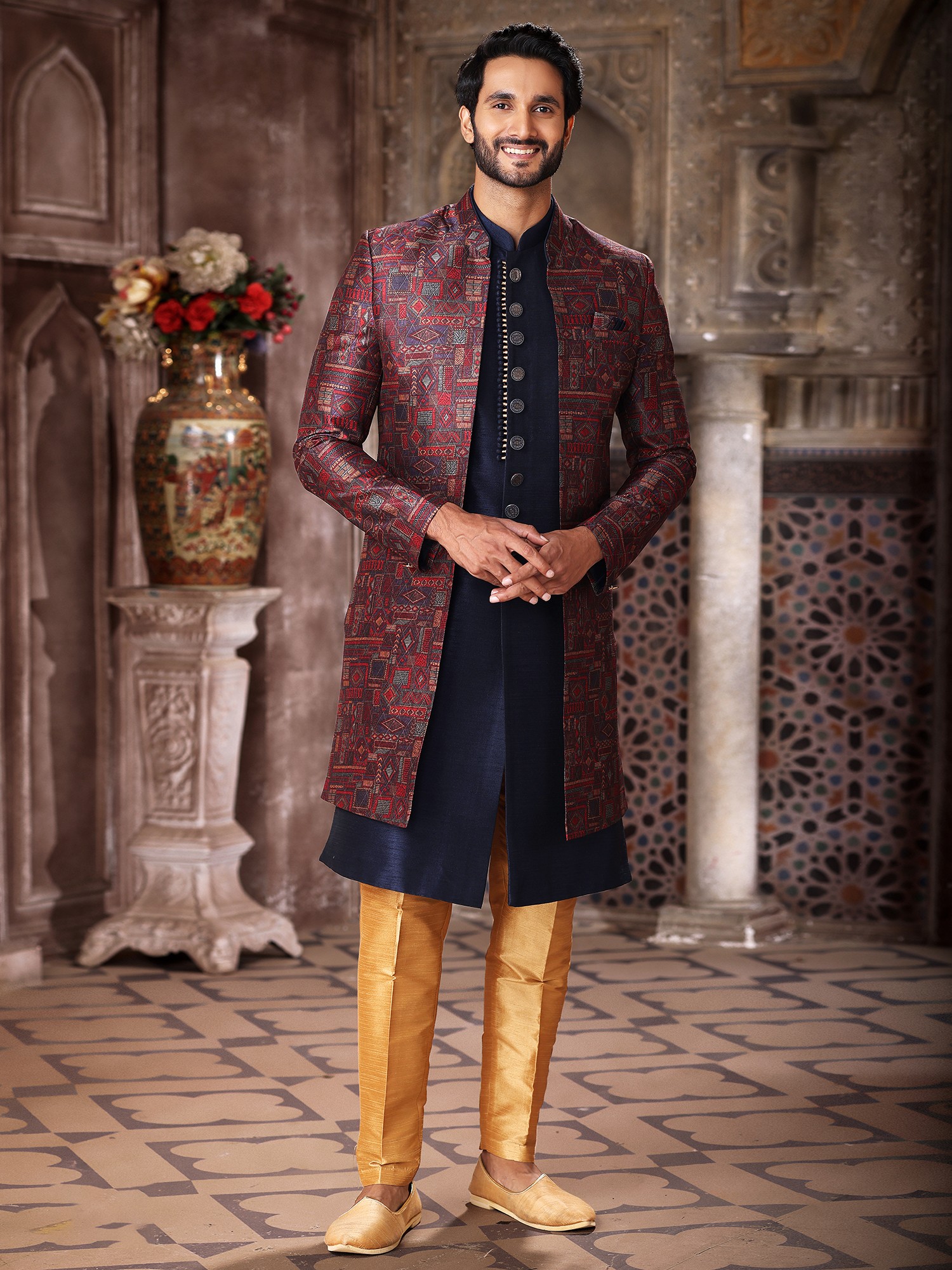 The rich, jewel-toned outer jacket is complemented by a deep navy inner kurta, creating a sophisticated contrast that highlights the intricate thread work. Paired with it are Aligarhi pants in a lustrous gold hue, offering a comfortable yet elegant silhouette. The detailed button placket on the kurta adds a refined finishing touch, showcasing an attention to detail that defines true luxury.