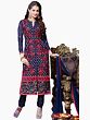 Complementing the ornate kameez are the sleek, dark navy churidar bottoms. Tailored for a comfortable and flattering fit, these bottoms provide a smooth canvas that allows the embroidered kameez to truly shine. The contrast between the richly decorated top and the understated bottoms creates a balanced and visually appealing outfit, perfect for a variety of occasions.
