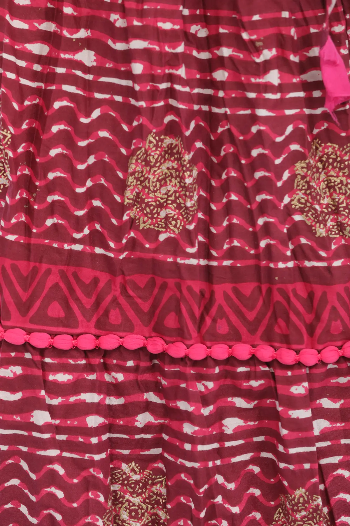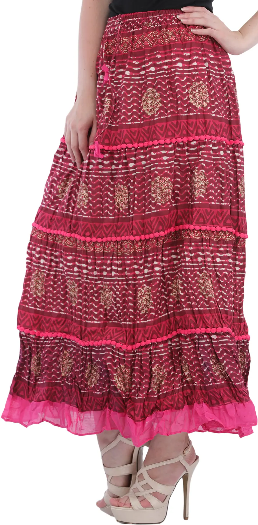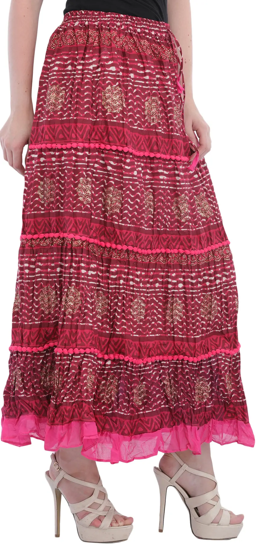 Tailored in the style of classic ethnic Ghaghara skirts, this long skirt is an appealing statement of your love for traditional Indian style. The effortless flow of pure cotton lends the skirt a graceful length, which is covered in beautiful ethnic motifs and printed stripes, that infuse it with a gorgeous ethnic allure.