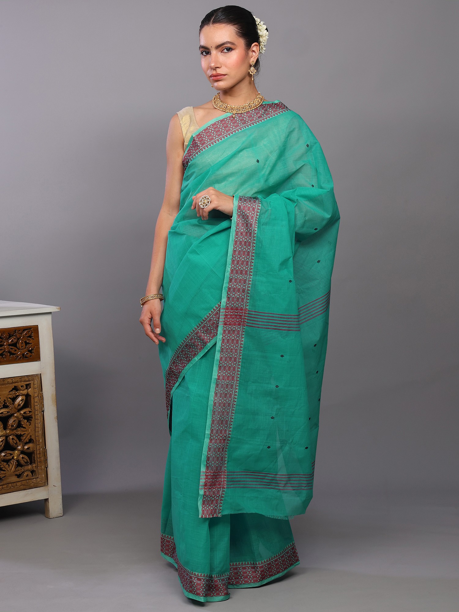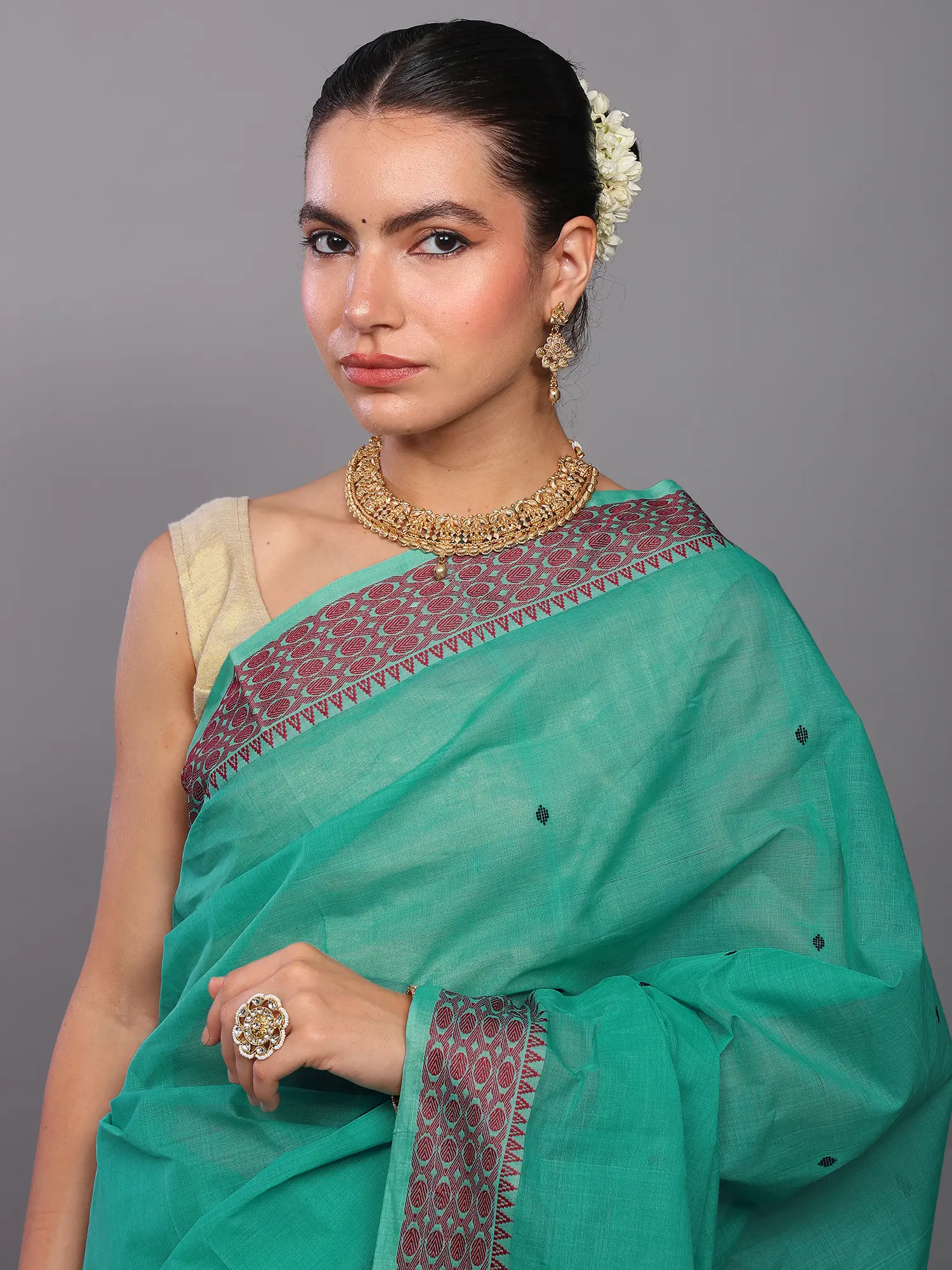 Dark-Cheddar Bootis Woven Cotton Saree with Stripes and Paisleys Border