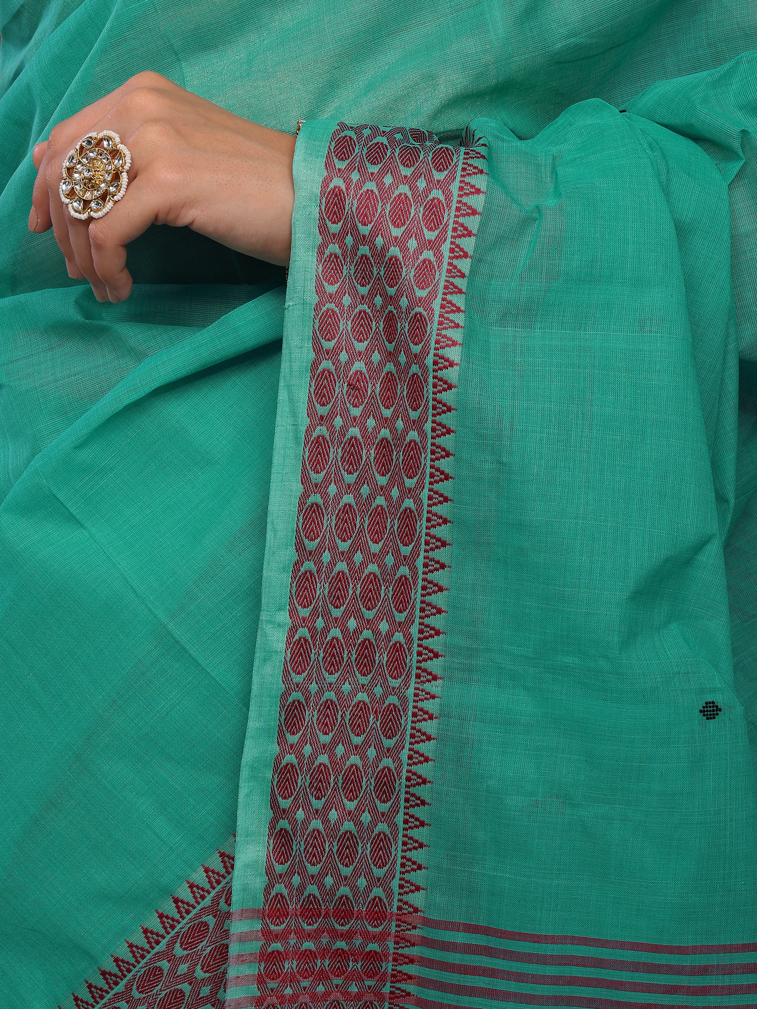 Tri-Color Pure Cotton Temple Border Saree from Sambalpur with All Over Ikat Woven