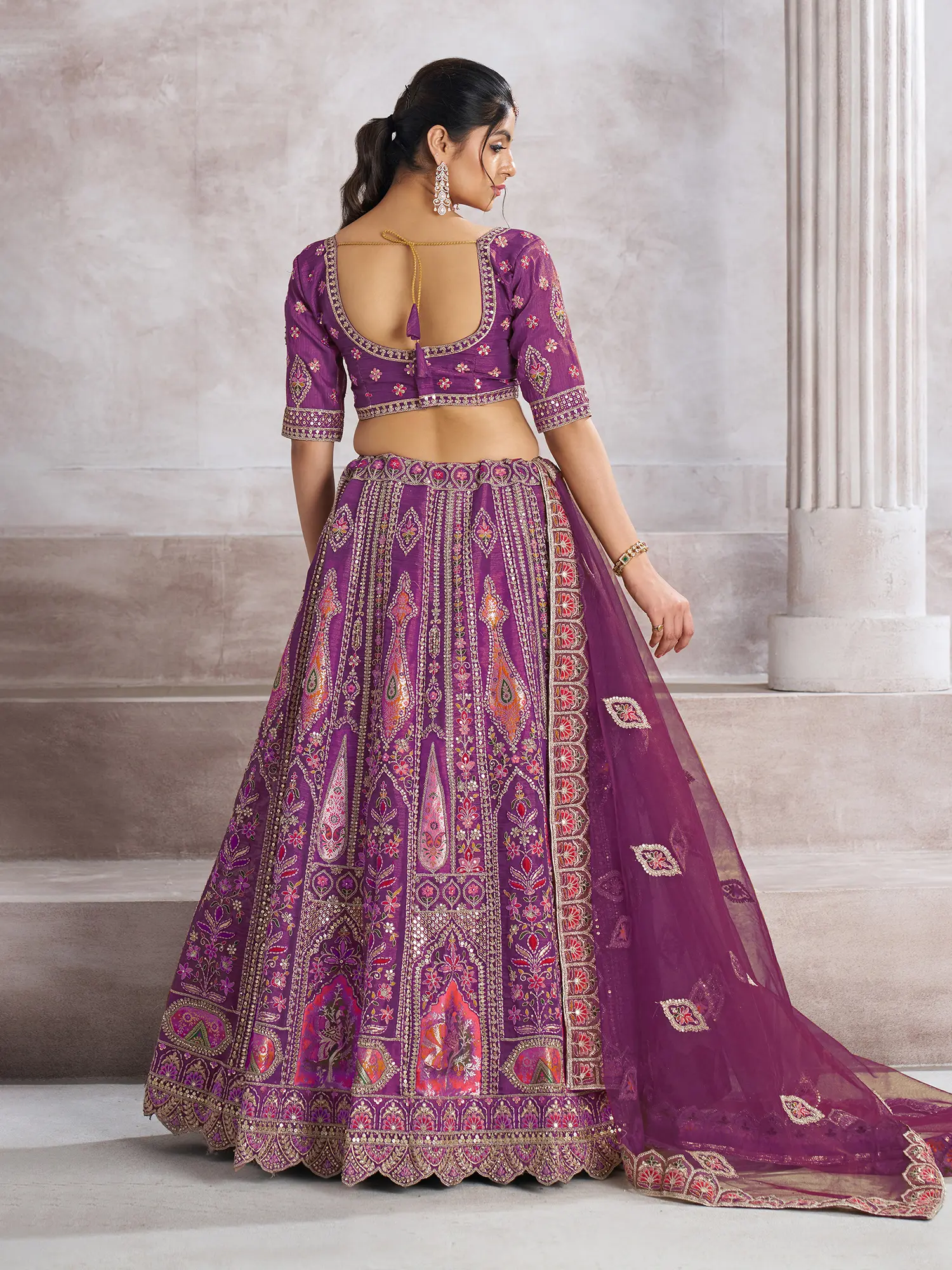 This lehenga choli is a celebration of traditional craftsmanship and timeless elegance, designed to make you the center of attention at any wedding or special occasion. The rich, vibrant purple hue exudes royalty and sophistication, while the intricate detailing adds a touch of artistry. The ensemble is a harmonious blend of classic design and modern sensibilities, perfectly suited for the contemporary woman who appreciates heritage. The choli, or blouse, features a flattering V-neckline and short sleeves, offering a comfortable and stylish fit. The blouse is adorned with elaborate ari and patch work embroidery, showcasing floral motifs and delicate patterns. This intricate handwork lends a luxurious texture and a captivating visual appeal, highlighting the skill of the artisans who crafted it.