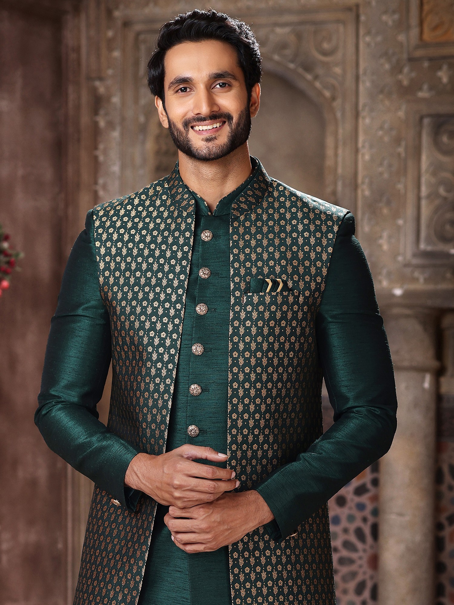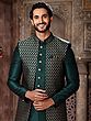 Crafted from lustrous art silk, each element of this ensemble showcases an exceptional commitment to quality and artisanal detail. The rich, deep green of the kurta and waistcoat is adorned with an intricate brocade pattern in a contrasting gold, meticulously woven to create a subtle yet captivating texture. You'll appreciate the fine stitching and the precise cut, a testament to the skill and dedication of our artisans, ensuring a garment that feels as exquisite as it looks.