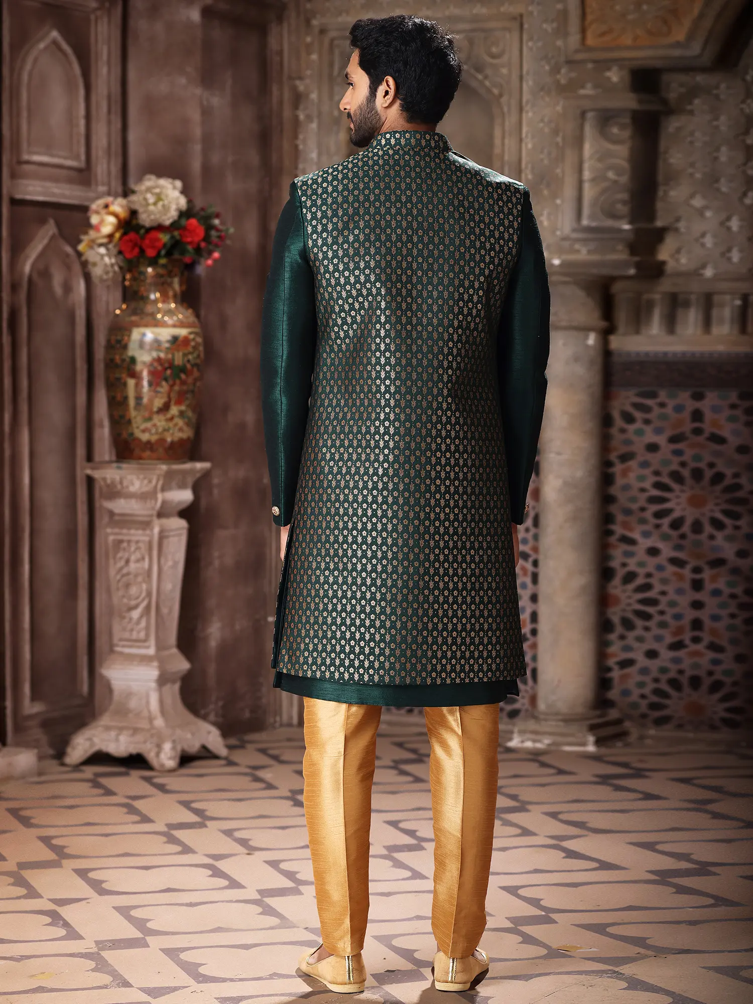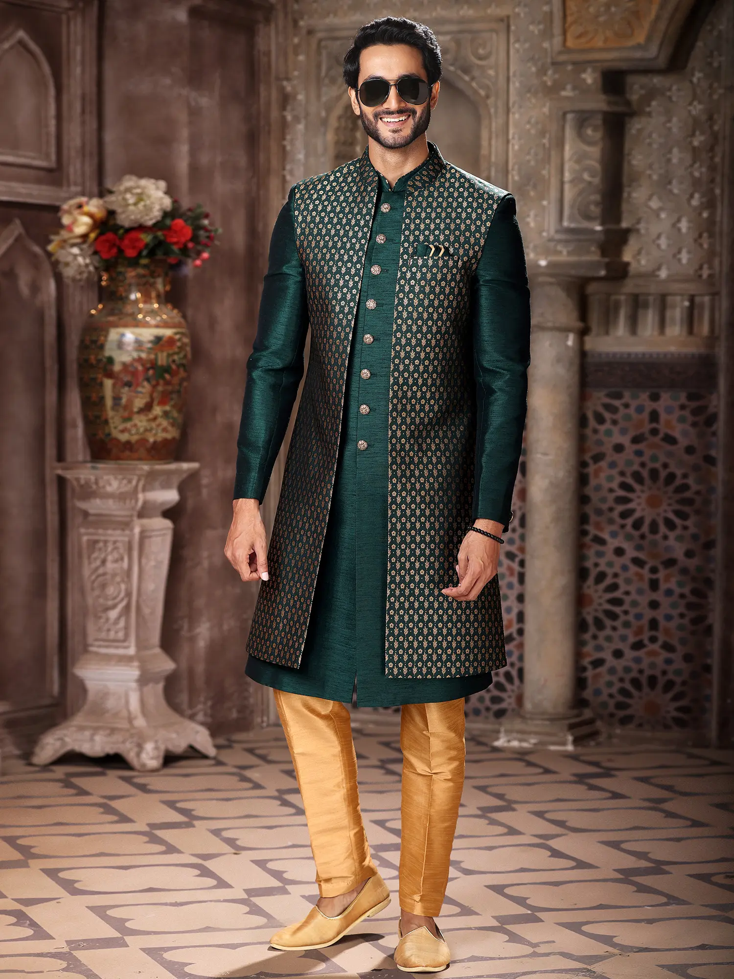 This attire draws inspiration from a rich cultural tapestry, embodying the spirit of Indian ceremonial dressing. The confluence of opulent fabric, traditional motifs, and contemporary tailoring creates a piece that is both rooted in history and perfectly suited for the modern connoisseur. It represents a heritage of sartorial excellence, passed down and refined to offer you an experience of enduring luxury.