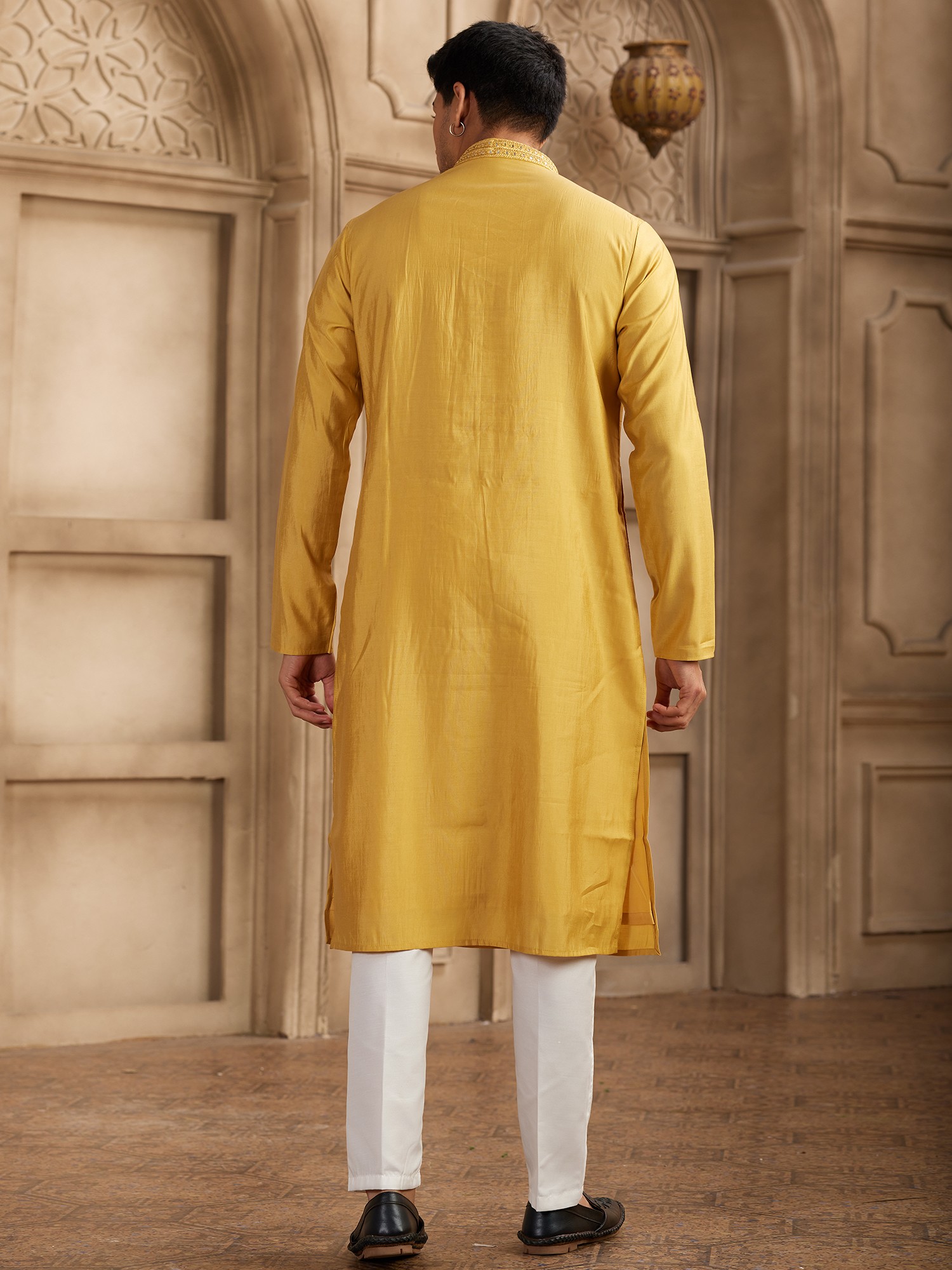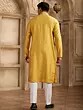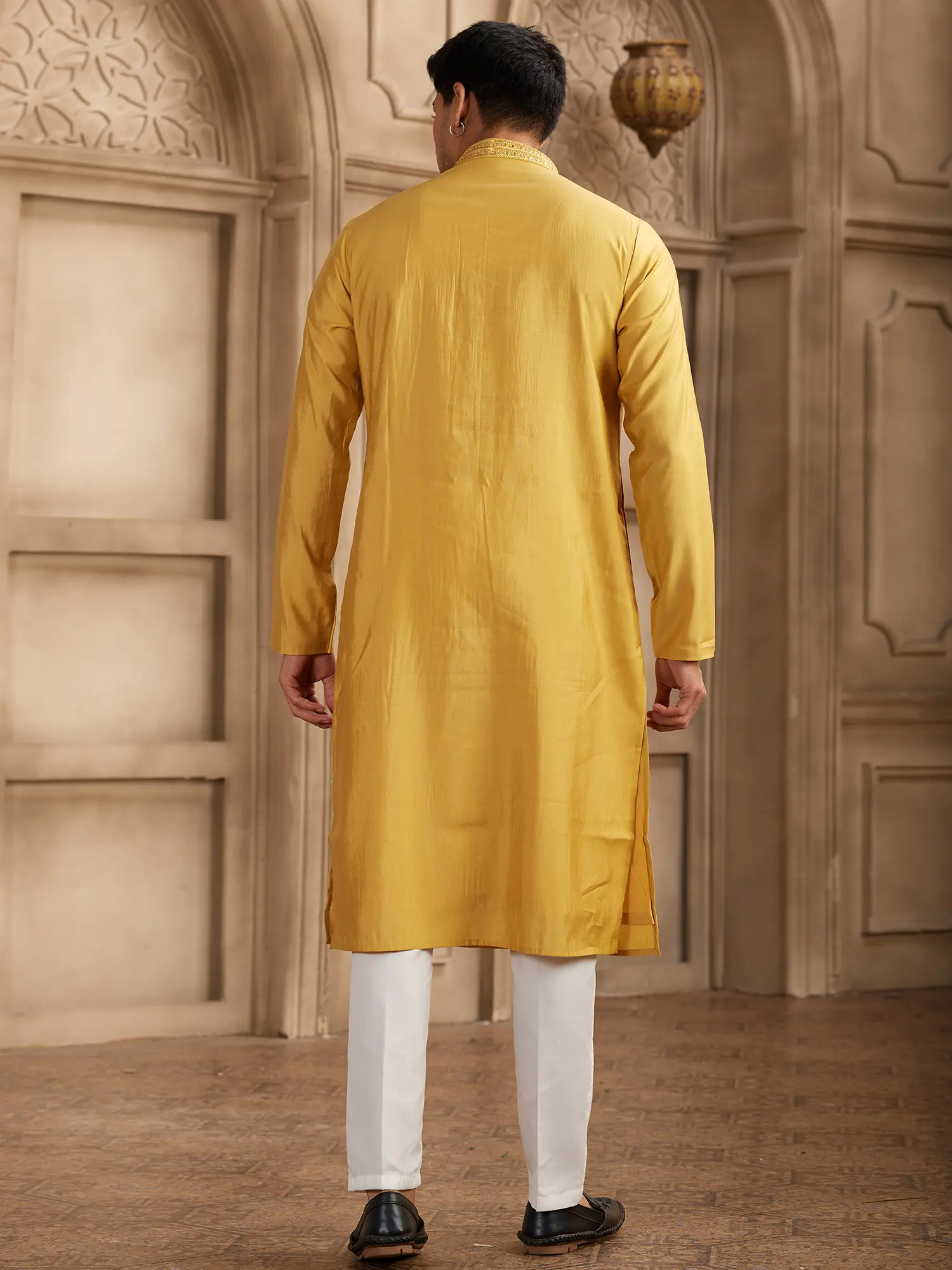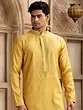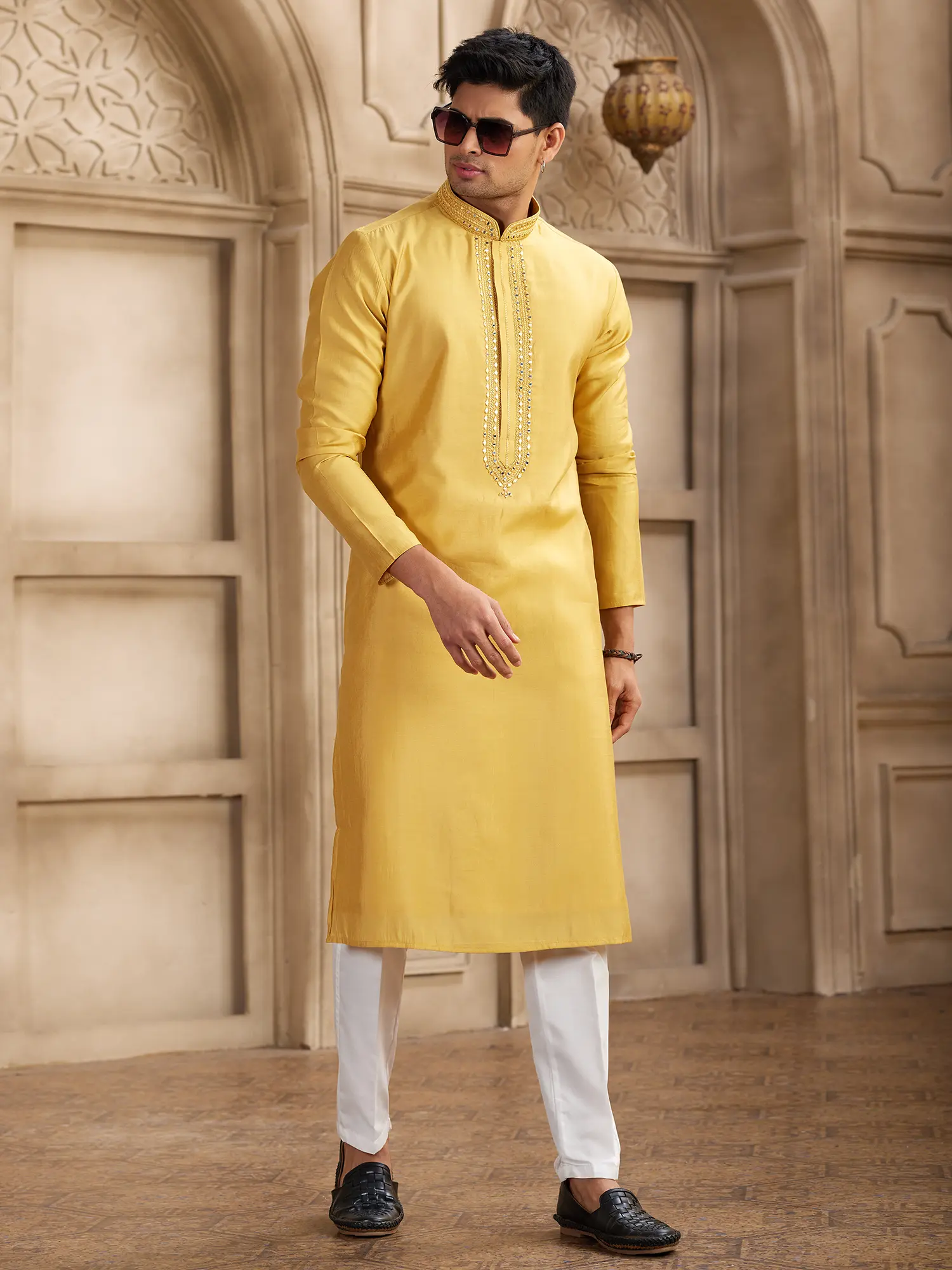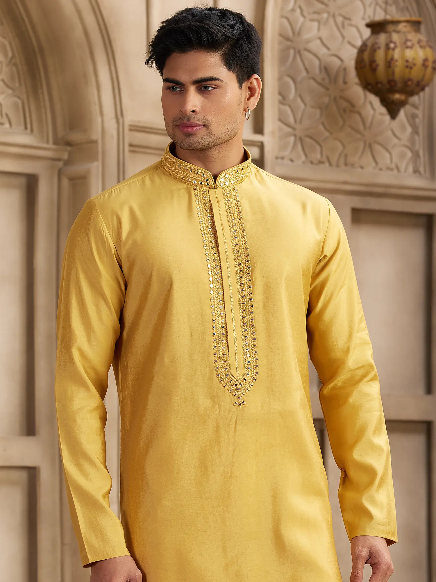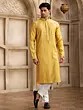 Discover a timeless blend of tradition and contemporary style with this exquisite men's kurta pajama set. Crafted from luxurious Banarasi Art Silk, this ensemble radiates sophistication and is designed to make you the center of attention at any special occasion. The rich, lustrous fabric drapes beautifully, offering a comfortable yet regal feel against the skin. Its vibrant sun-kissed yellow hue evokes warmth, joy, and auspiciousness, making it a perfect choice for celebrations that call for a touch of opulence. ––––––––––