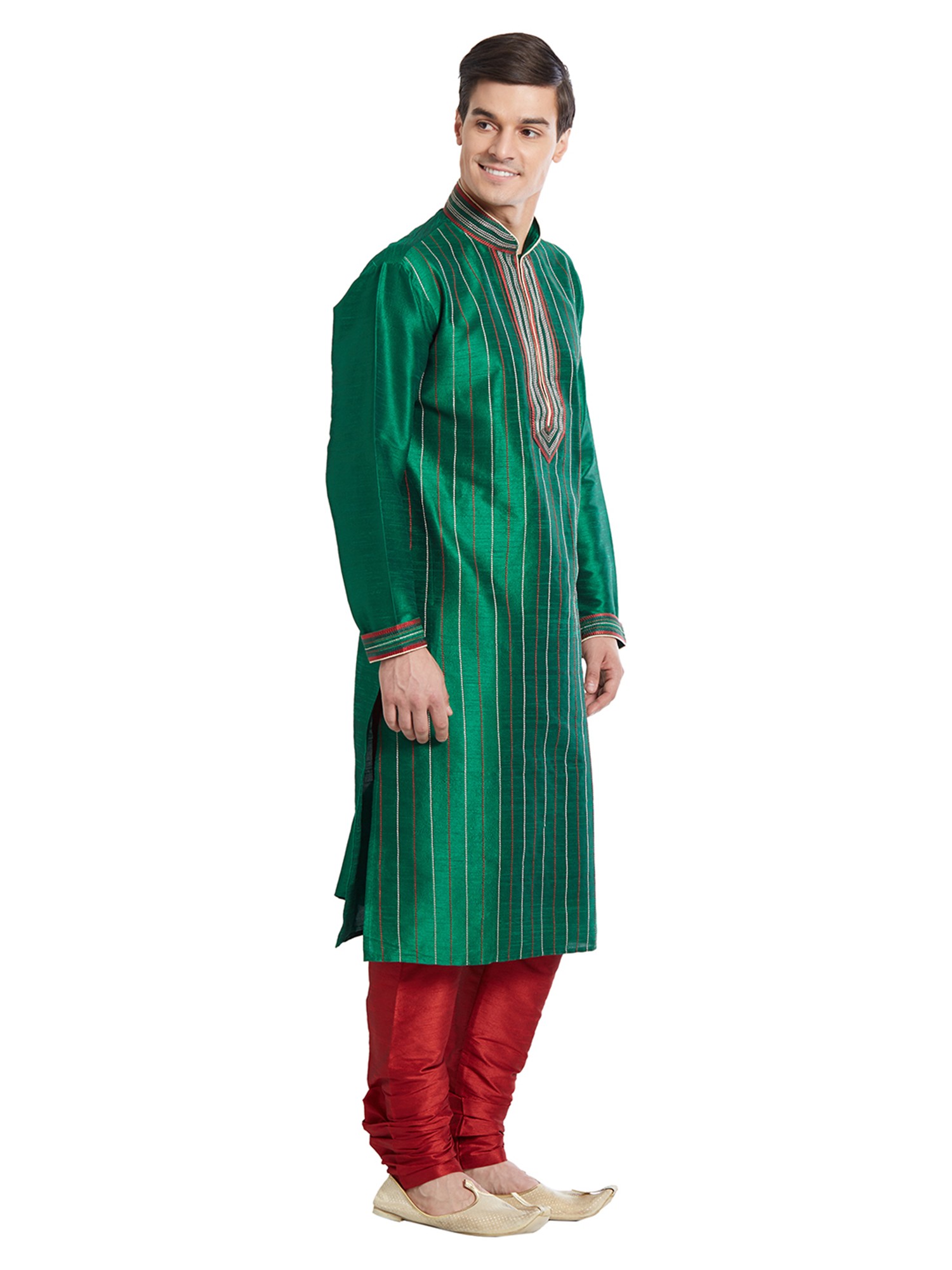 Men's Art Silk Kurta Pajama Set with Vertical Stripes and Contrast Stitching