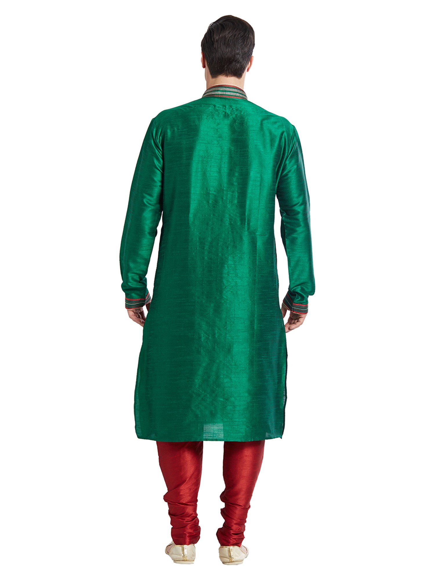 Crafted from luxurious art silk, this ensemble offers a captivating sheen and a silken touch that whispers of opulence. Each stitch is meticulously placed, reflecting a dedication to superior tailoring and enduring quality. You'll appreciate the subtle vertical pinstripe detailing, artfully interwoven with threads of rich maroon, adding a depth and dimension that elevates the visual appeal. The collar and cuffs are adorned with intricate embroidery, a testament to artisanal craftsmanship that speaks volumes about its heritage.