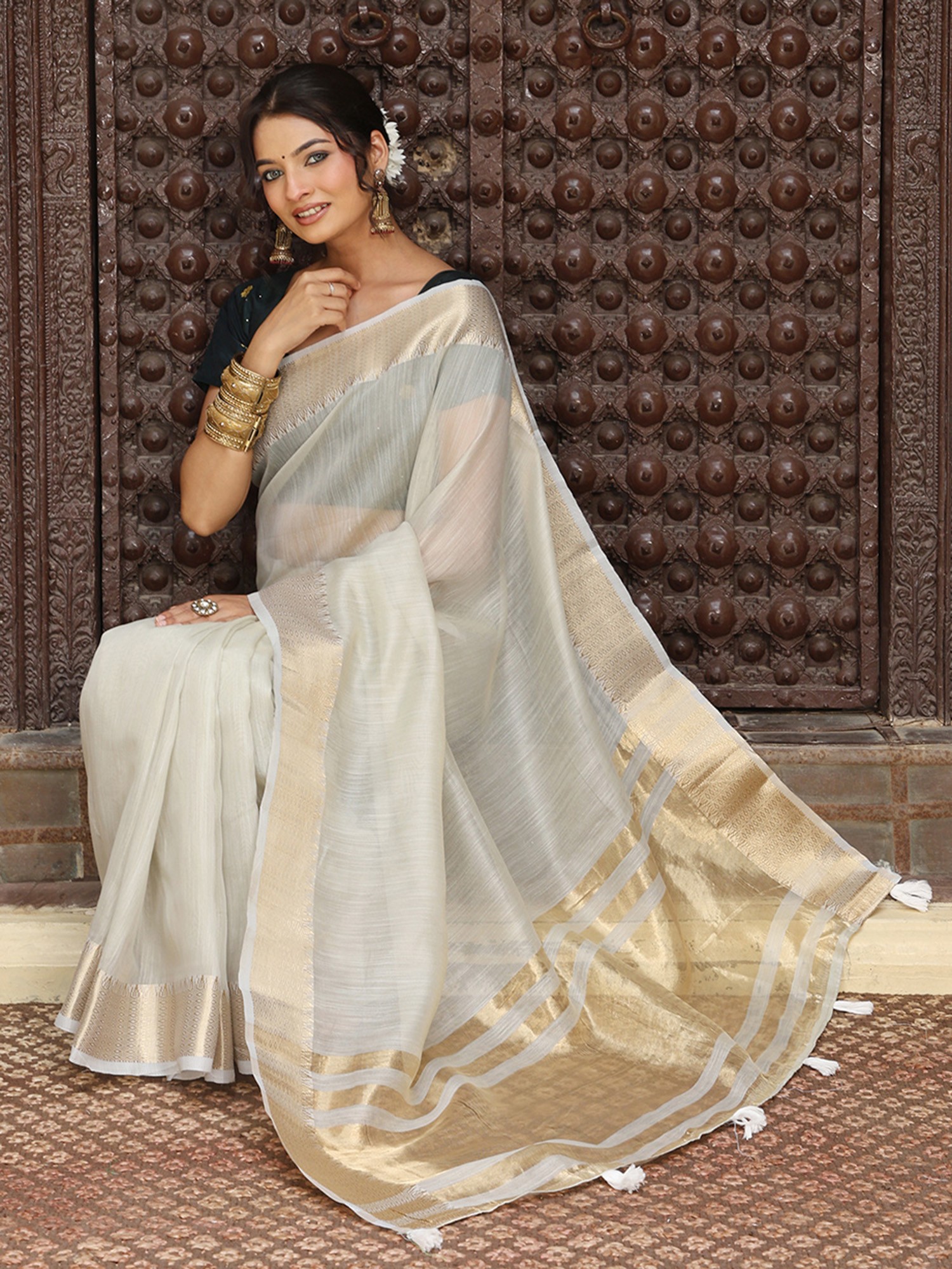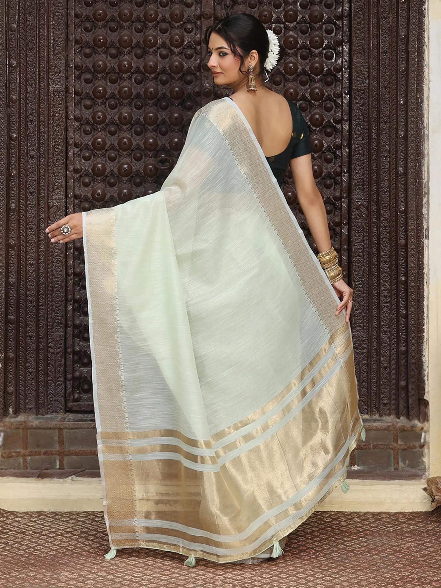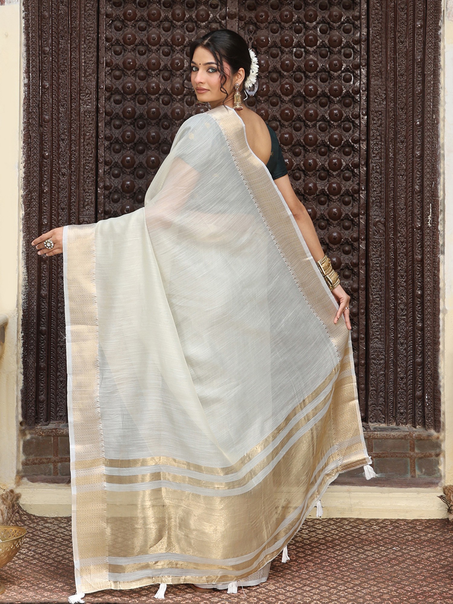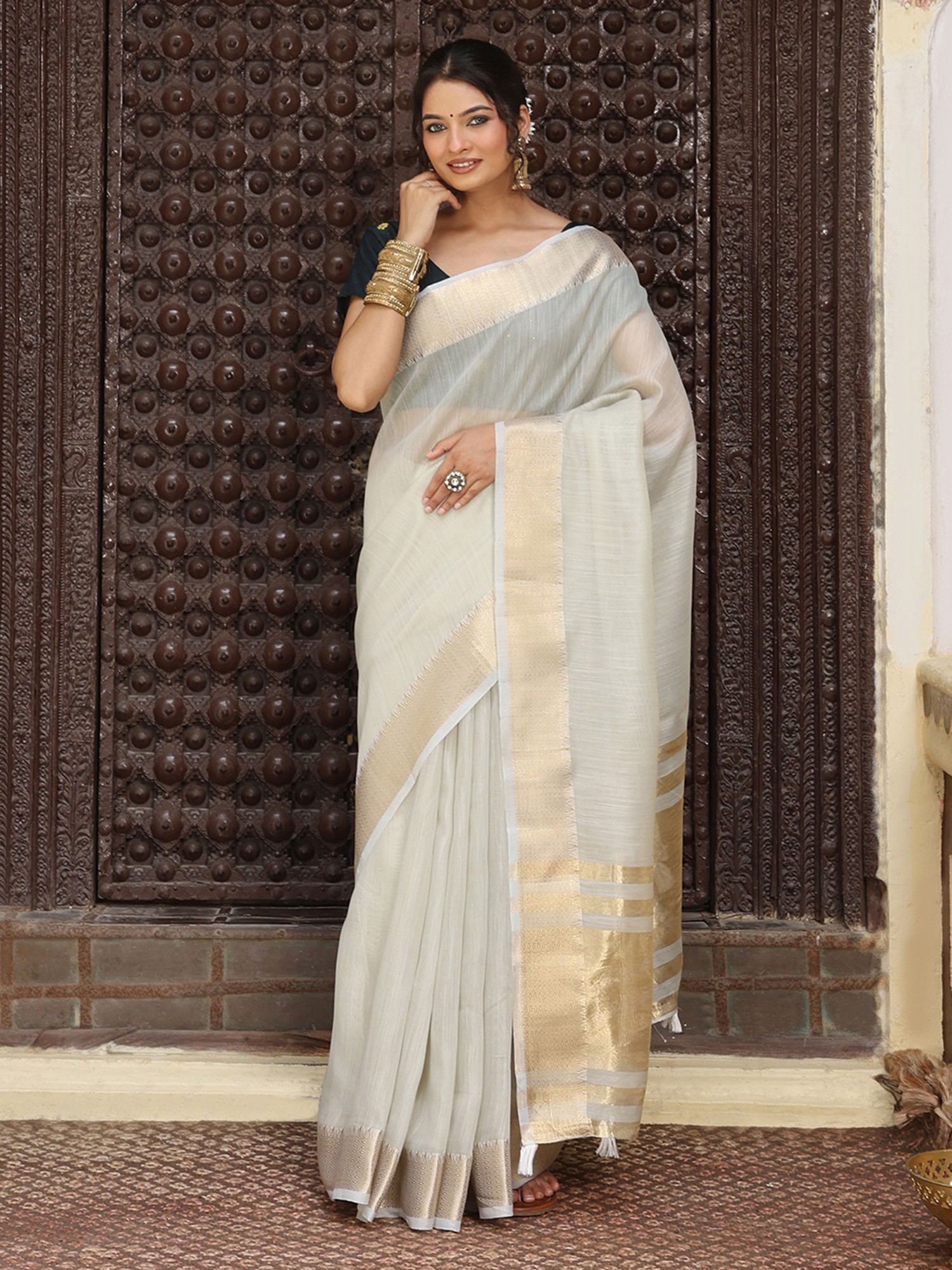 You'll appreciate the delicate golden border that graces the edges, providing a touch of opulence without overwhelming the inherent elegance of the material. This subtle detailing catches the light, adding a radiant shimmer that enhances your natural radiance. The accompanying blouse, designed to be tailored to your precise measurements, ensures a flawless and personalized fit.