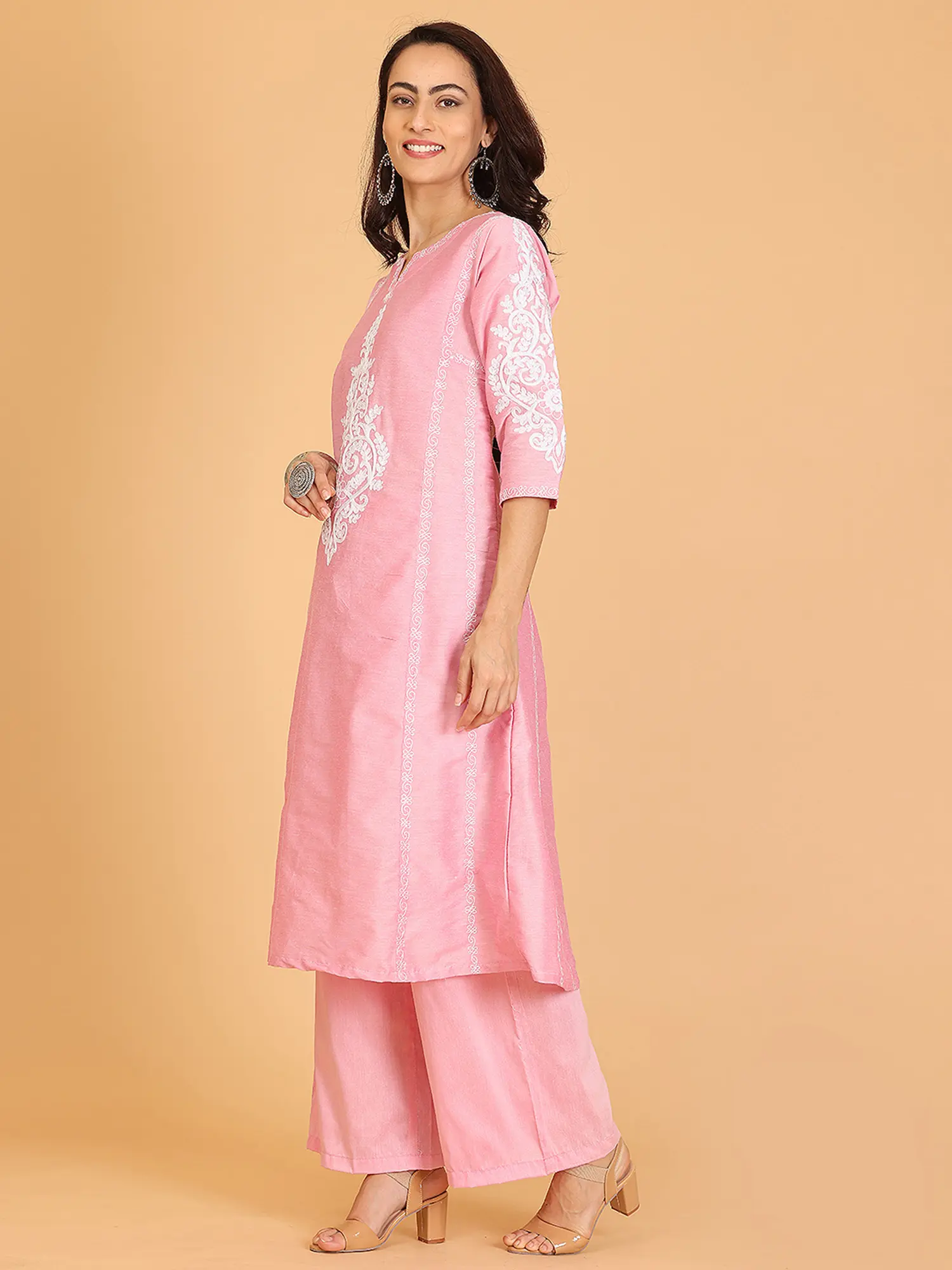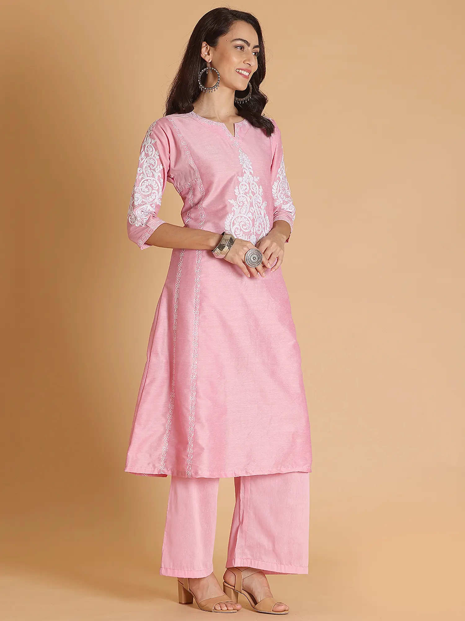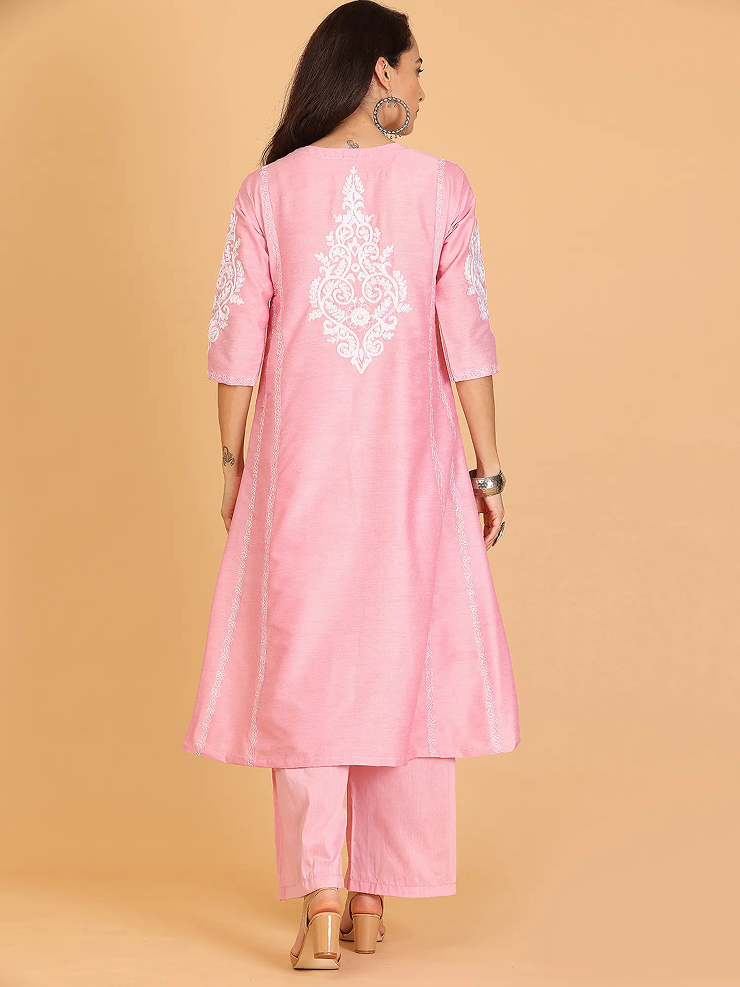 Faded-Pink Viscose Chanderi Embroidery Work Elegant Kurta Set With Matching Dupatta