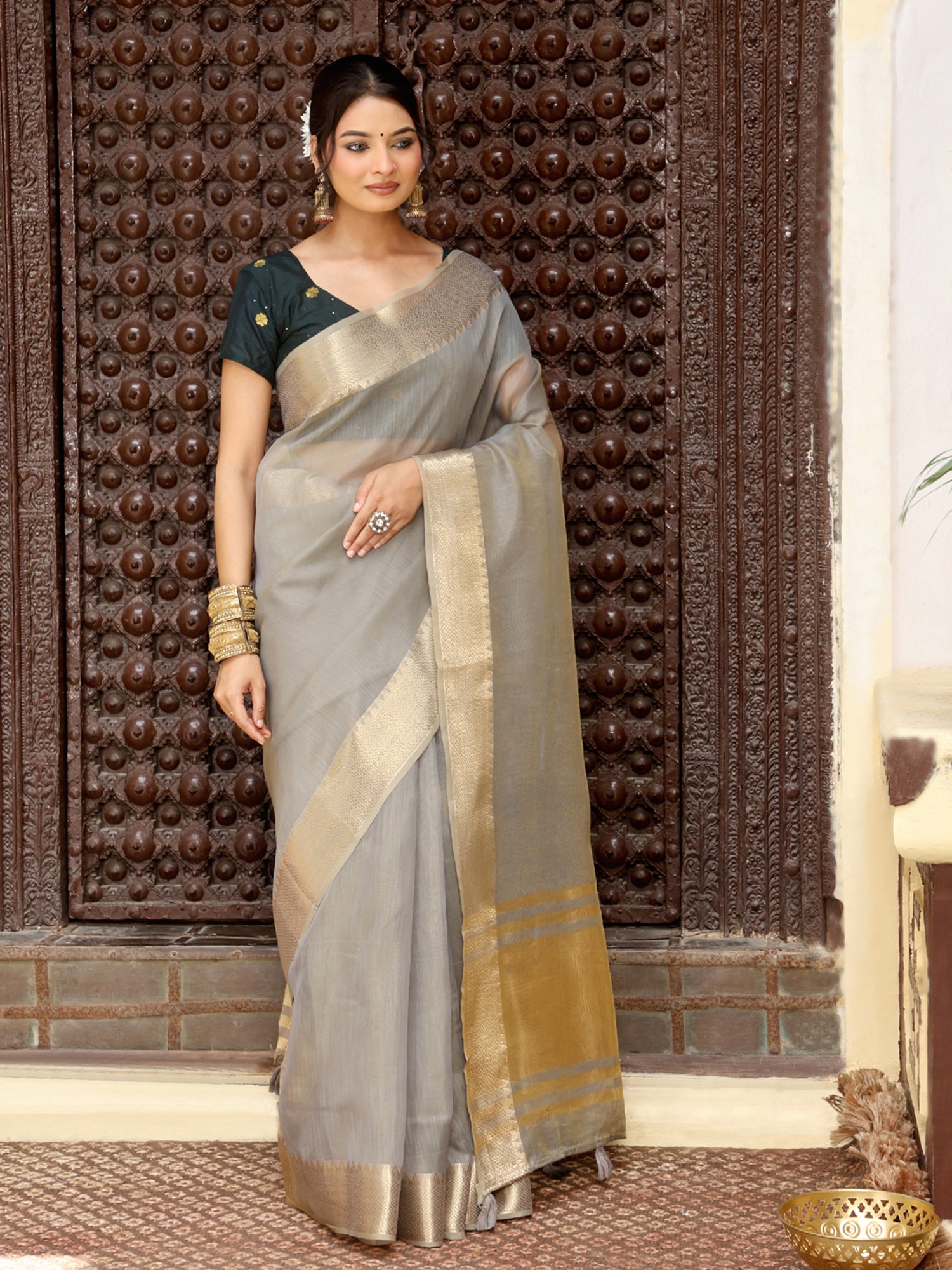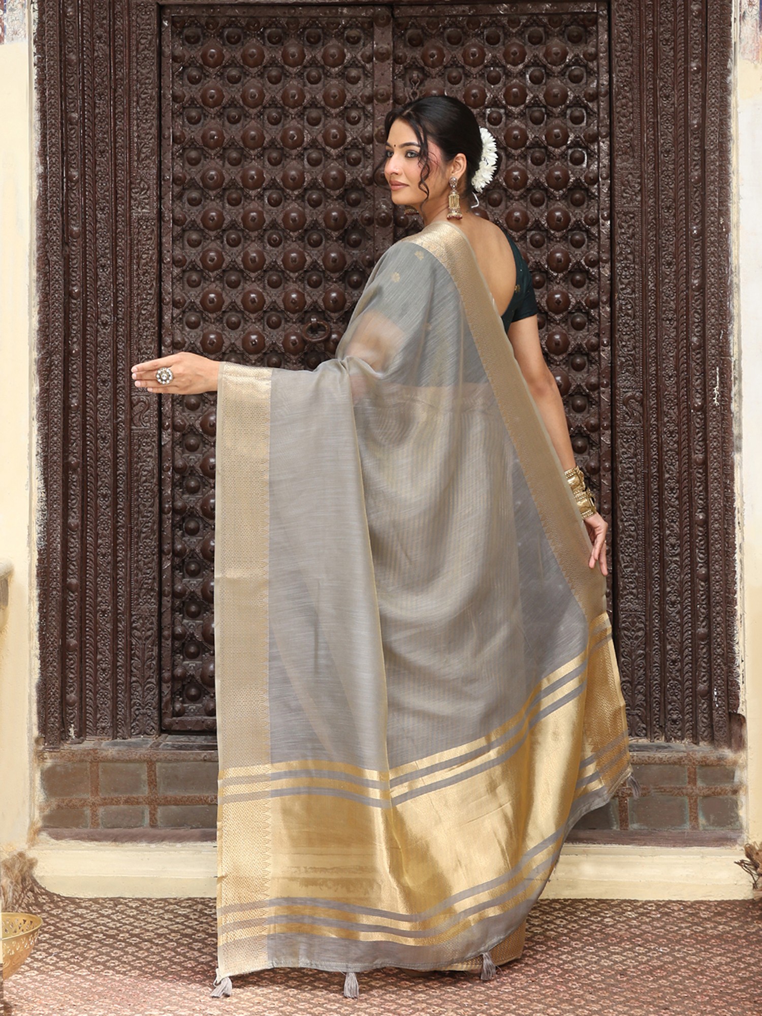 Admire the subtle yet striking beauty of the rich, tonal grey fabric, thoughtfully complemented by a broad border featuring traditional motifs woven in lustrous gold threads. The pallu, a testament to classic design, cascades with refined elegance, adding a graceful flourish to your silhouette. You’ll appreciate the breathable nature of the premium cotton, ensuring comfort without compromising on its opulent appearance, making it a joy to wear throughout your celebrations.