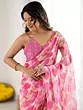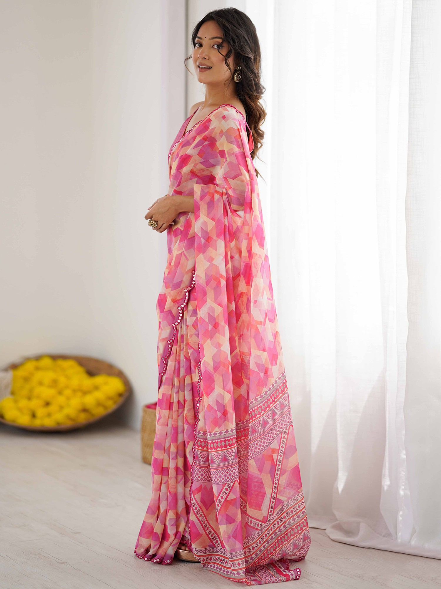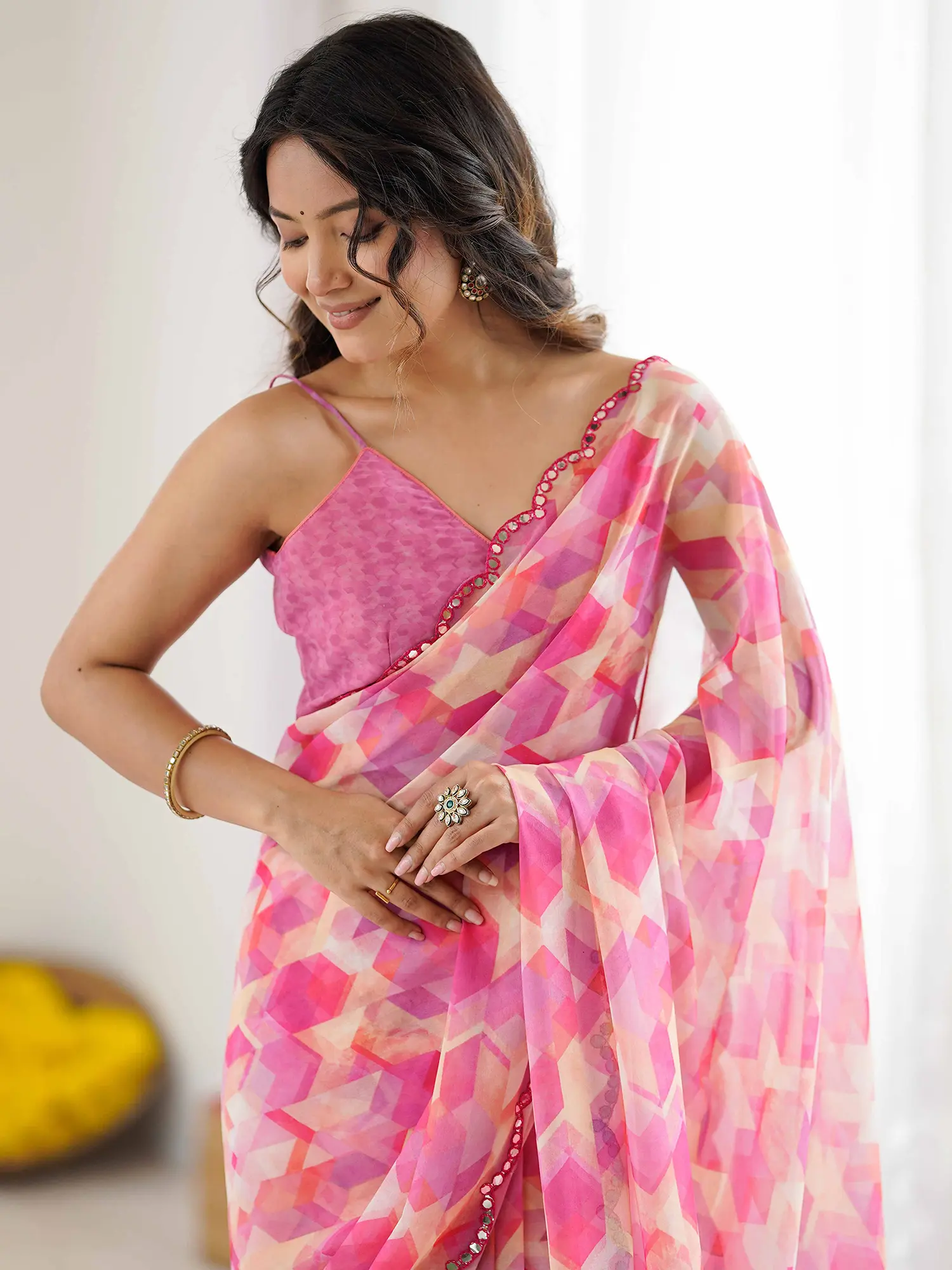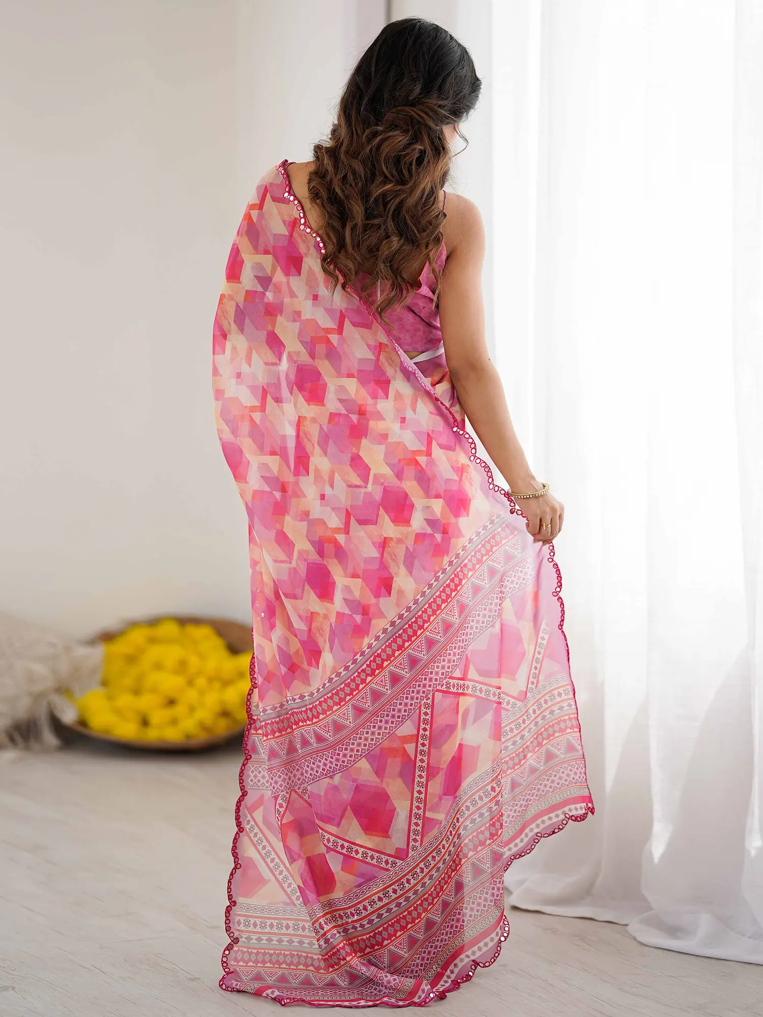 Adorn yourself in a mesmerizing geometric pattern, a symphony of soft pinks and peaches that captures the very essence of celebration. The edges are artfully finished with a delicate mirror-cut work, scattering light with every graceful movement. This intricate detail, combined with the flowing nature of the georgette, creates a silhouette that is both captivating and utterly refined, ensuring you command attention.