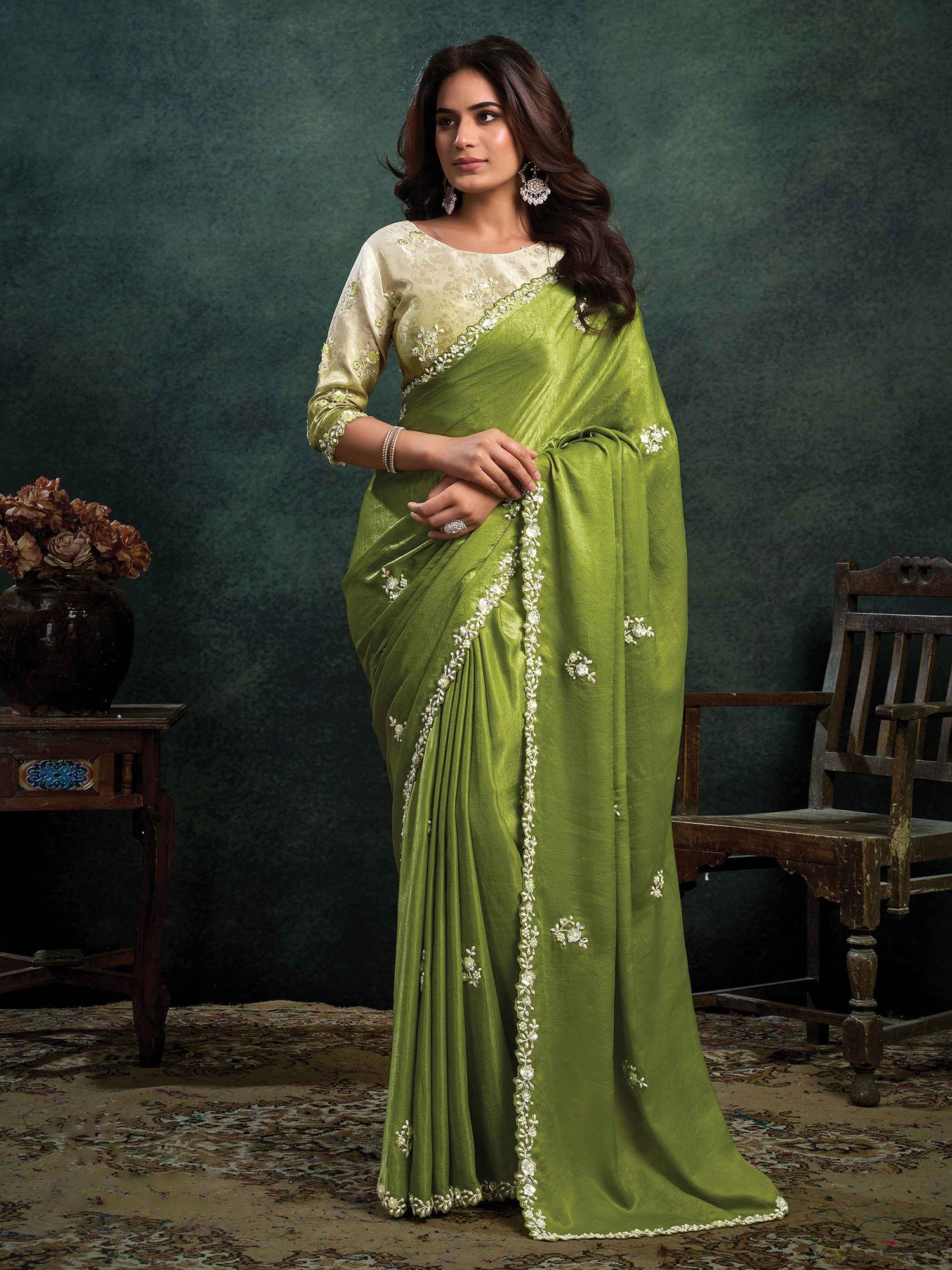 Elegant Designer Two Tone Satin Silk Saree With Dual Sequins Embroidery Pearl Stone And Handwork Party Wear Saree For Women