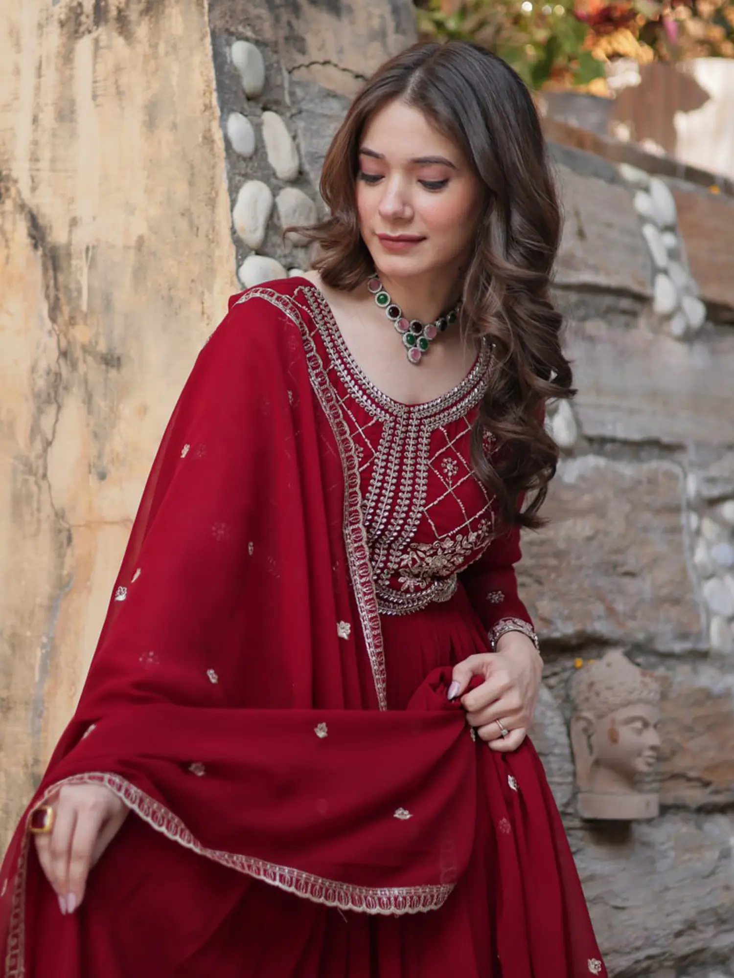 Luxurious Chinon Fabric Gown With Flowing Nazmeen Dupatta Showcasing Heavy Embroidered Detailing