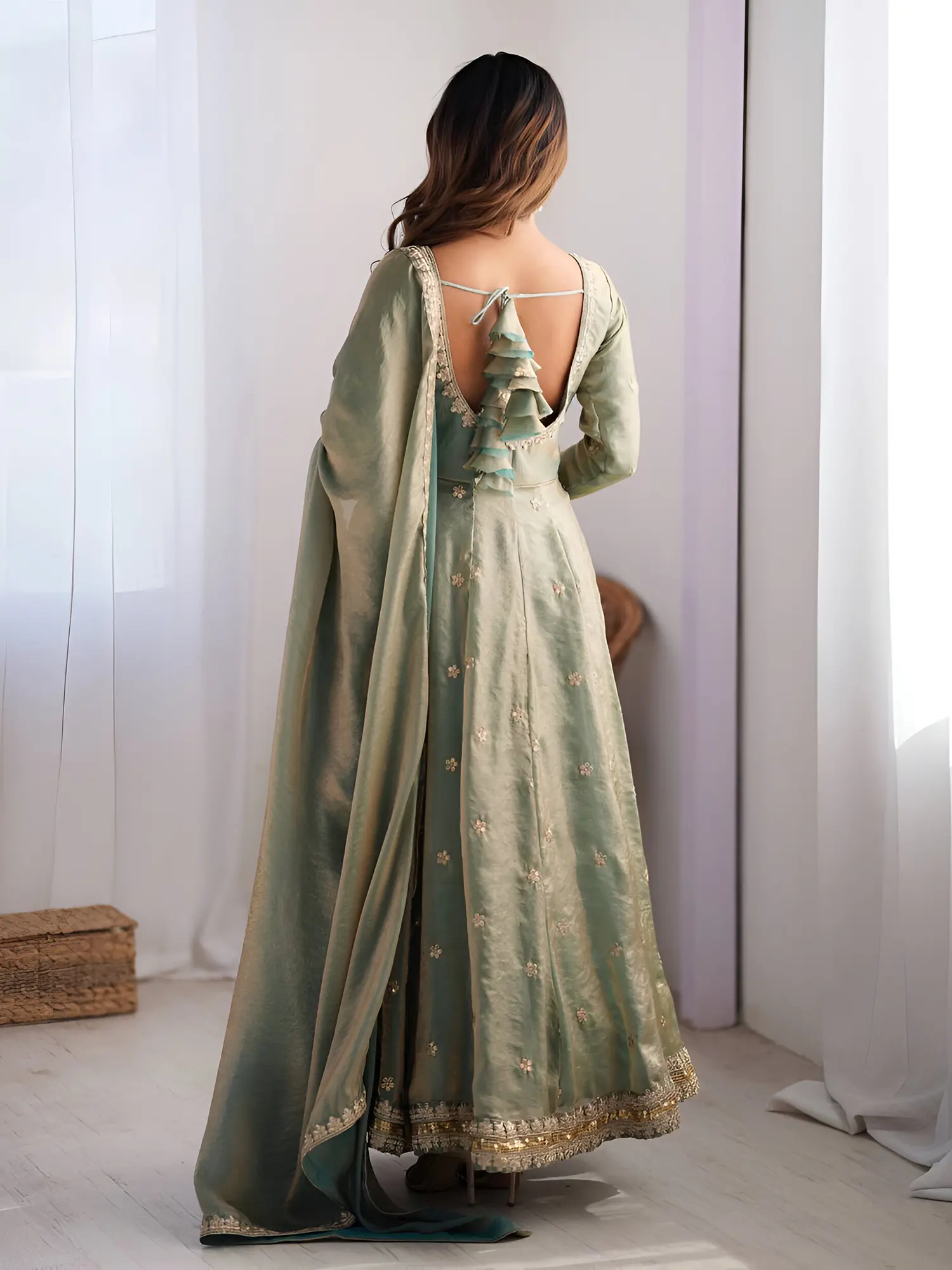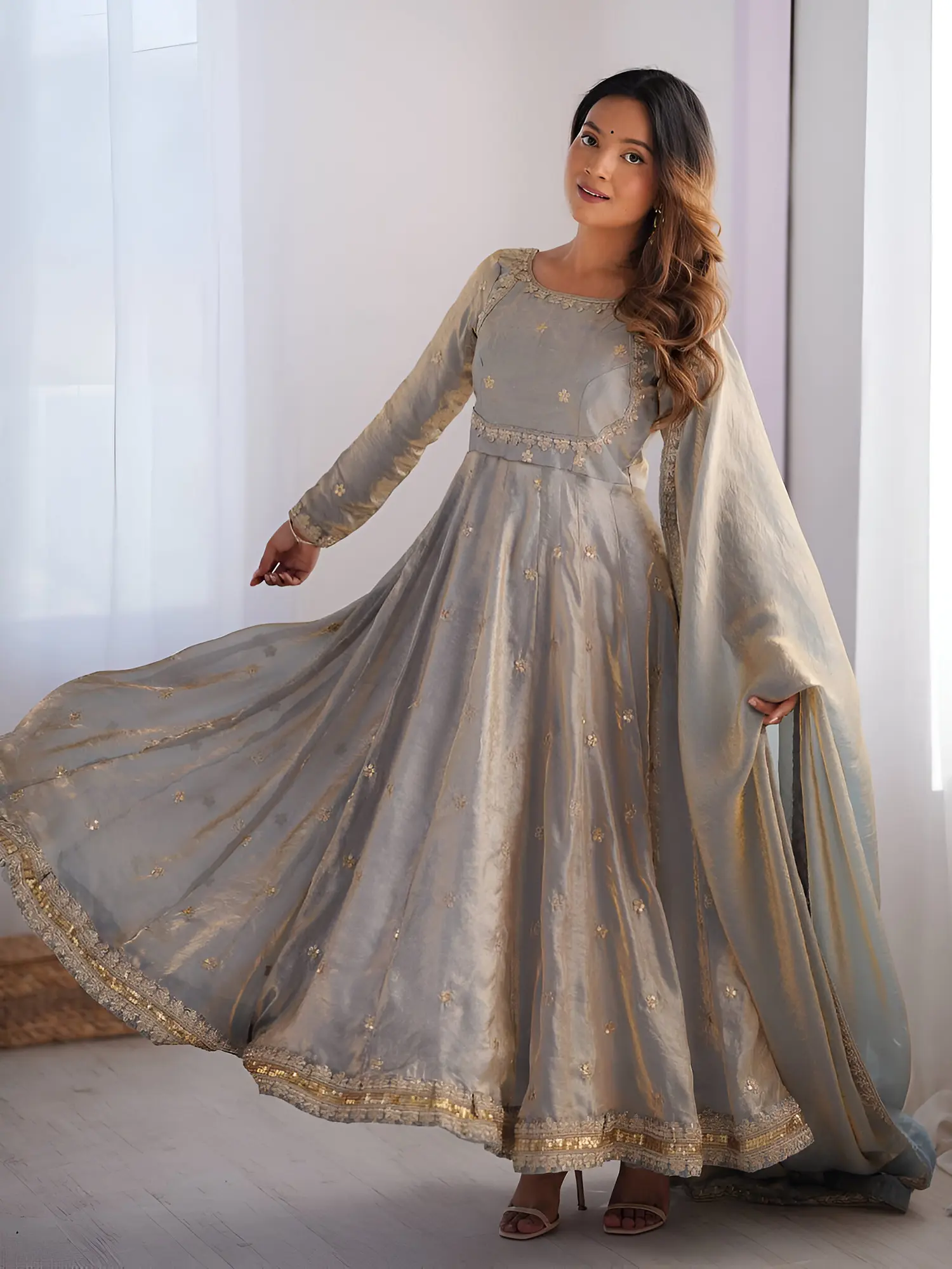 Long Churidar Salwar Kameez Suit with Zari-Embroidered Florals and Crystals