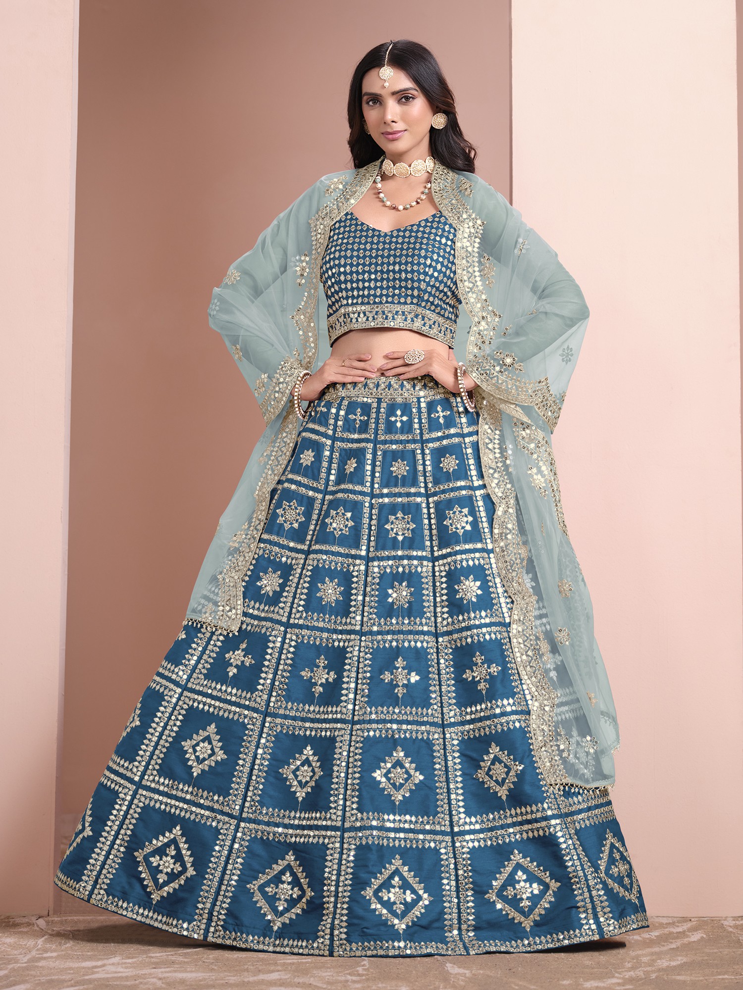 Teal Taffeta Silk Beautiful Floral Zari Embroidery Lehenga Choli with Beige Sheer Dupatta