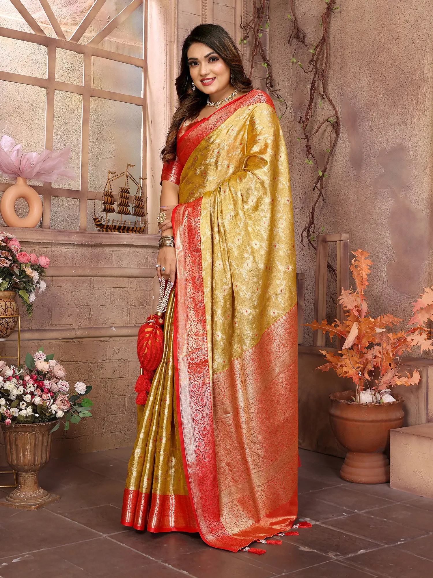 Pure Chiffon Golden-Haze Banarasi Saree with Unstitched Blouse | Handloom Zari Woven