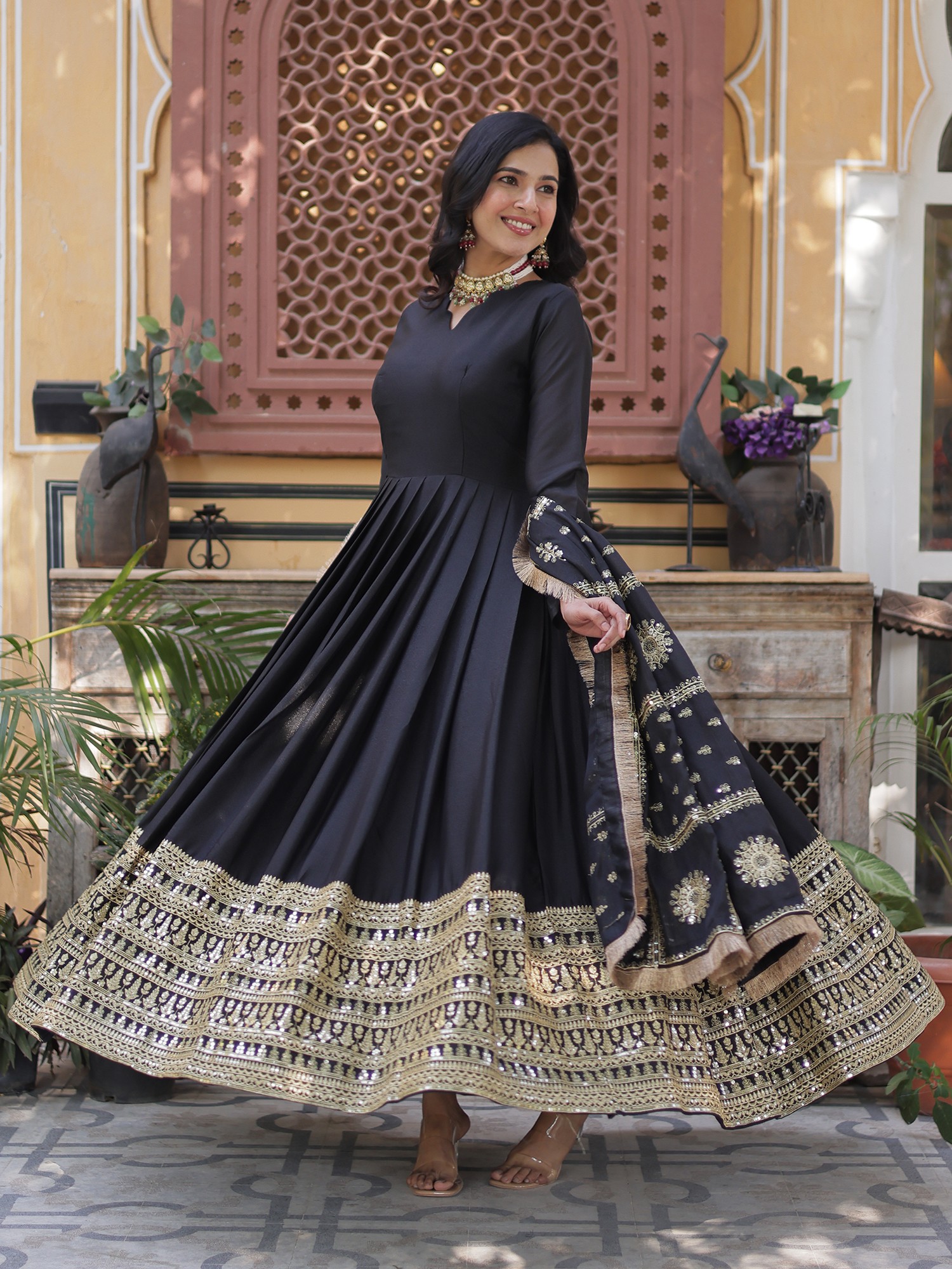 The accompanying dupatta is not merely an accessory but an integral part of the design, completing the look with a harmonious blend of elegance and tradition. The thoughtful combination of the sleek black gown and the heavily embellished dupatta creates a balanced yet striking aesthetic. This ensemble is designed for the modern woman who appreciates the beauty of handcrafted detail and desires to make a sophisticated statement at every special event. It promises to be a cherished addition to your ethnic wear collection, ready to be worn for years to come for your most memorable moments.
