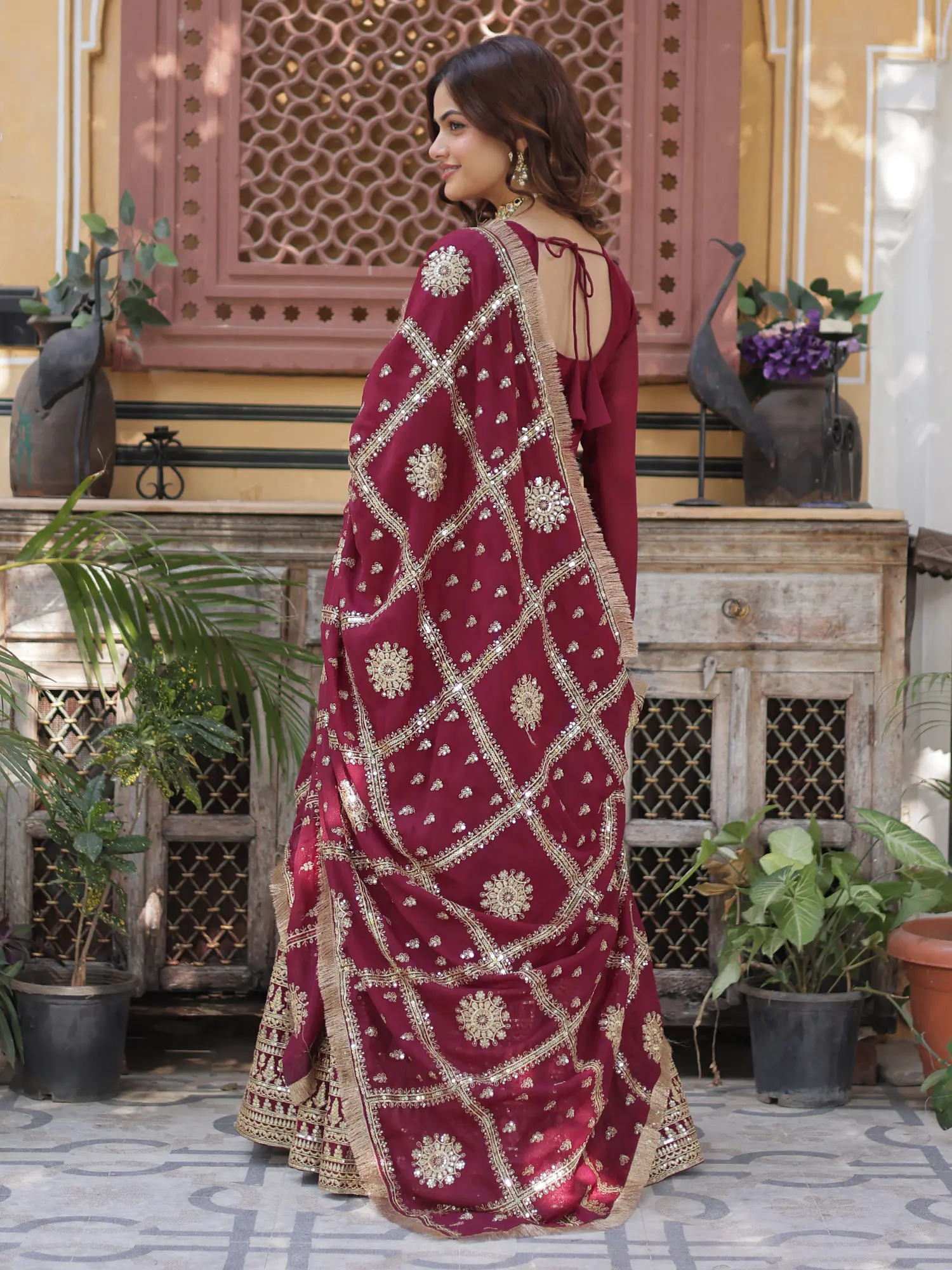 The true magic of this ensemble lies in its opulent detailing. The hemline of the gown is adorned with a breathtaking band of heavy embroidery, intricately woven with shimmering zari threads and sparkling sequins. This rich tapestry of design cascades upwards, creating a striking visual impact. The same lavish embroidery graces the meticulously crafted dupatta, transforming it into a statement accessory. The dupatta features a striking diamond-shaped pattern, with each section filled with floral motifs and geometric designs, all brought to life with the radiant gleam of zari and sequins. Delicate, shimmering tassels fringe the edges of both the gown and the dupatta, adding a playful yet elegant touch.